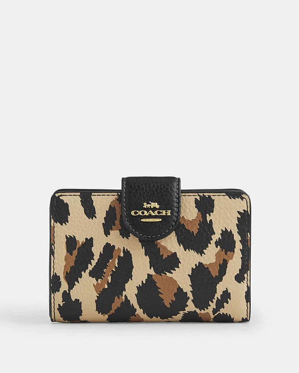 Coach Medium Corner Zip Wallet With Leopard Print Pebbled Leather-Gold-Leopard Multi