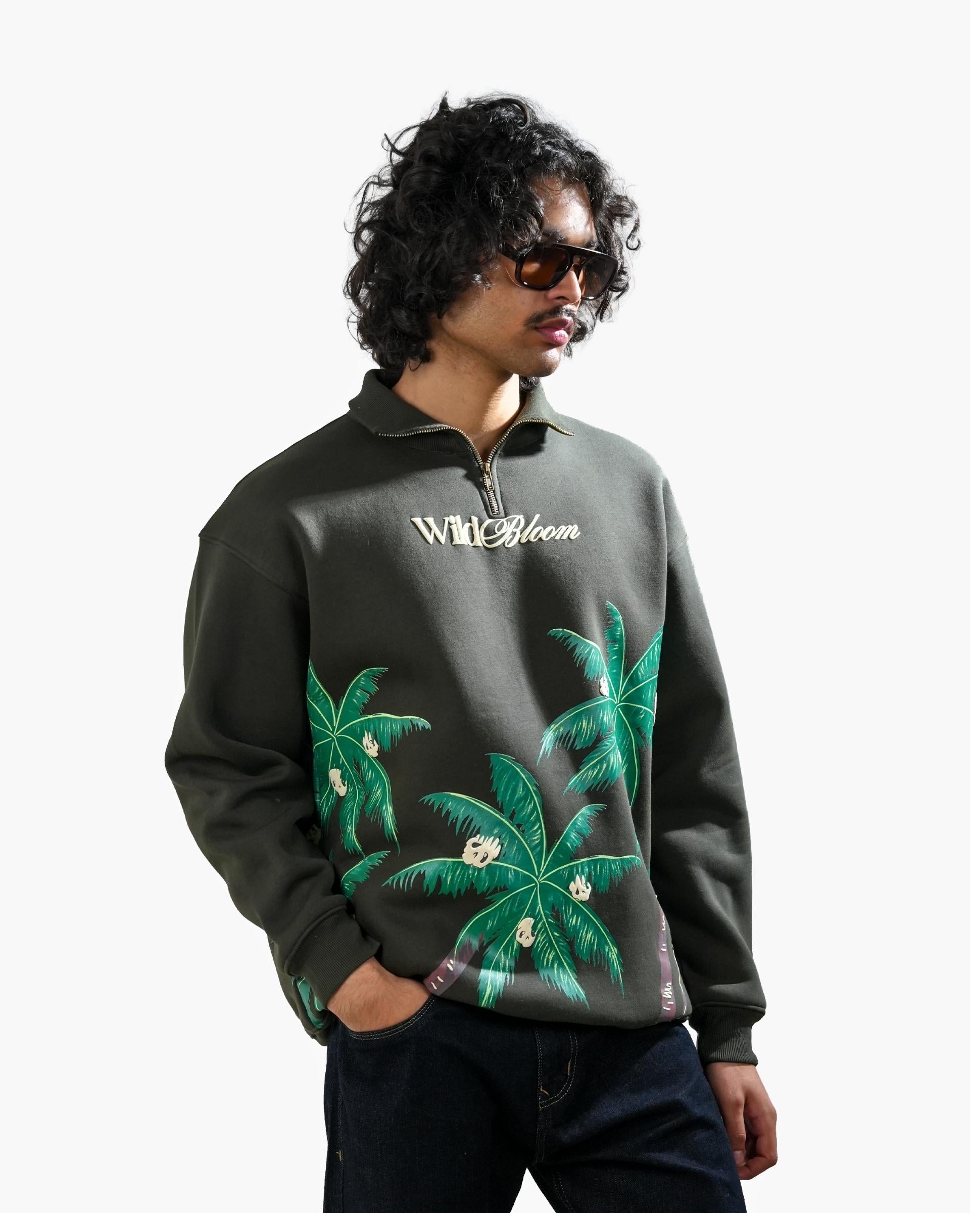 Wild Bloom - Olive Oversized Printed Quarter Zip Sweatshirt