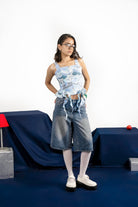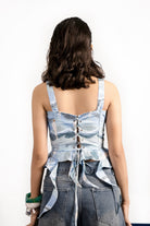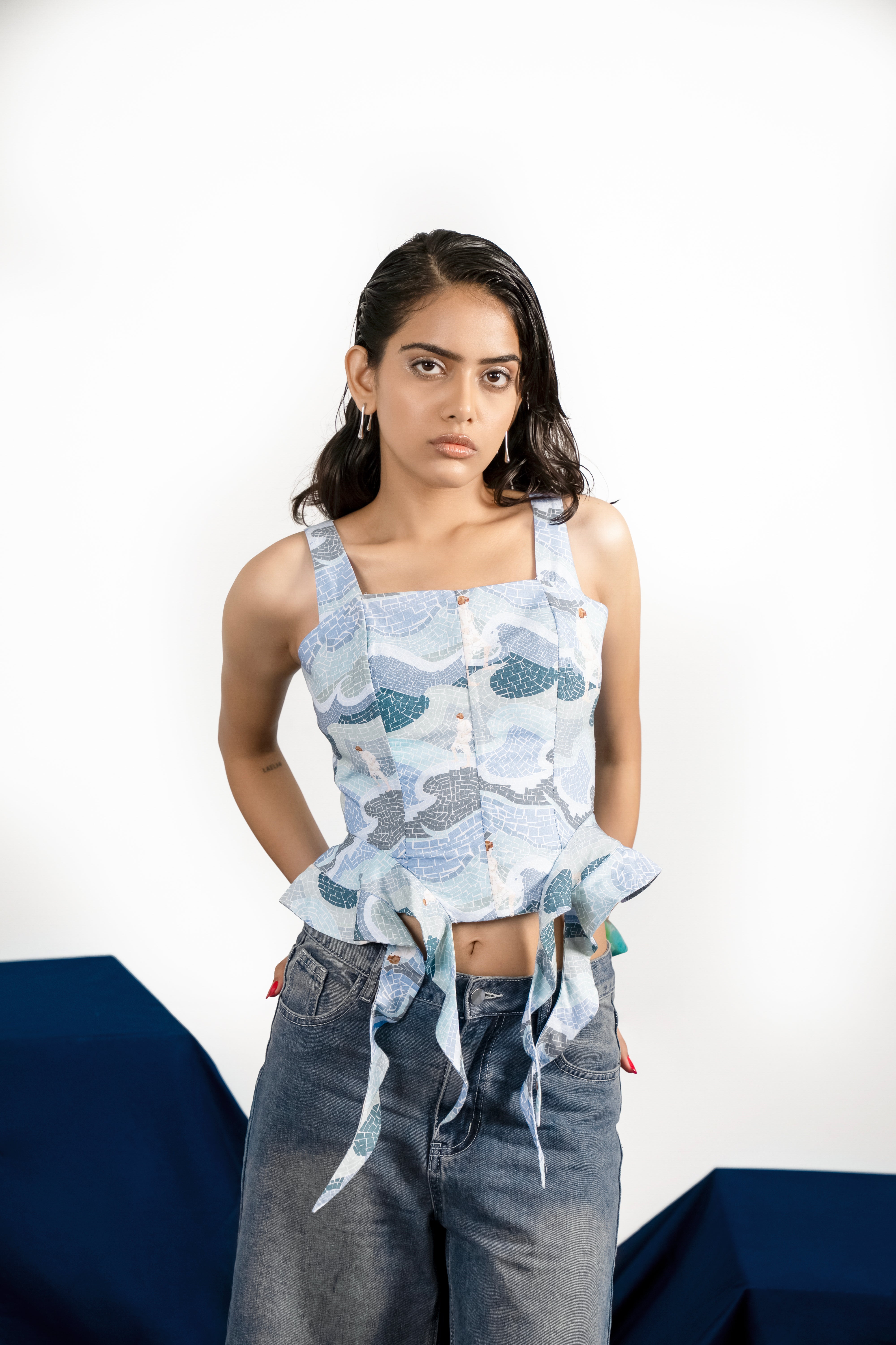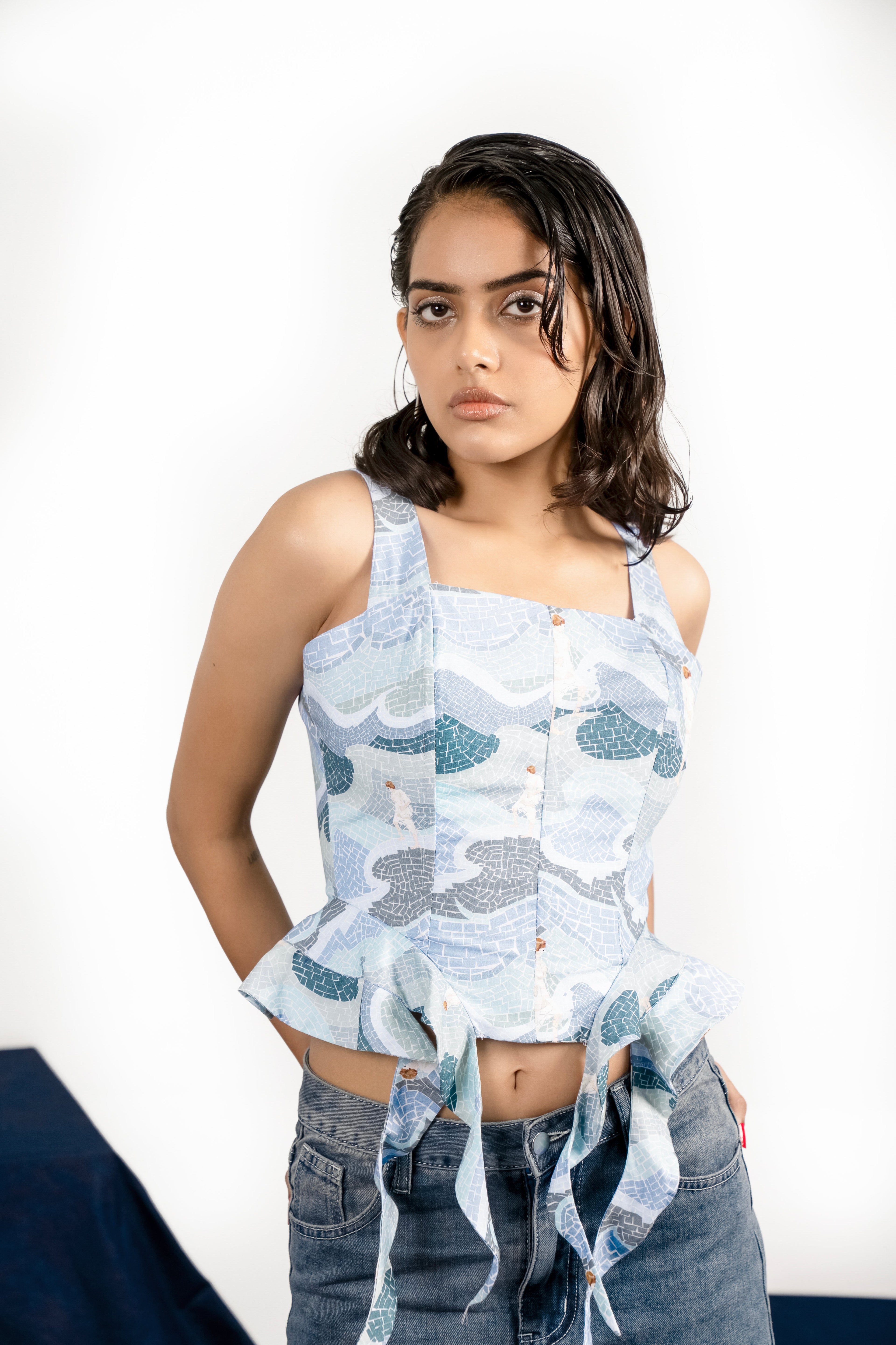Made in a Thwnwhn original “ Against the tide” print inspired from our everyday struggles and the will to remain strong. The corset is constructed with precise panels and boning inserts that sculpt the body and give it a seamless shape. Thick broad straps form a part of the top. Asymmetric ruffles attached on sides to give it a delicate look. Drawstring closure at the back. Fully lined for a smooth finish.