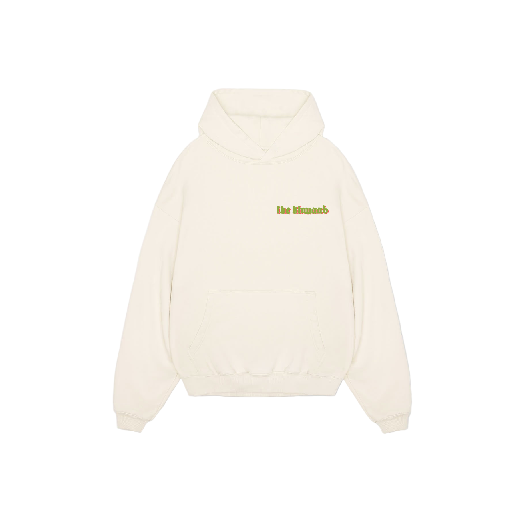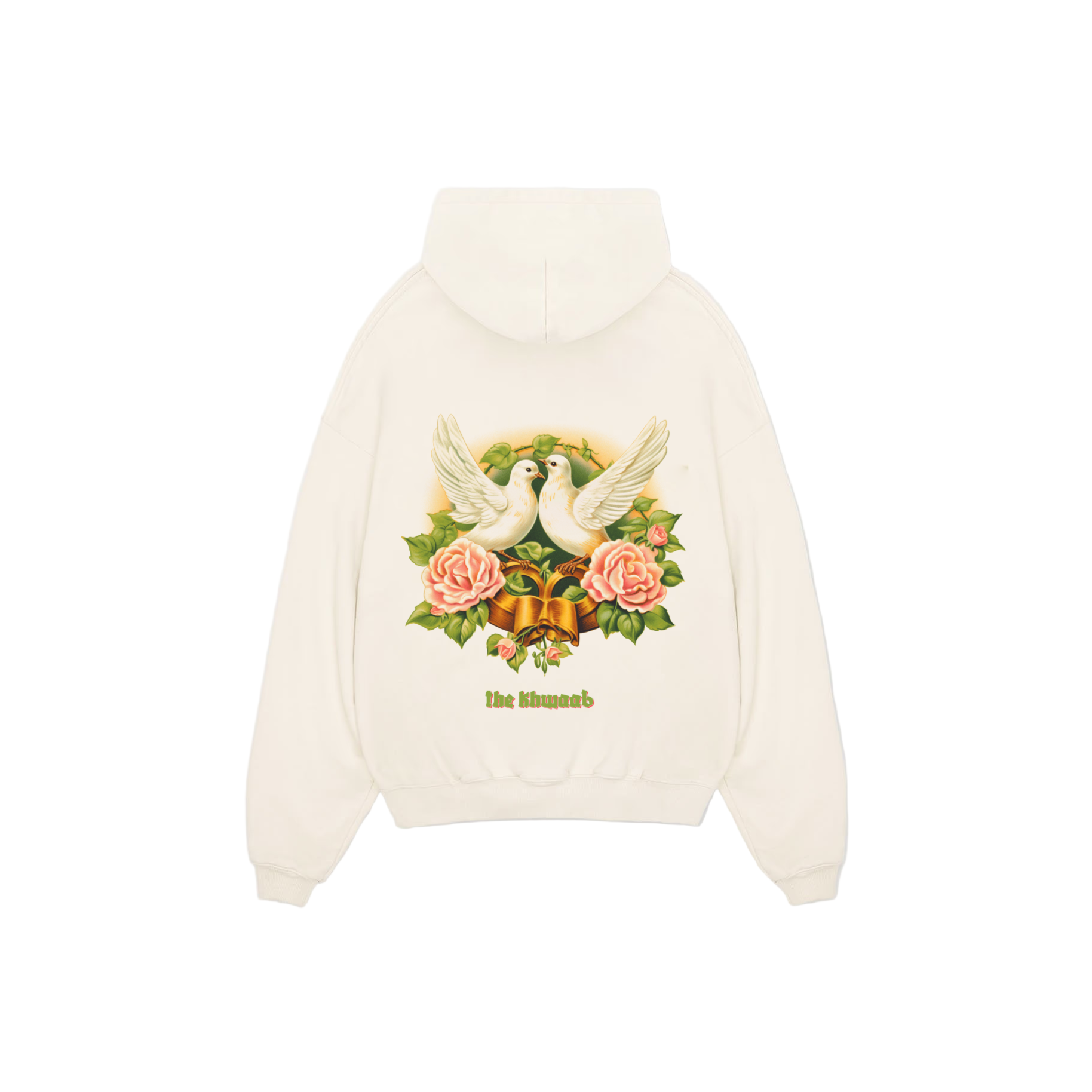 Full sleeves hoodie in buttercream mid weight cotton fleece with the khwaab script at the front and feathered amour graphic at the back. Relaxed fit
