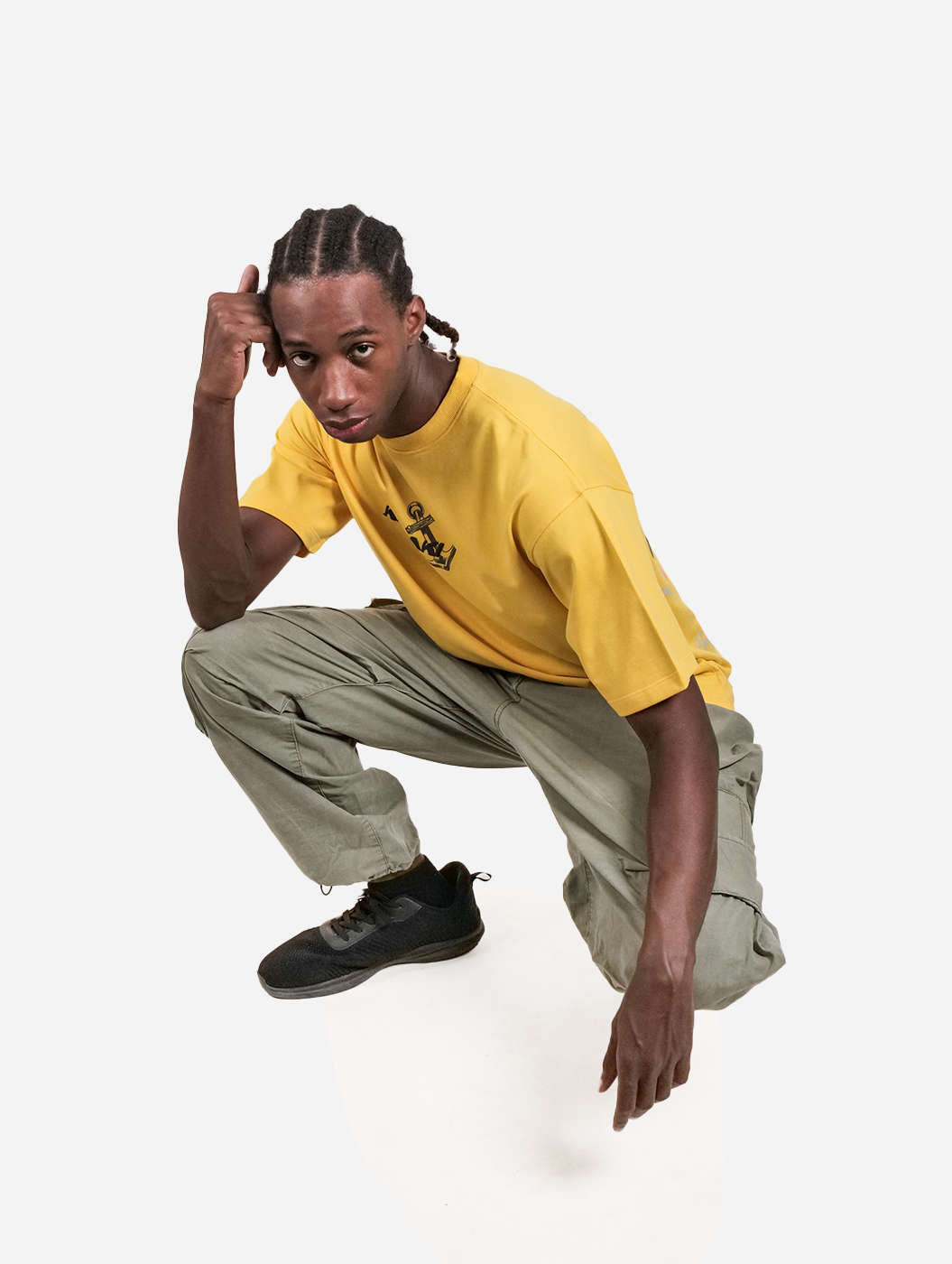 Anchor our classic oversized round-neck T-shirt, crafted with high-quality loop knit terry for softness and durability. The blend maintains its shape and comfort, enhanced by a double silicone wash for a smooth, luxe feel. Featuring a bold puff screen print, this versatile piece pairs effortlessly with denim or cargo pants, ready for casual days or nights out.
