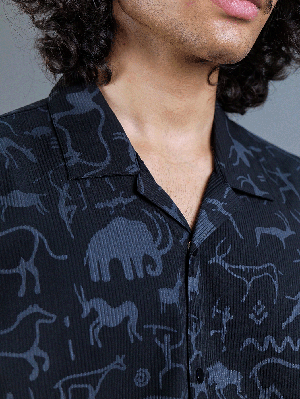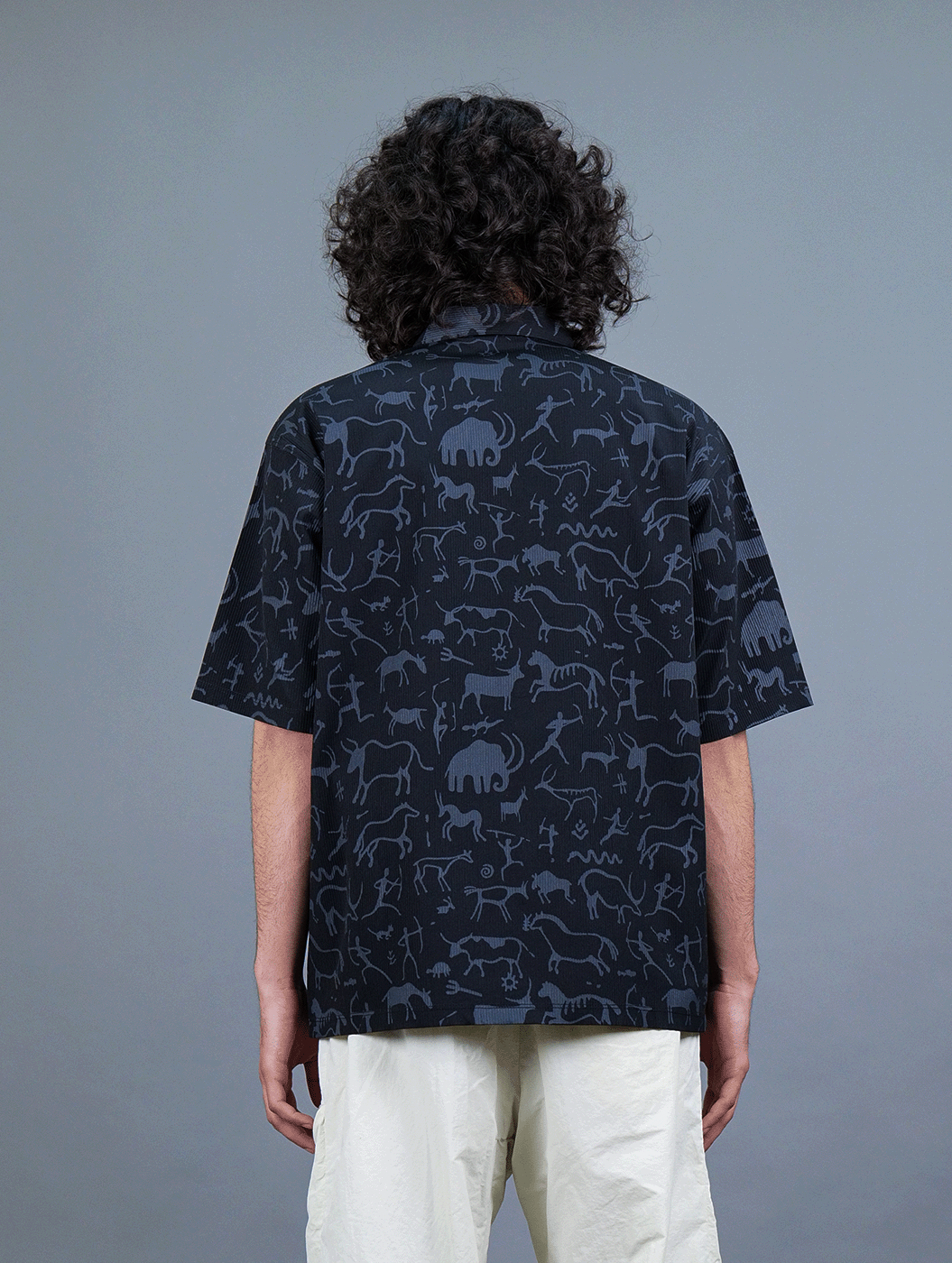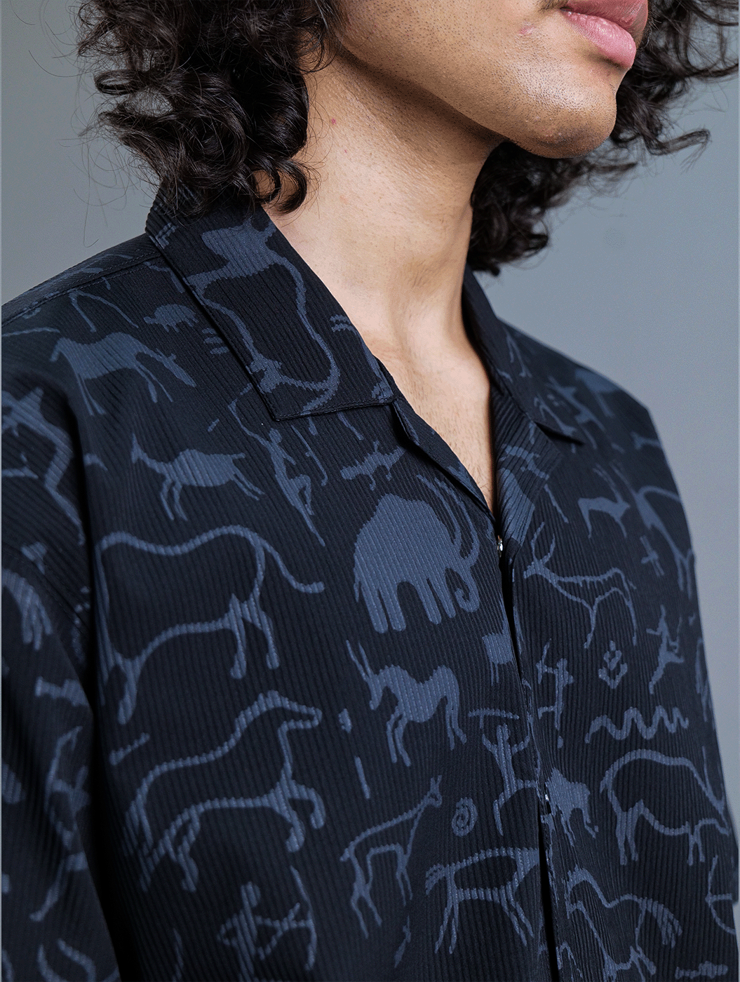Featuring an oversized black Cuban-collared shirt with an all-over print inspired by ancient period artwork, depicting elephants, horses, and other animals reminiscent of cave paintings. Crafted from premium textured fabric, this piece blends history with contemporary fashion, offering a unique and artistic appeal. The intricate details and earthy tones of the artwork add a raw, heritage-inspired aesthetic, making it a statement addition to any wardrobe. Designed for all genders, its relaxed fit and breathable material ensure both comfort and effortless style, perfect for casual outings or layered ensembles.