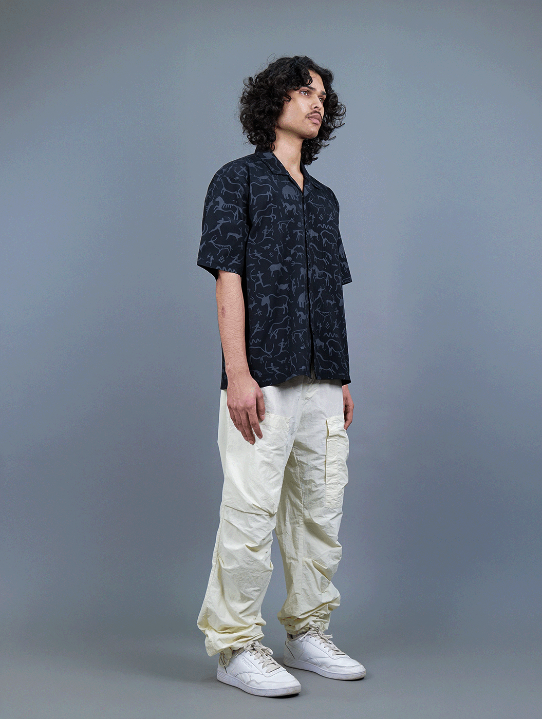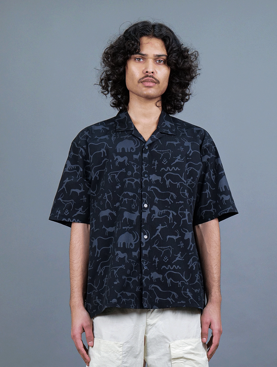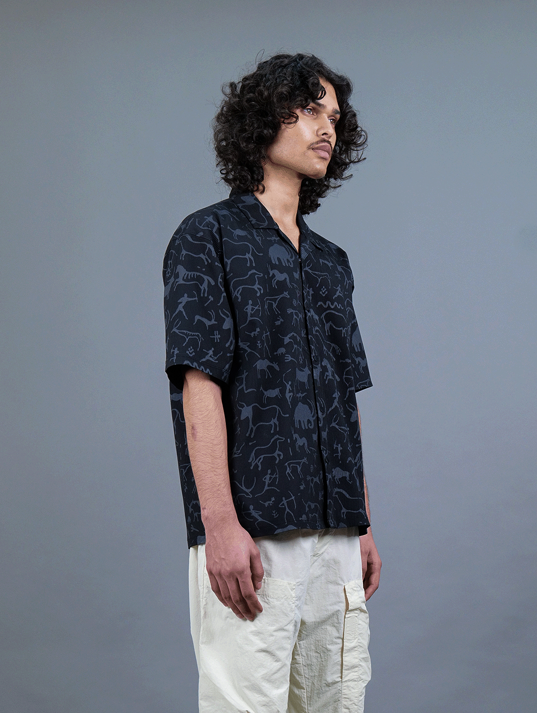 Featuring an oversized black Cuban-collared shirt with an all-over print inspired by ancient period artwork, depicting elephants, horses, and other animals reminiscent of cave paintings. Crafted from premium textured fabric, this piece blends history with contemporary fashion, offering a unique and artistic appeal. The intricate details and earthy tones of the artwork add a raw, heritage-inspired aesthetic, making it a statement addition to any wardrobe. Designed for all genders, its relaxed fit and breathable material ensure both comfort and effortless style, perfect for casual outings or layered ensembles.