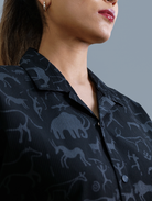 Featuring an oversized black Cuban-collared shirt with an all-over print inspired by ancient period artwork, depicting elephants, horses, and other animals reminiscent of cave paintings. Crafted from premium textured fabric, this piece blends history with contemporary fashion, offering a unique and artistic appeal. The intricate details and earthy tones of the artwork add a raw, heritage-inspired aesthetic, making it a statement addition to any wardrobe. Designed for all genders, its relaxed fit and breathable material ensure both comfort and effortless style, perfect for casual outings or layered ensembles.