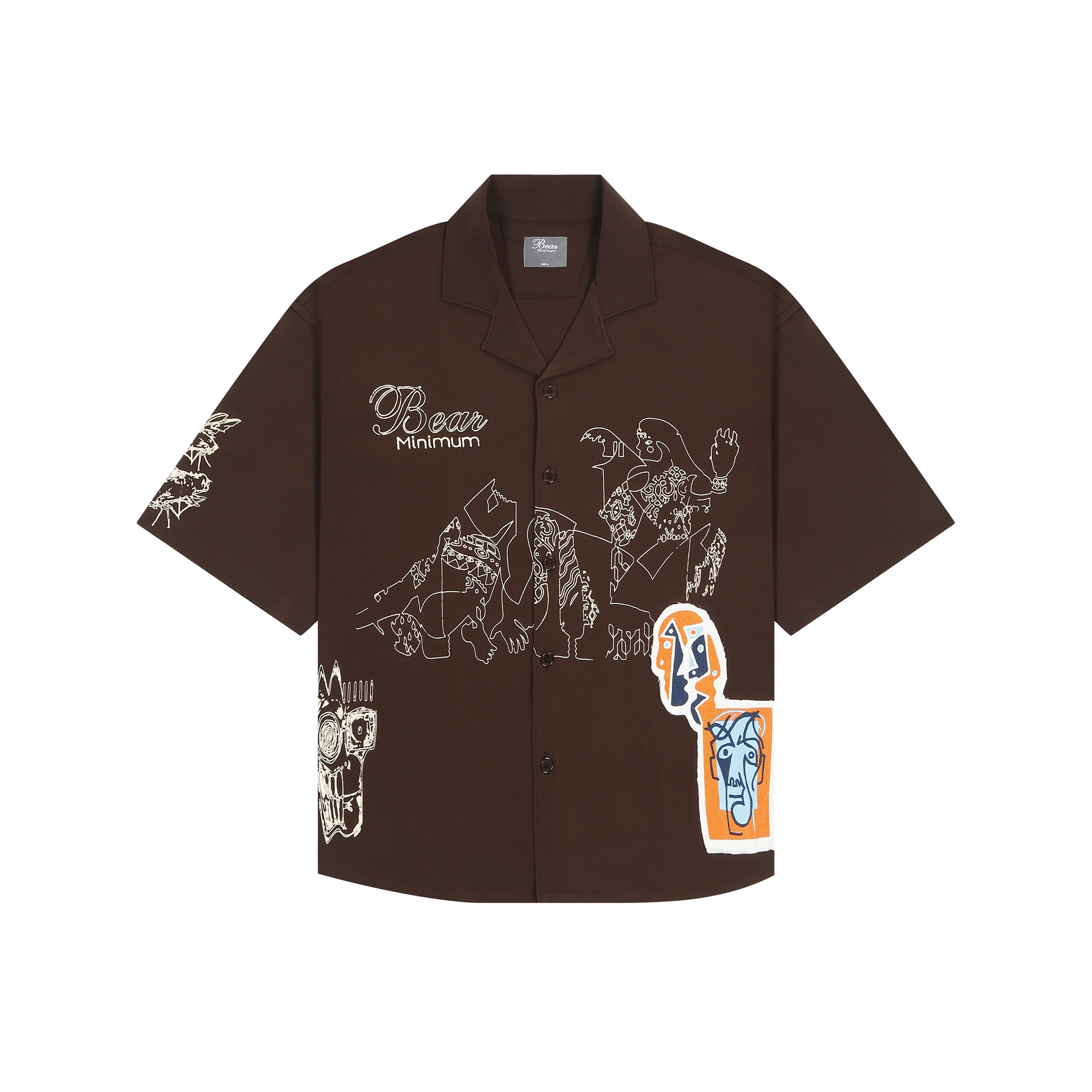 The main body showcases white prints on both sides depicting disfigured human faces, a commanding woman dominating a pet, and subtle “bear minimum” branding on the front, paired with the brand logo on the back for a enigmatic, heritage-infused vibe.
