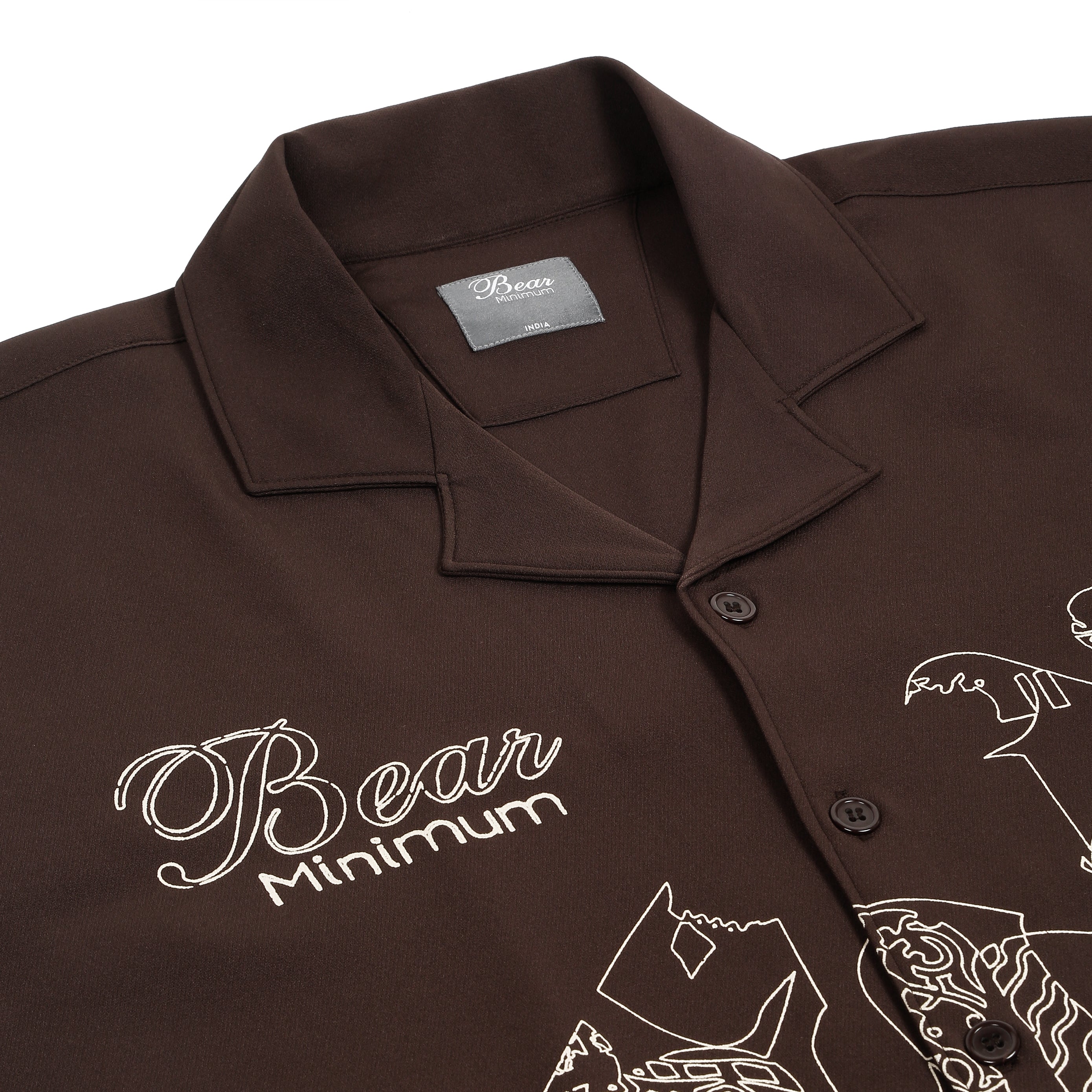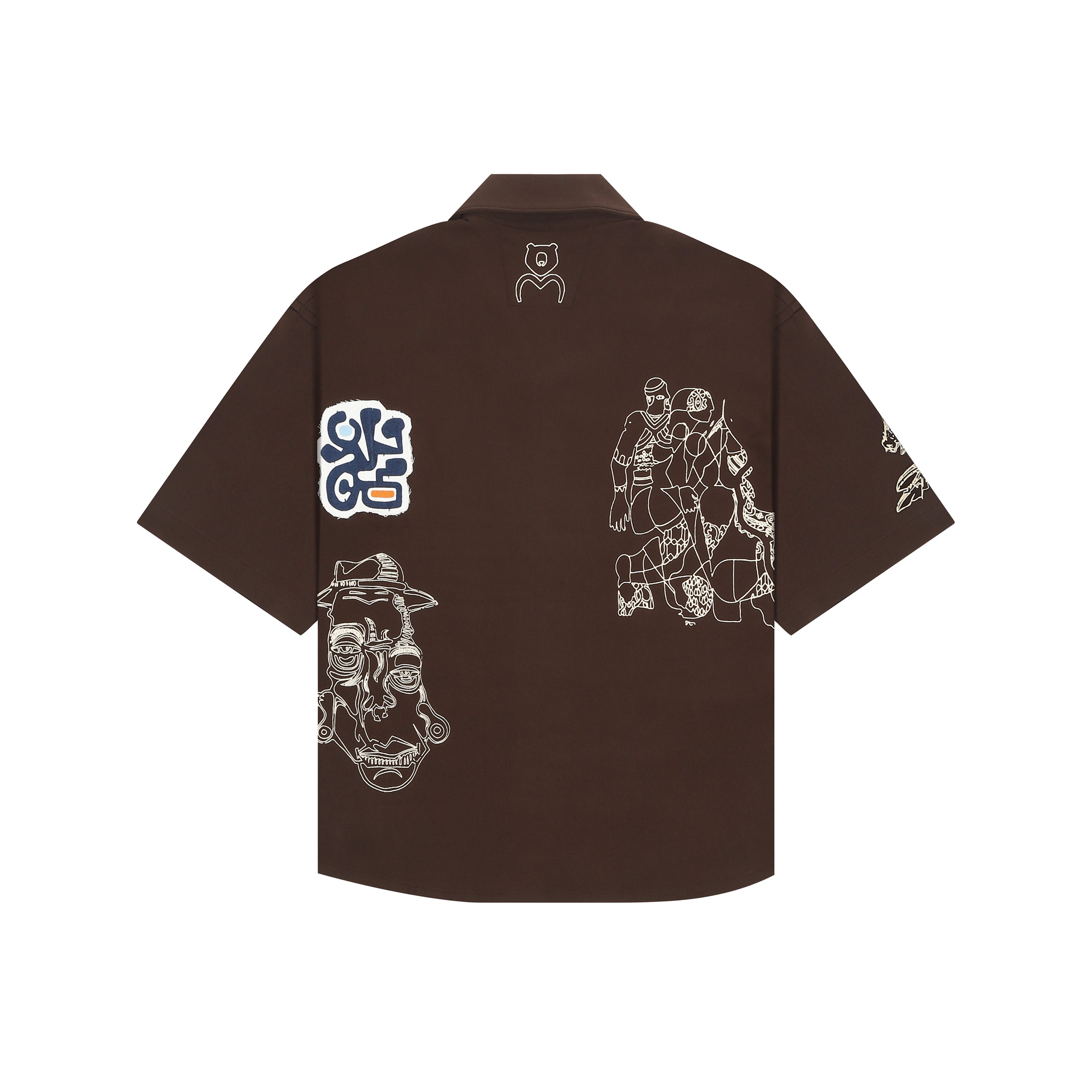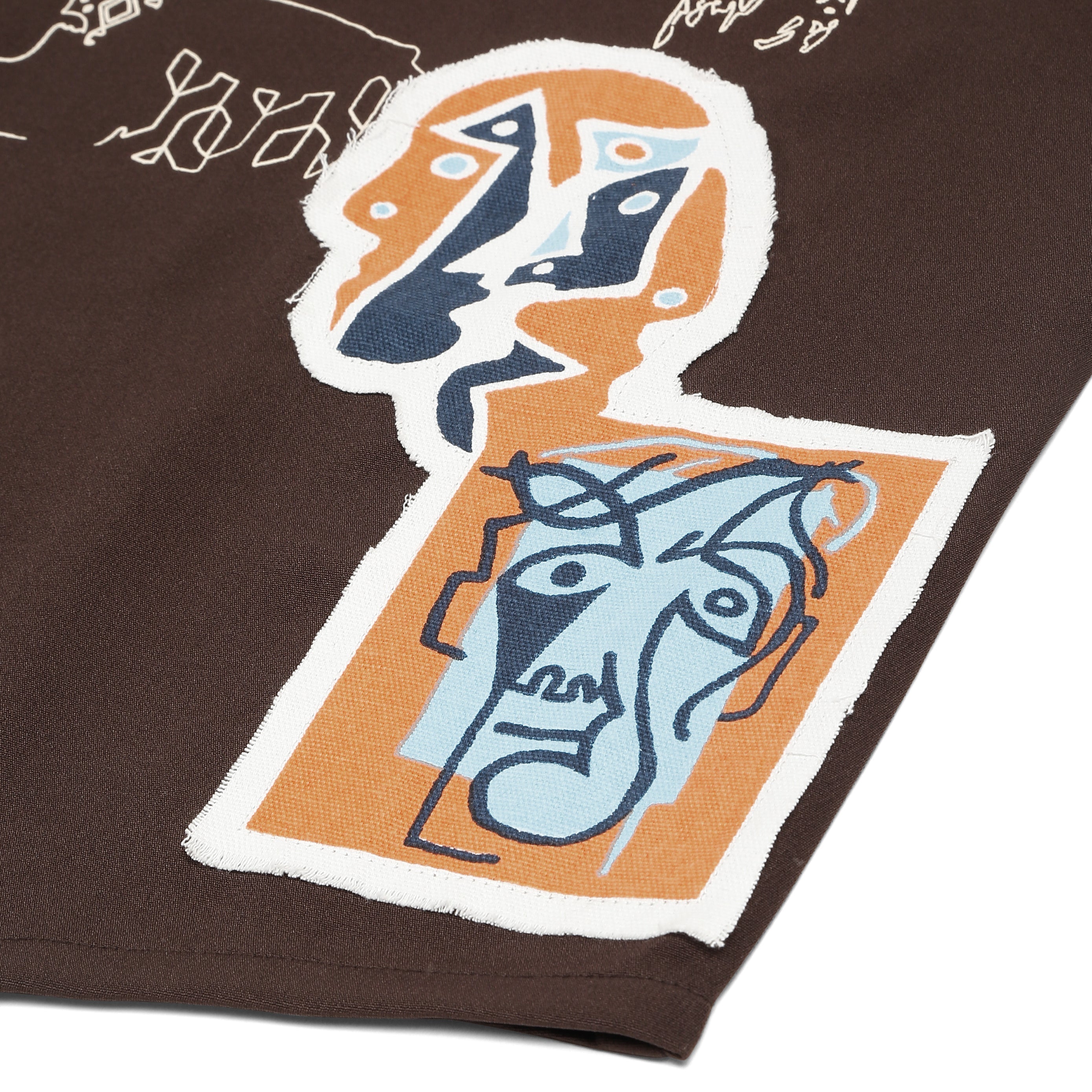 This half-sleeve shirt in rich brown 100% polyester Barbie fabric offers an ultra-soft feel with a stunning drape and fit. Inspired by ancient designs reimagined with a modern twist, it features two front patches in contrasting blue and maroon, plus a bold blue patch on the back.