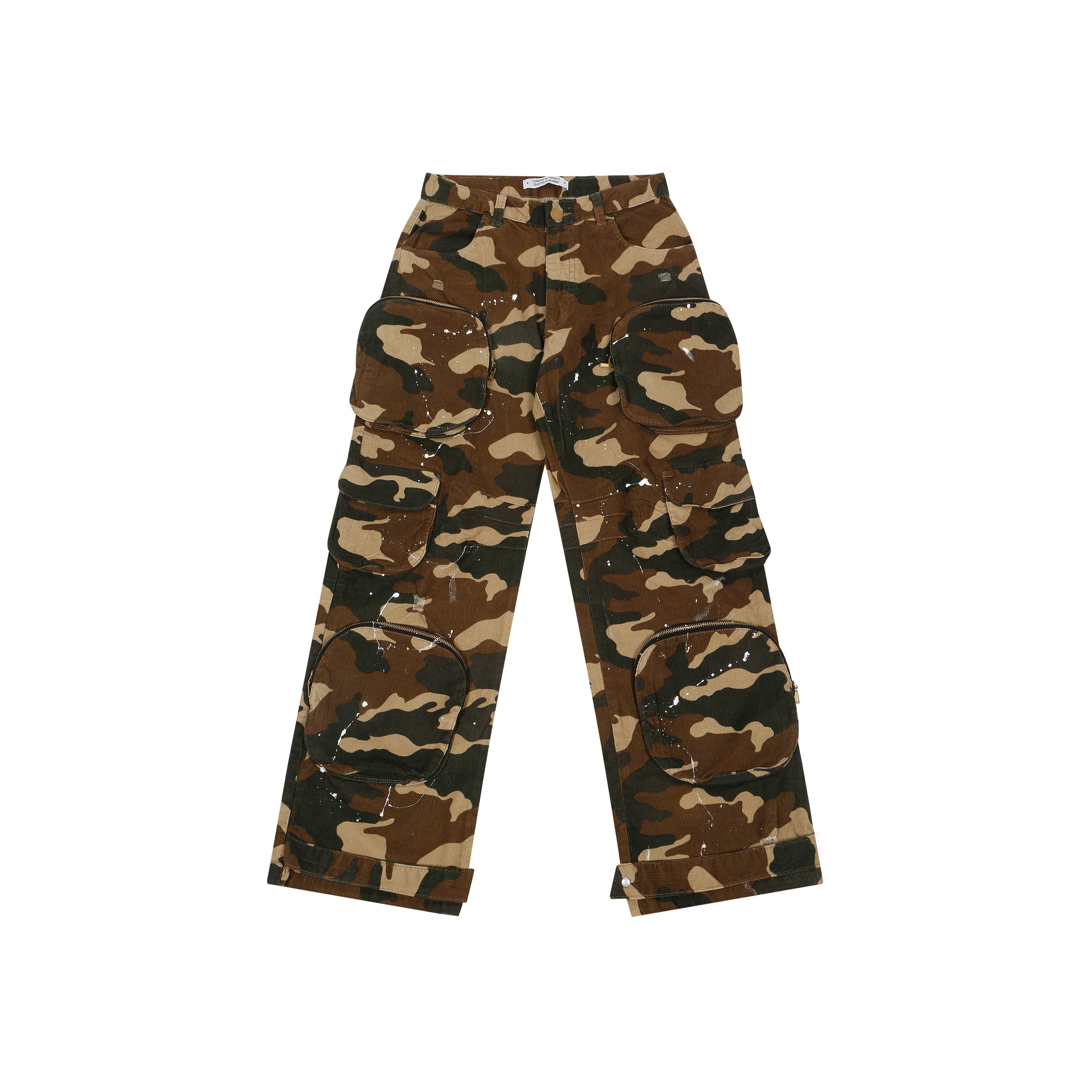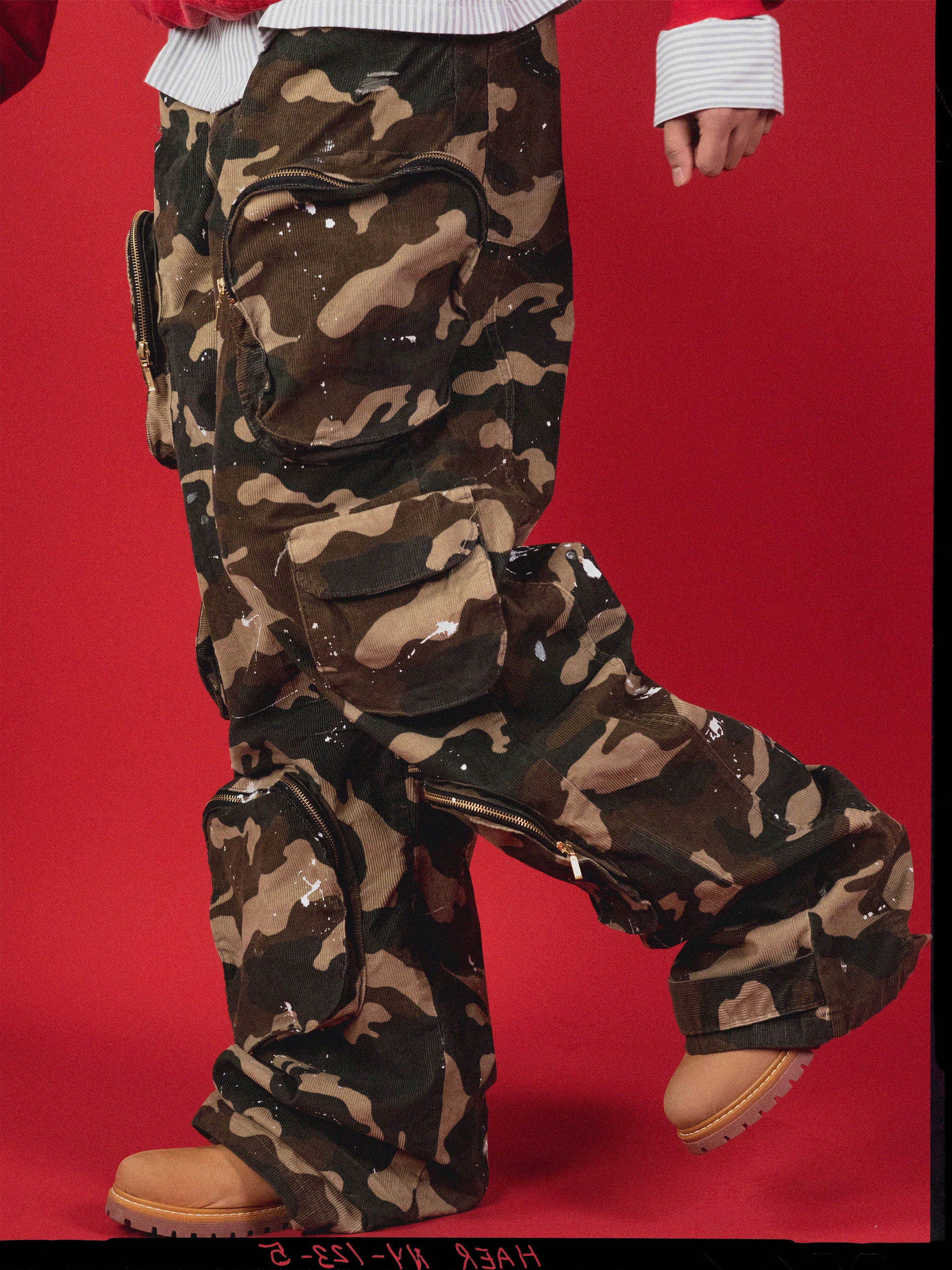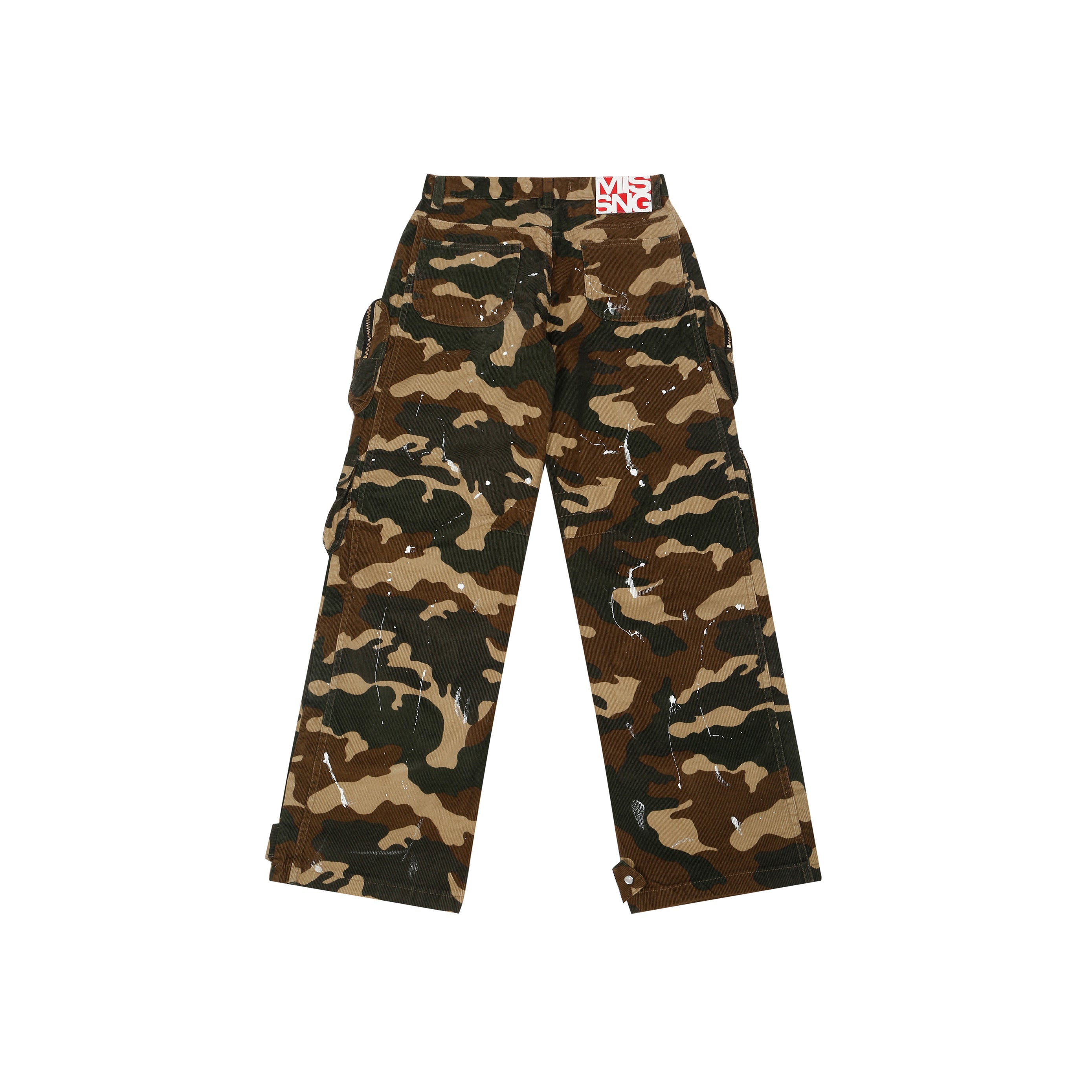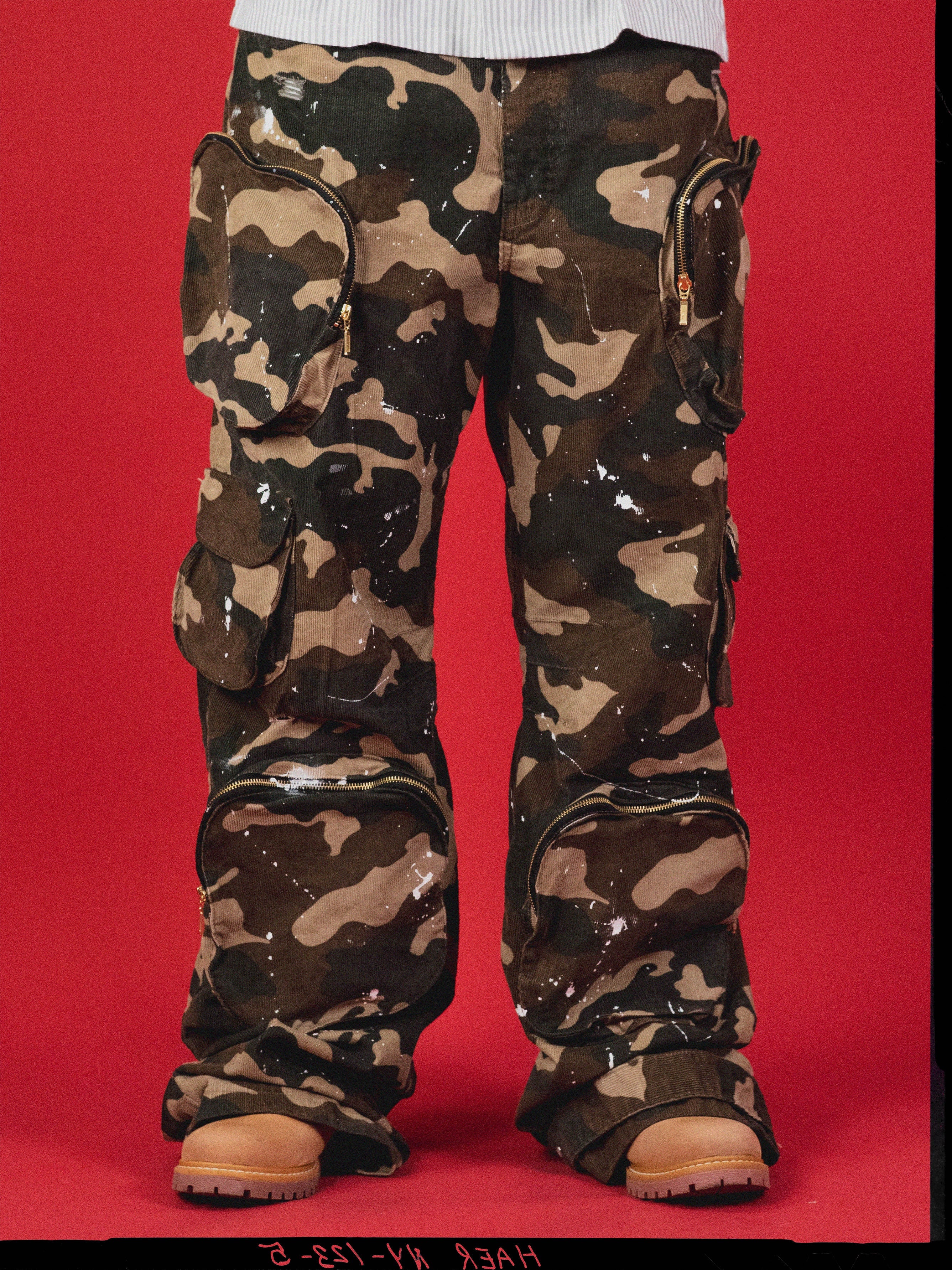 THE ARTILLERY PANTS PUSH MISSNG TILE’S SIGNATURE AESTHETIC TO THE FRONTLINES. HANDCRAFTED FROM PURE CORDUROY COTTON, EACH PAIR IS FINISHED WITH INTENTIONAL PAINT SPLATTERS AND DISTRESSING THAT GIVE THEM A WORN, WAR-TORN EDGE MAKING NO TWO UNITS THE SAME. OVERSIZED IN FIT, DETAILED WITH ORBITAL CARGO POCKETS, AND SIGNED WITH OUR MT DENIM TAG, THESE PANTS BALANCE CHAOS AND PRECISION, BUILT FOR THOSE WHO MOVE DIFFERENT.