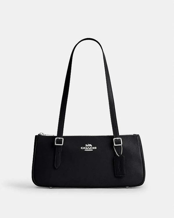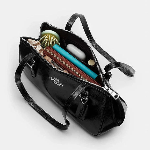 The Coach Asher Shoulder Bag in glazed leather combines sleek silver and black tones for a sophisticated, modern look. Crafted with a smooth, polished finish, this bag features a structured silhouette complemented by an adjustable shoulder strap for versatile wear. Its spacious interior and secure closure provide practical organization, making it an ideal choice for daily use or special occasions. Expertly designed, the Asher shoulder bag blends timeless elegance with contemporary functionality.