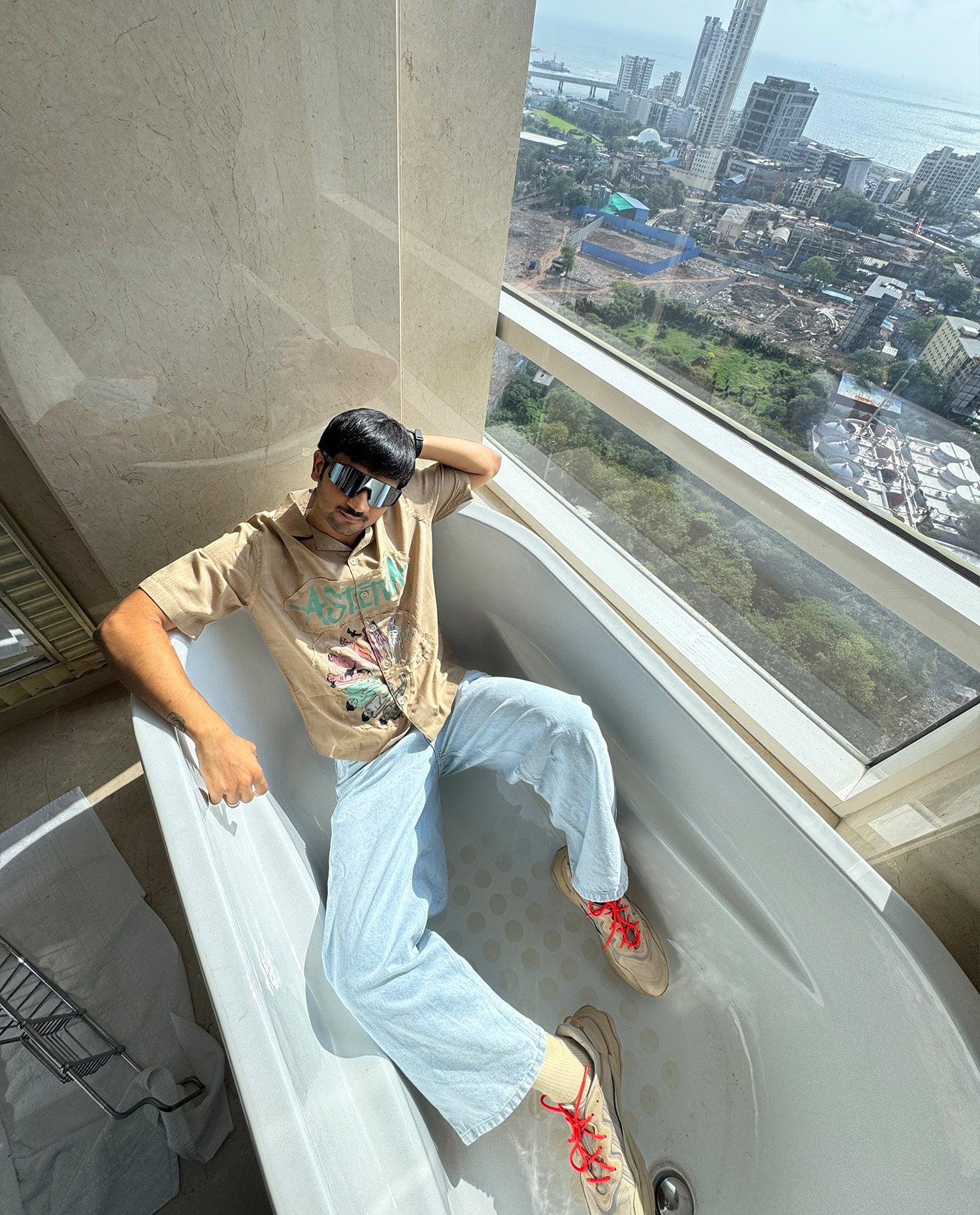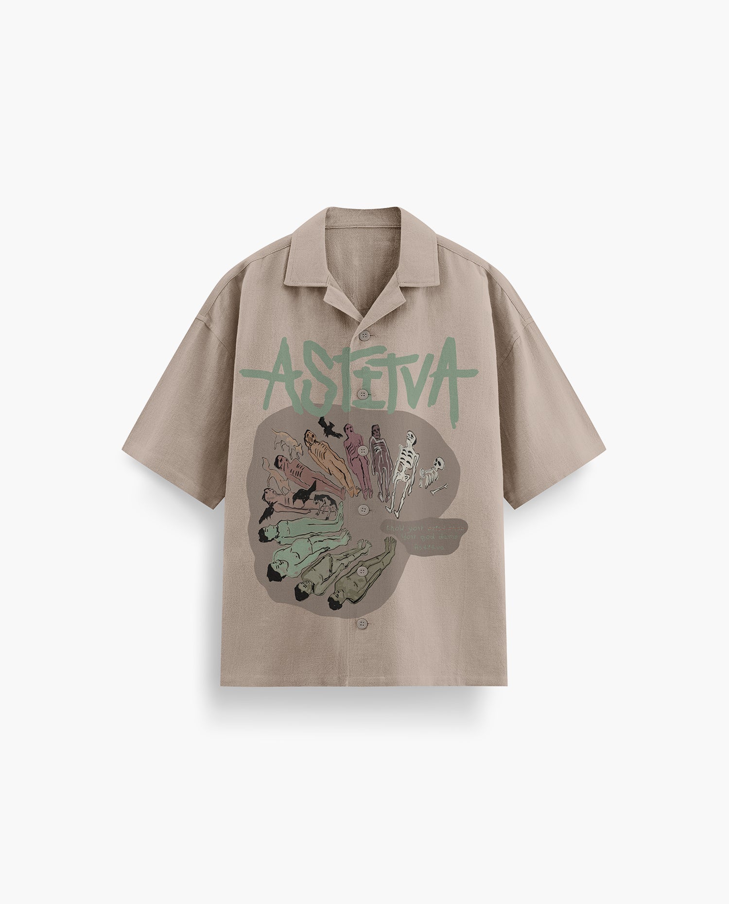 Crafted in a soft taupe base, the shirt features a relaxed fit and clean finish. The contrast of conceptual art with minimal design makes it both expressive and understated — a wearable reminder of who we are, and what we’re becoming.