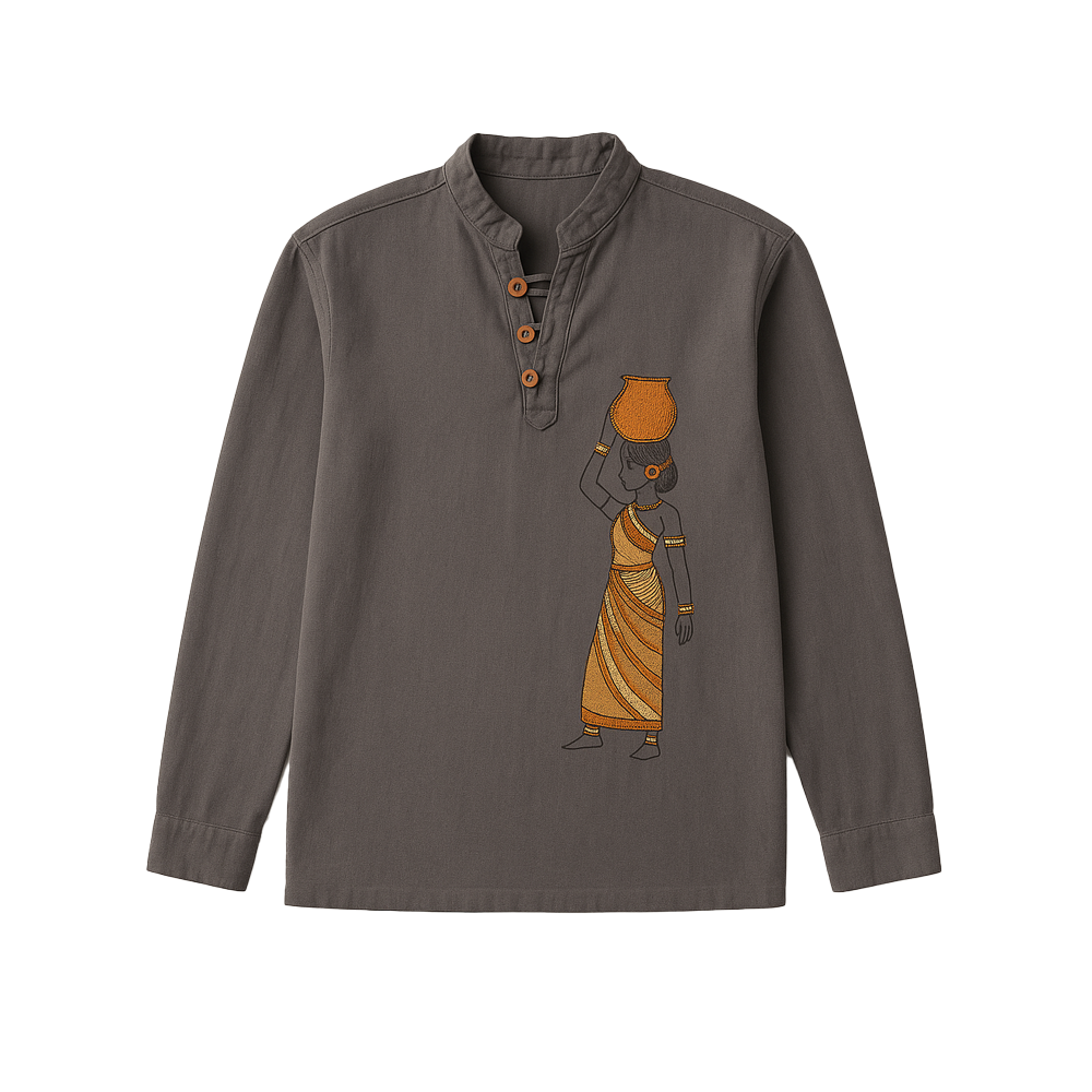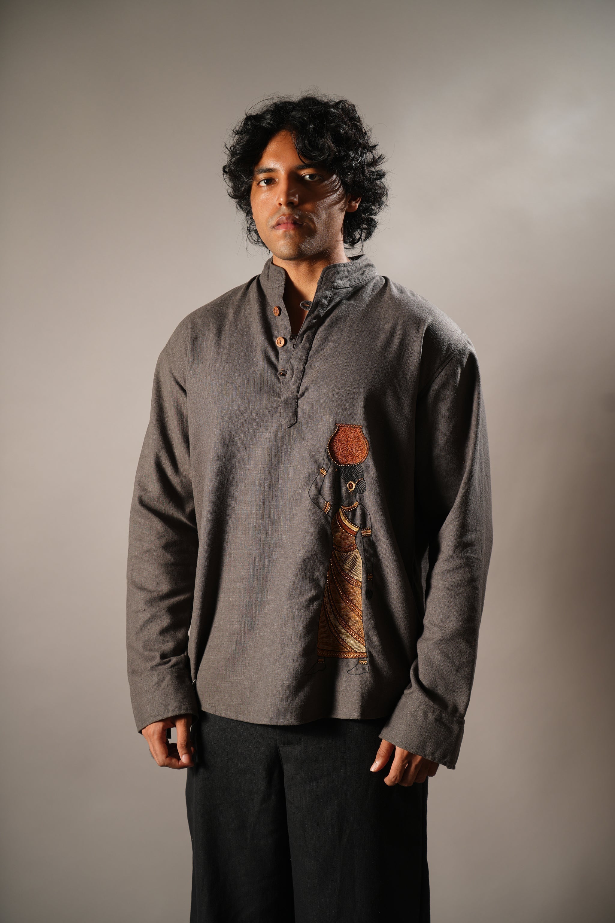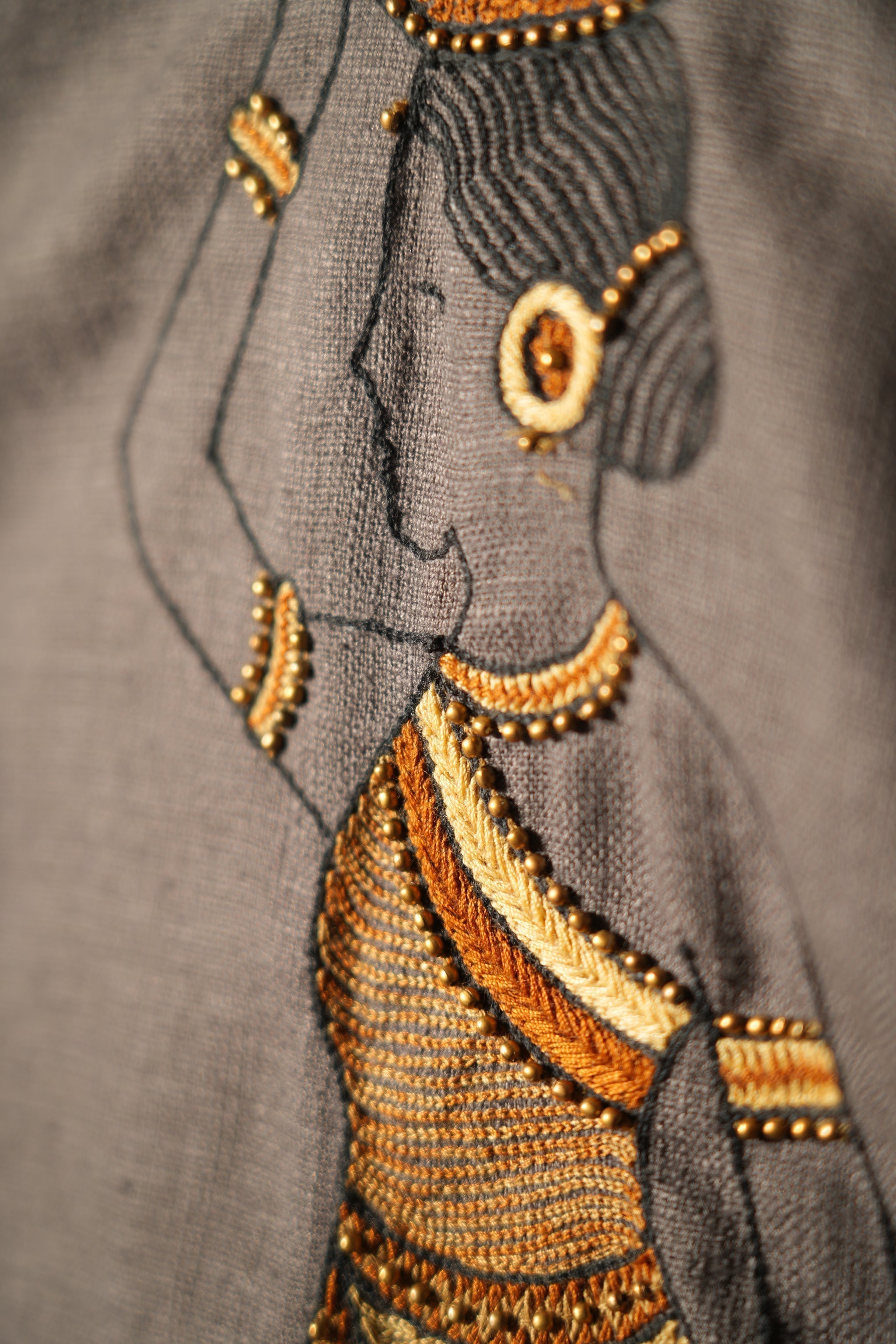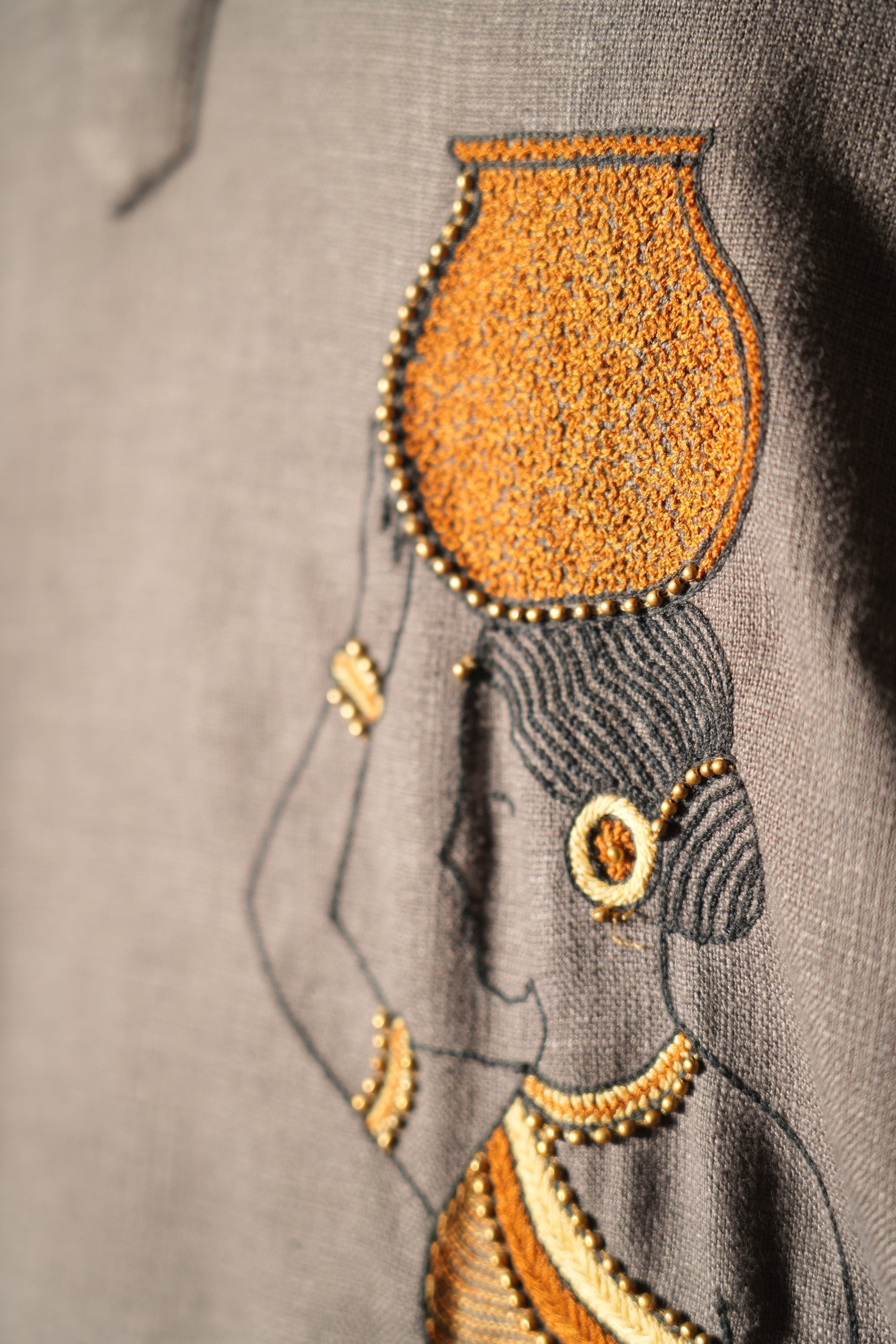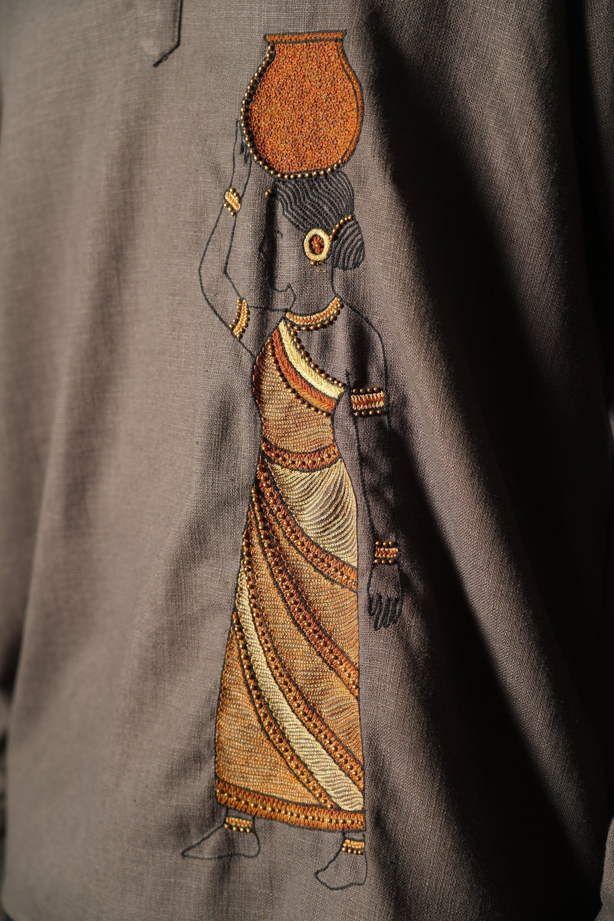 Design - Grey Aunty Kurta featuring intricate hand embroidery of a traditional Indian woman, inspired by a painting at the founder’s home, brought to life with textured thread work and Beaded details.