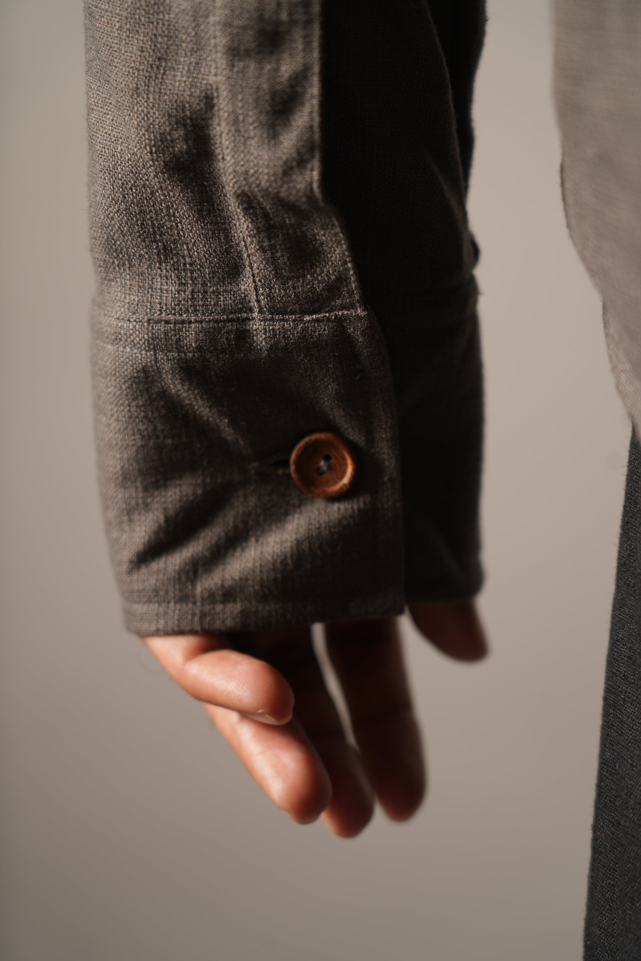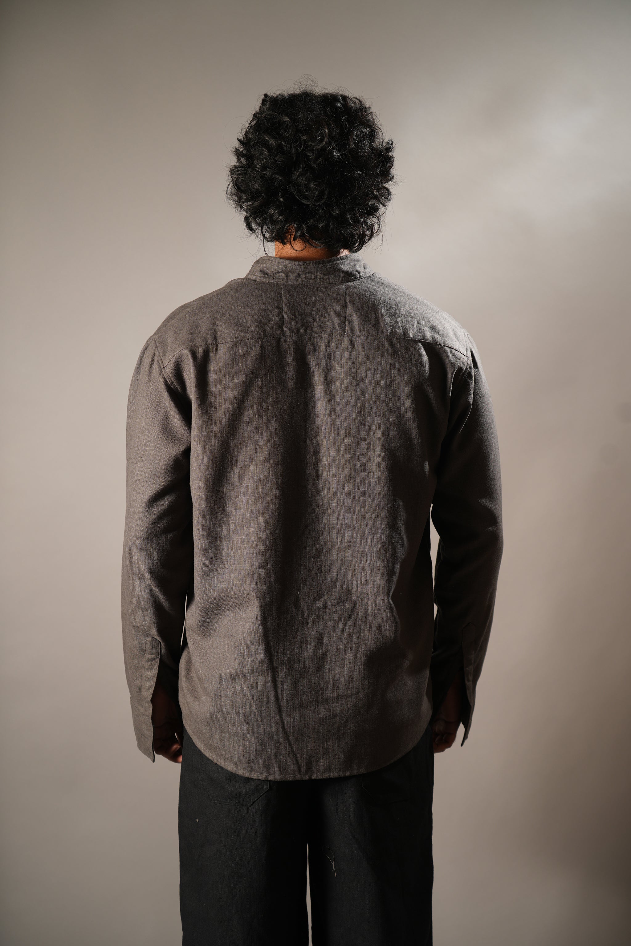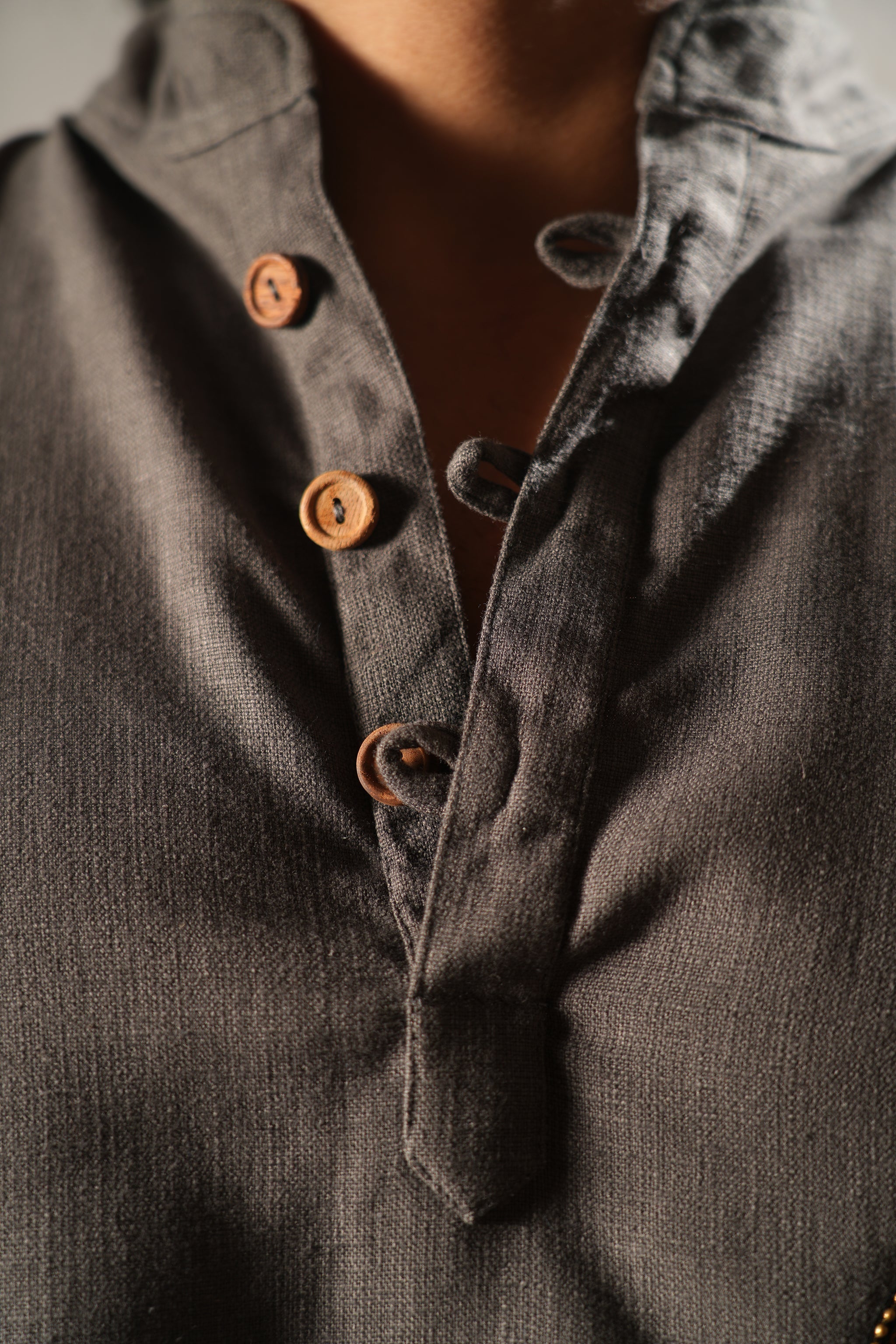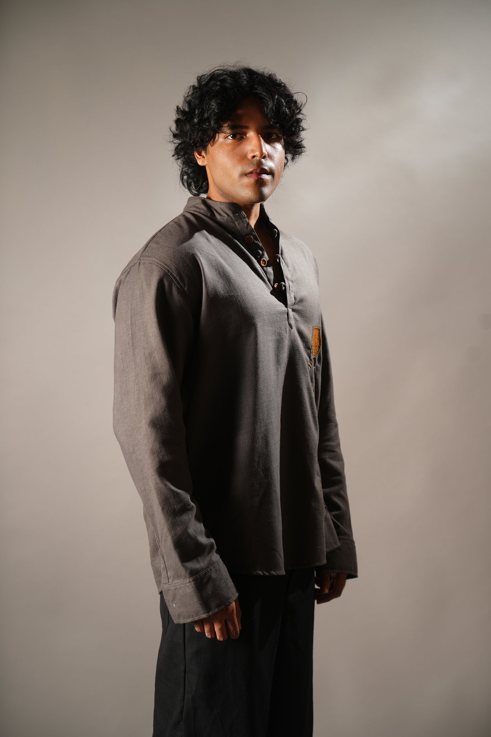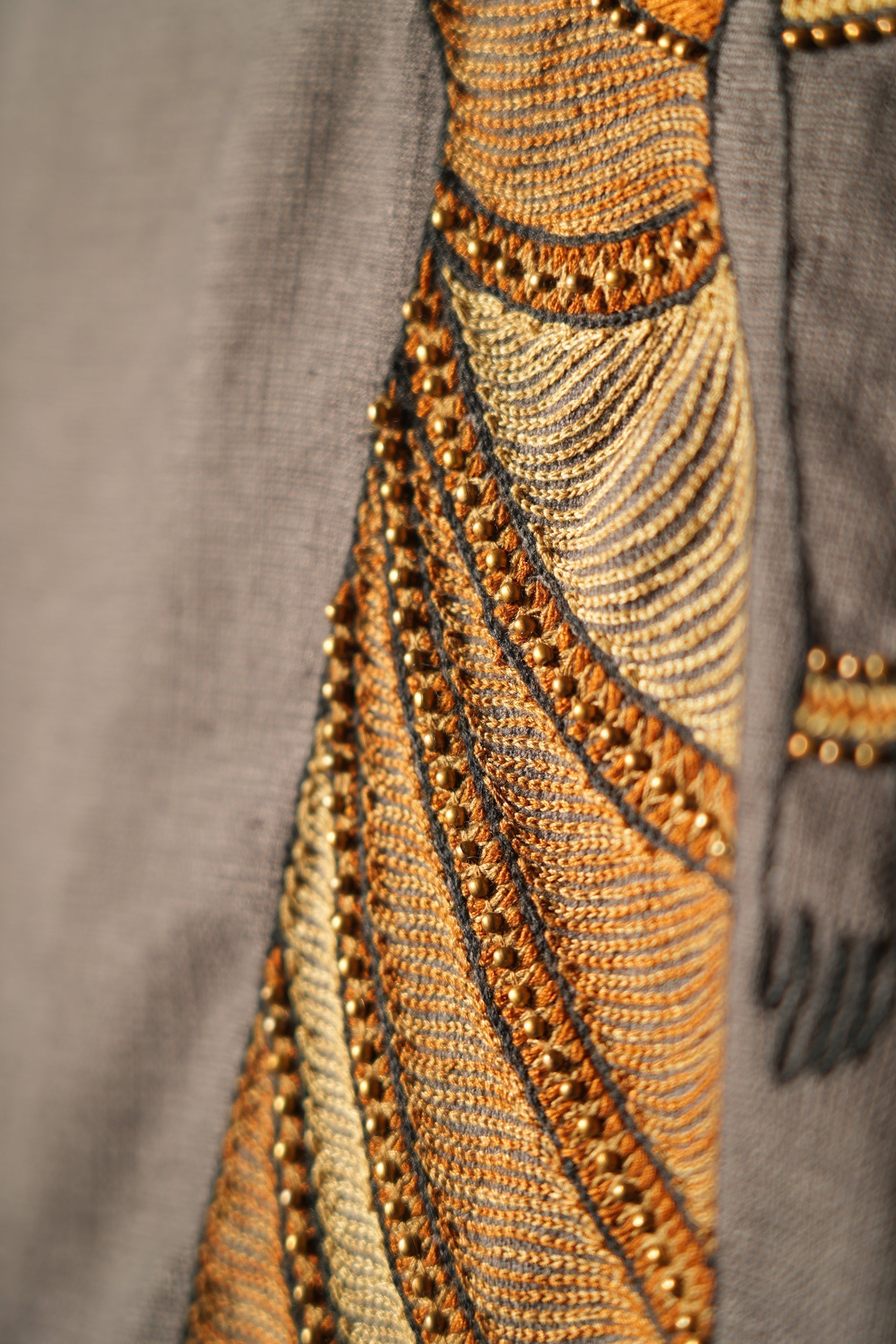 Design - Grey Aunty Kurta featuring intricate hand embroidery of a traditional Indian woman, inspired by a painting at the founder’s home, brought to life with textured thread work and Beaded details.