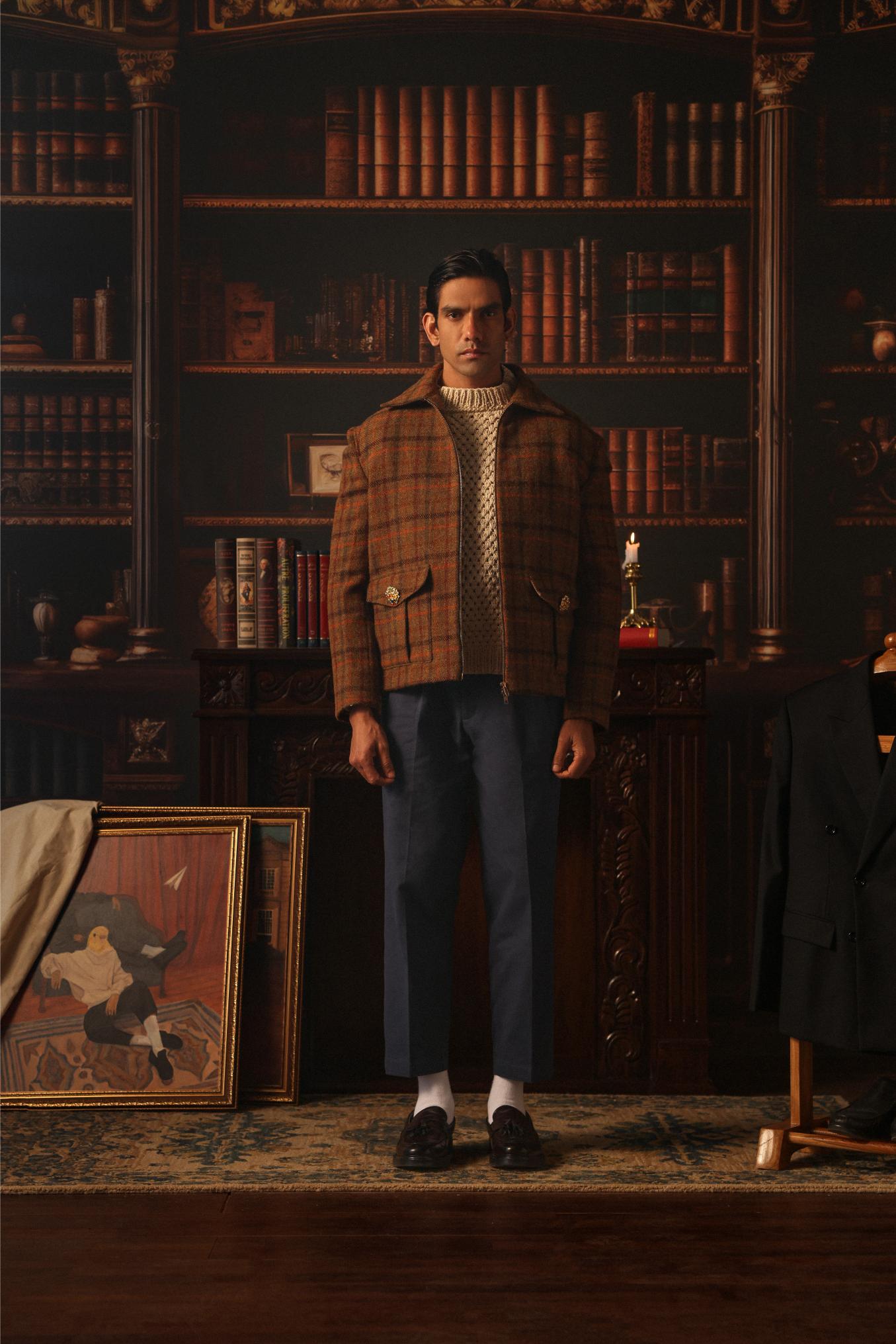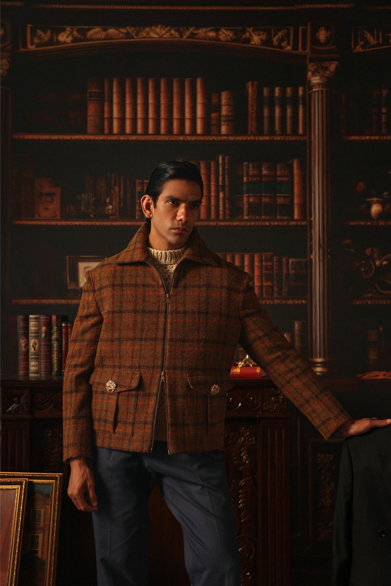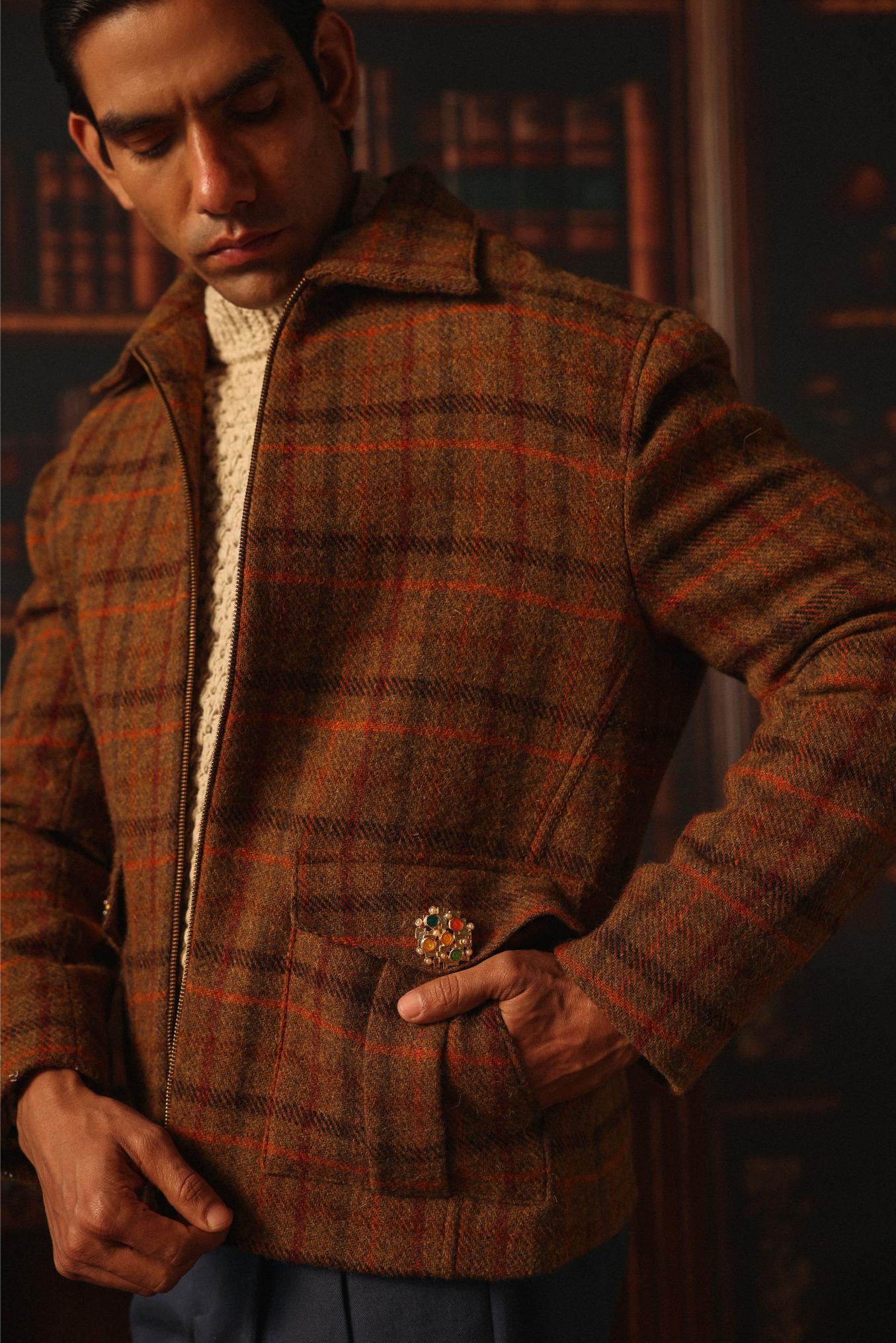 The Wake Your Dreams Aviator Jacket is crafted from 450 GSM Harris Tweed, woven in Scotland. Designed with a cropped silhouette, it features an oversized collar and a dual-zipper closure for a refined yet functional aesthetic. Fully lined for transitional seasons, it offers structure and sophistication for the modern wardrobe.