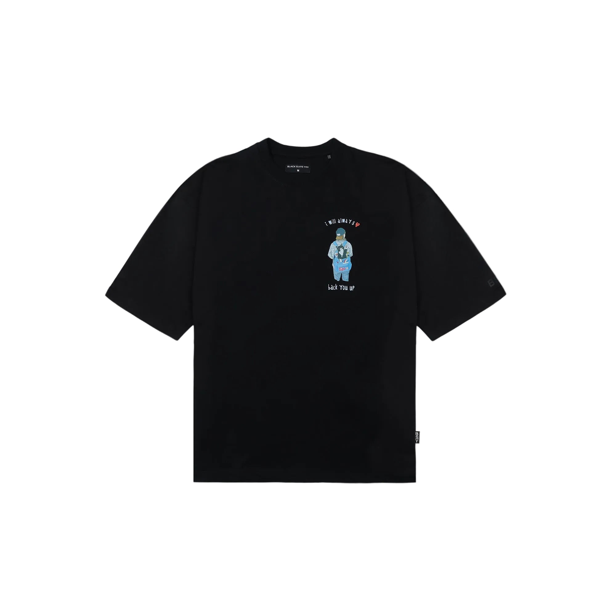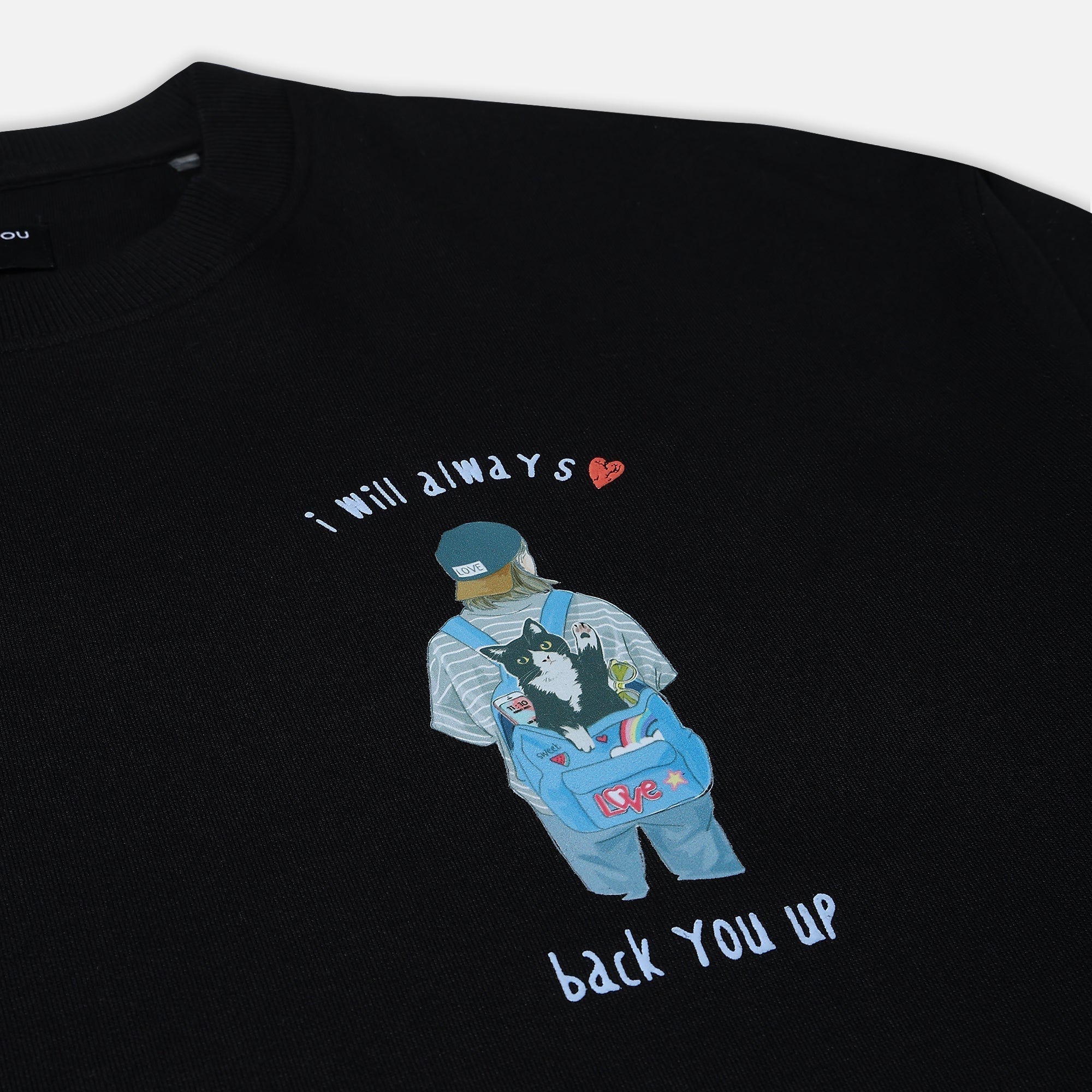 This minimal graphic t-shirt features a small chest print of a boy with a pet in his backpack, paired with “I will always back you up.” A clean, premium cotton tee designed around reassurance, loyalty, and emotional grounding.