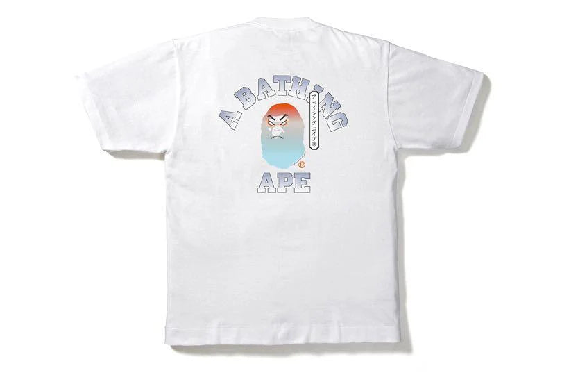 Introducing the BAPE Kabuki College Tee in classic white. Made with high quality materials, this tee features a unique kabuki-inspired design that will make you stand out from the crowd. Show off your streetwear style with this statement piece. Available now for a limited time only.