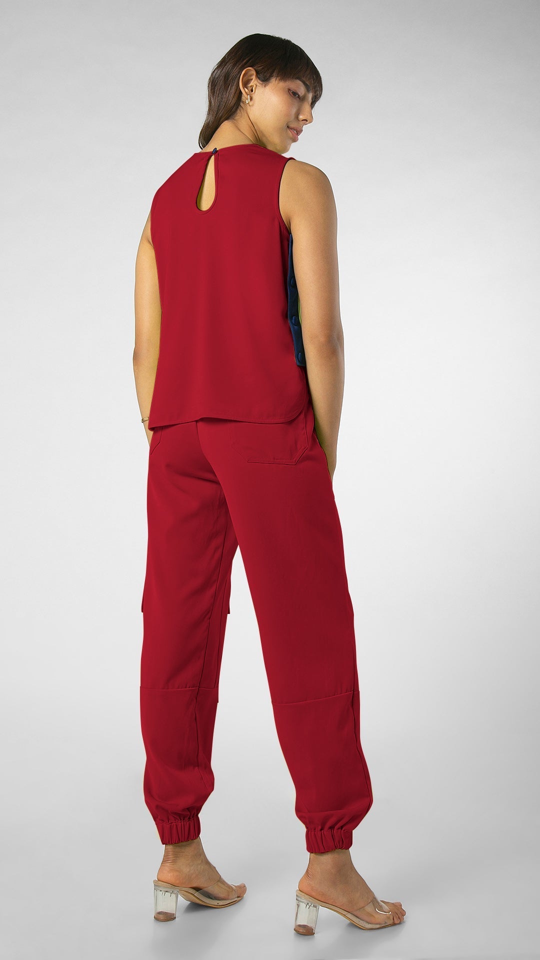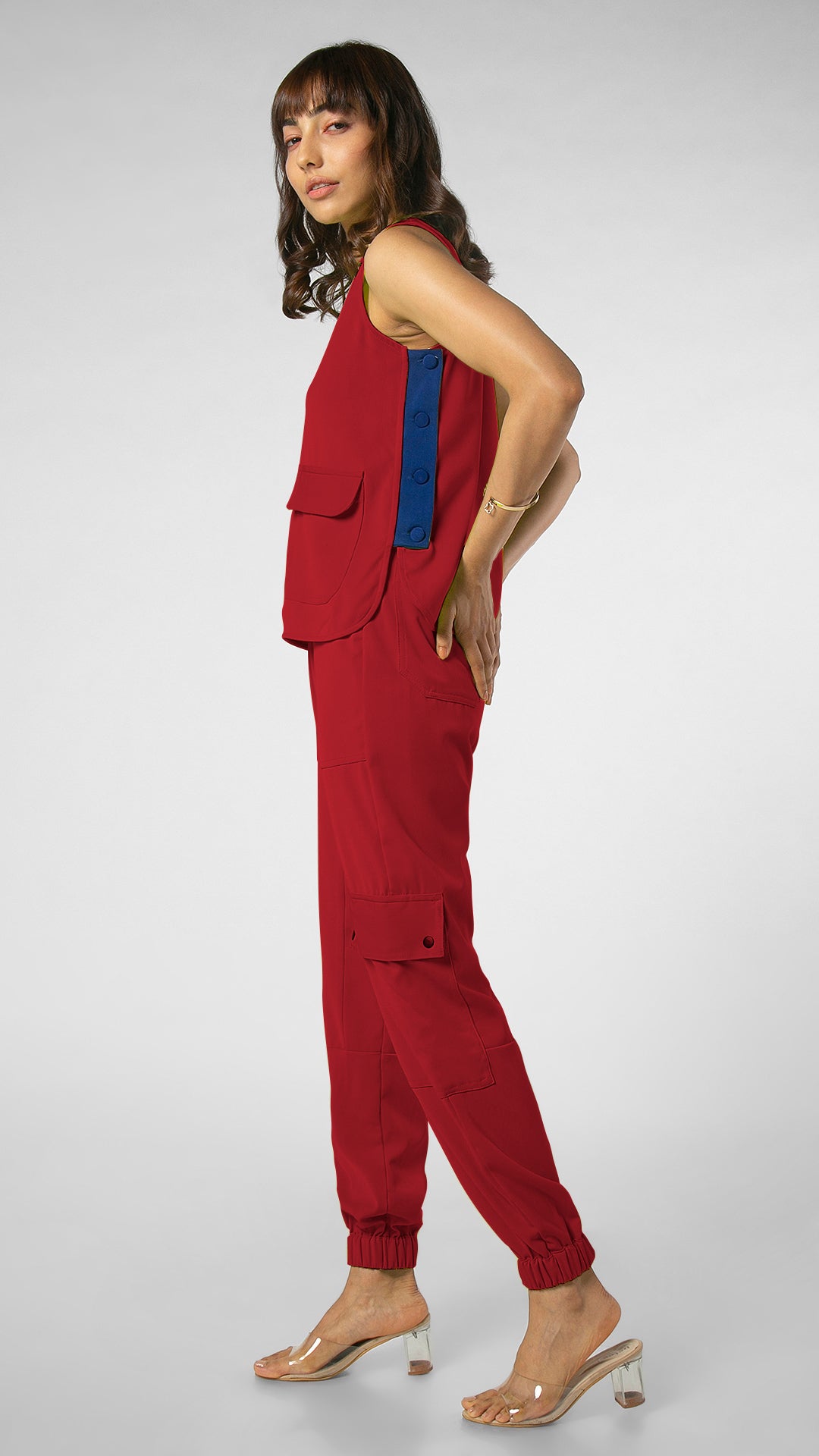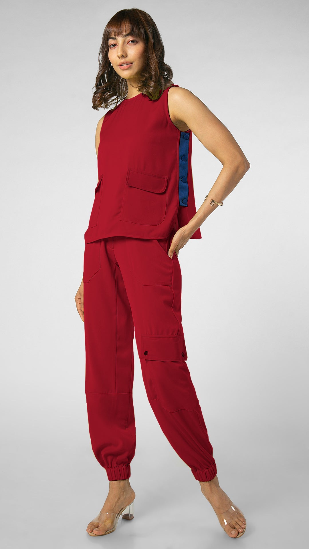 The Berry Trekker Set, with its contrasting blue strap and button fastening on the sides, is a standout piece in the streetwear top and coordinating set. The patch pocket adds an extra dose of style to this trendy top. Paired with matching joggers, which feature a drawstring elastic waist for comfort and fit, as well as slit pockets and a patch pocket, this coordinated set is both fashionable and functional. The combination of a crimson red and contrasting royal blue creates a dynamic and energetic look, perfect for those who want to embrace a bold and stylish streetwear aesthetic while enjoying practical elements for their urban adventures.