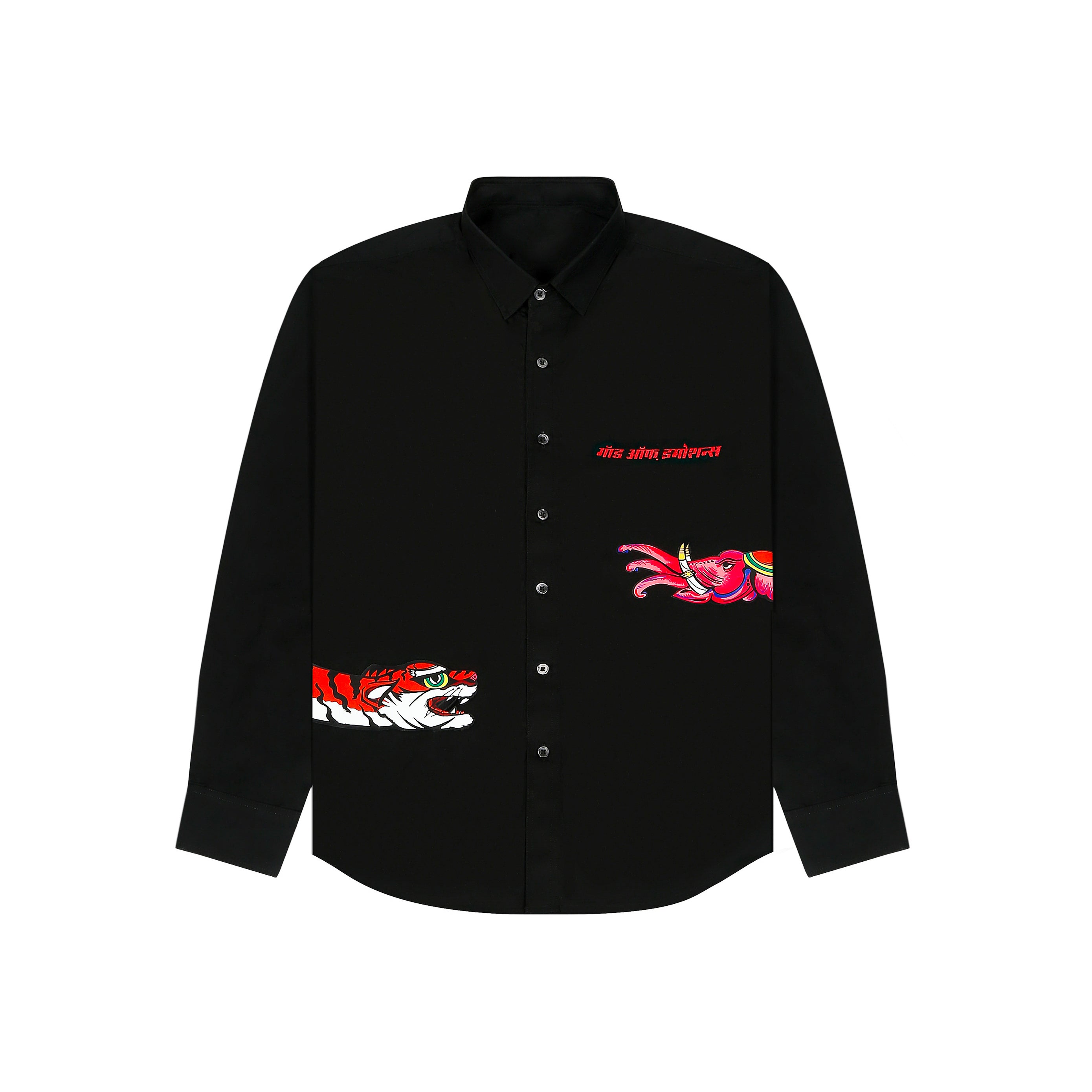 Crafted in black cotton poplin, this relaxed shirt carries the weight of an eternal dilemma. An ouroboros artwork twists two beings into one — the tiger, fierce and unyielding, and Airavata, calm and enduring — each devouring its own tail. The design reveals a truth: every act of shakti is bound in the loop of kshama, and neither survives without the other. A silhouette built for ease, with prints that embody the eternal struggle between strength and restraint. The Bhujang Shirt is not just worn — it is a reminder that power and forgiveness are forever entwined.
