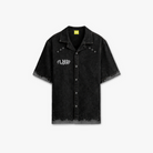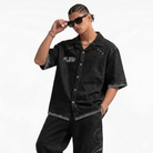 All-black denim half-sleeve shirt with grey spray distressing on the bottom hem and sleeves for that battle-worn vibe. Dual chest metal grommets add hardware toughness, paired with metal buttons throughout. Front left boasts subtle FLYAF branding, while the back unleashes the iconic PARENTAL ADVISORY EXPLICIT CONTENT text in silver sniggle — a bold, no-filter declaration of unapologetic expression. Pure street rebellion in every stitch.