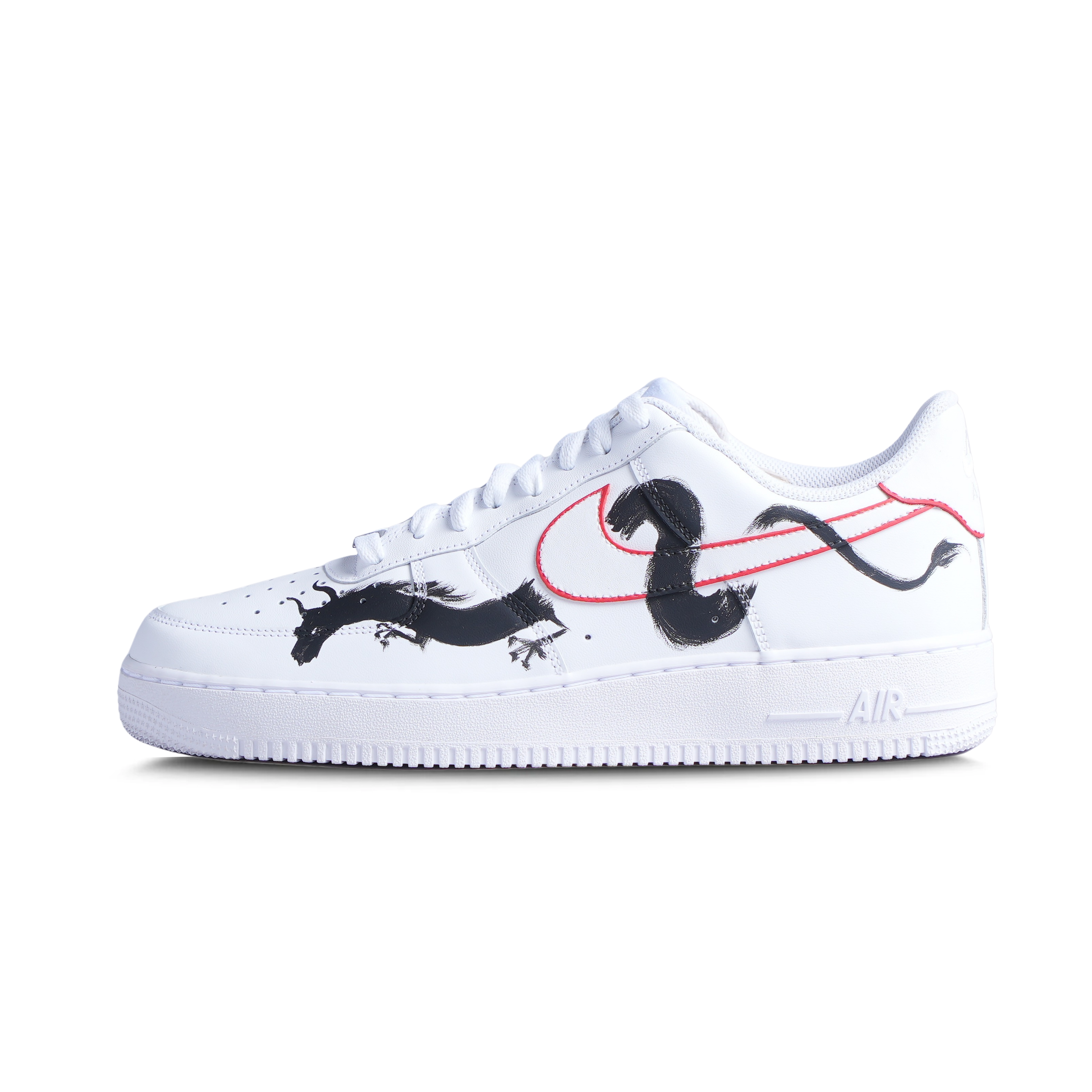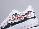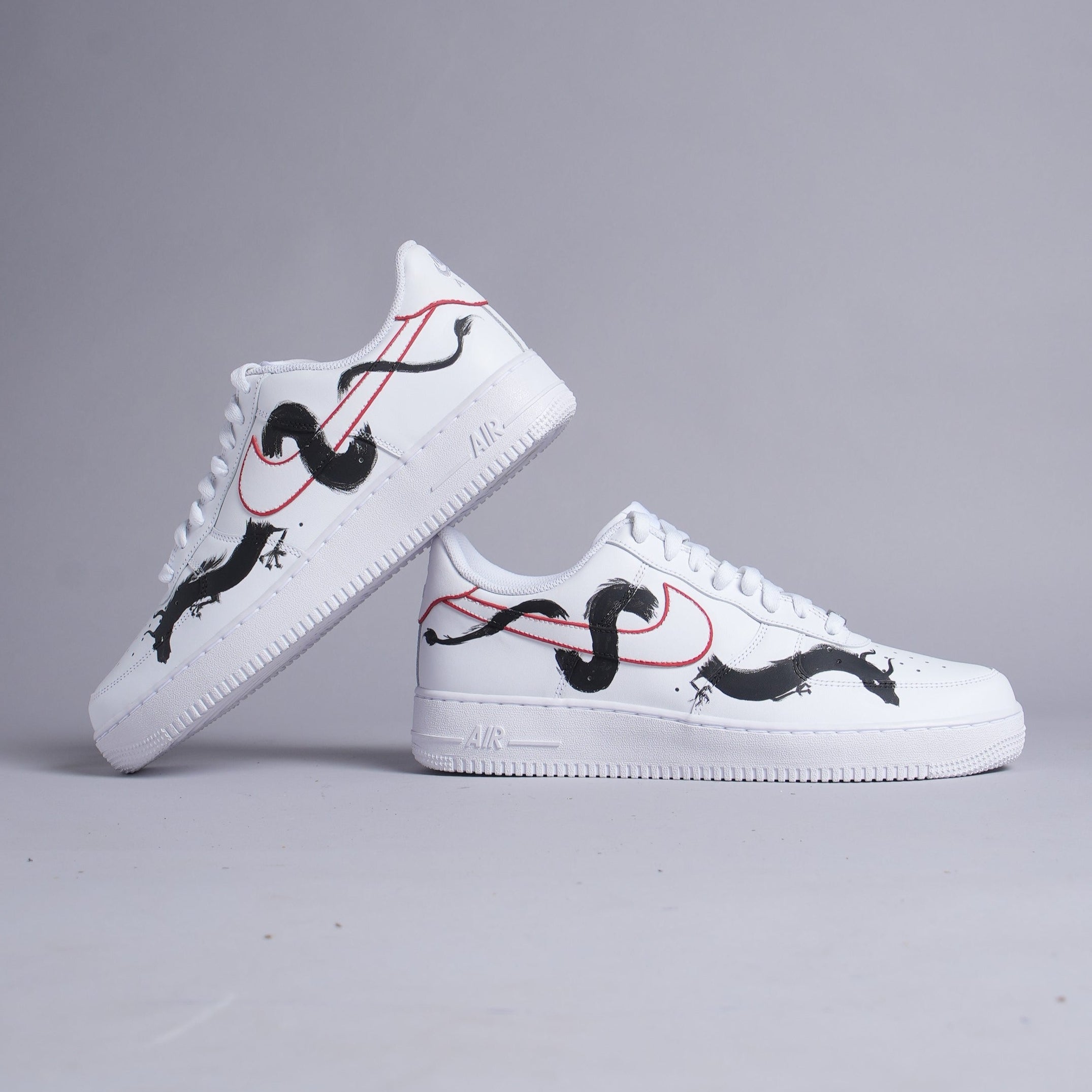 These Nike AF1s feature hand painted Japanese art that showcases a magnificent black dragon flying over the iconic swoosh. The detailed cherry blossom tree and castles add a touch of elegance to these luxurious sneakers. Elevate your fashion game with the BLACK DRAGON AF1.
