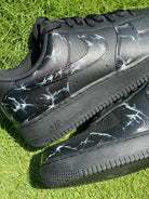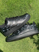 Our BLACK MARBLE AF1 is a fashion-forward statement piece that celebrates simple elegance. Refined black marble is intricately hand-painted onto a black Nike Air Force 1 silhouette, creating an exquisite aesthetic that's sure to turn heads. The perfect footwear for trendsetters and style mavens alike.