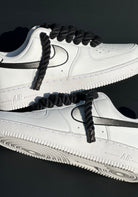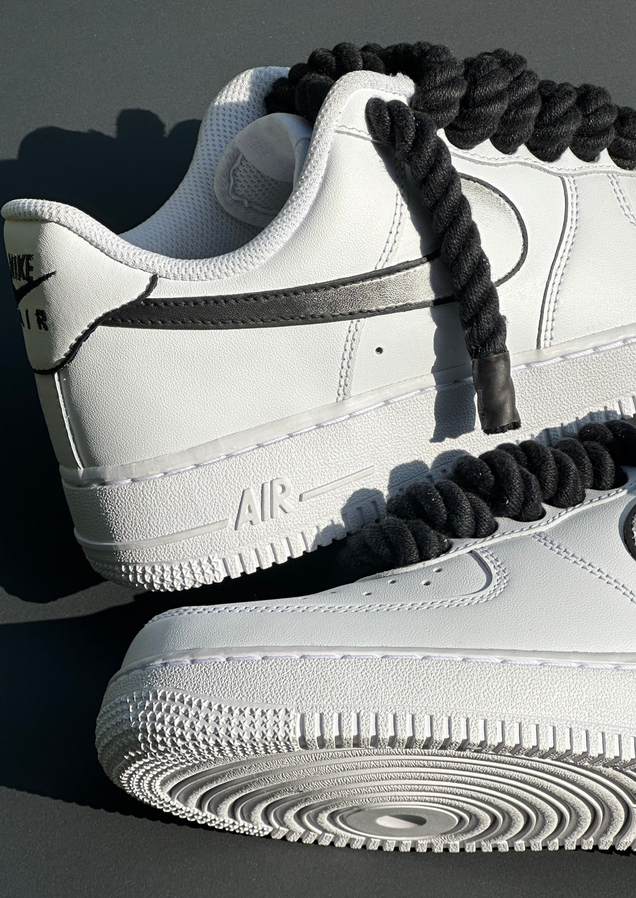 The BLACK ROPE SWOOSH AF1 features a classic NIKE AF1 design in triple white, paired with fan-favorite thick black rope laces. The black ombre accents on the swoosh add a touch of boldness to this iconic sneaker.