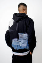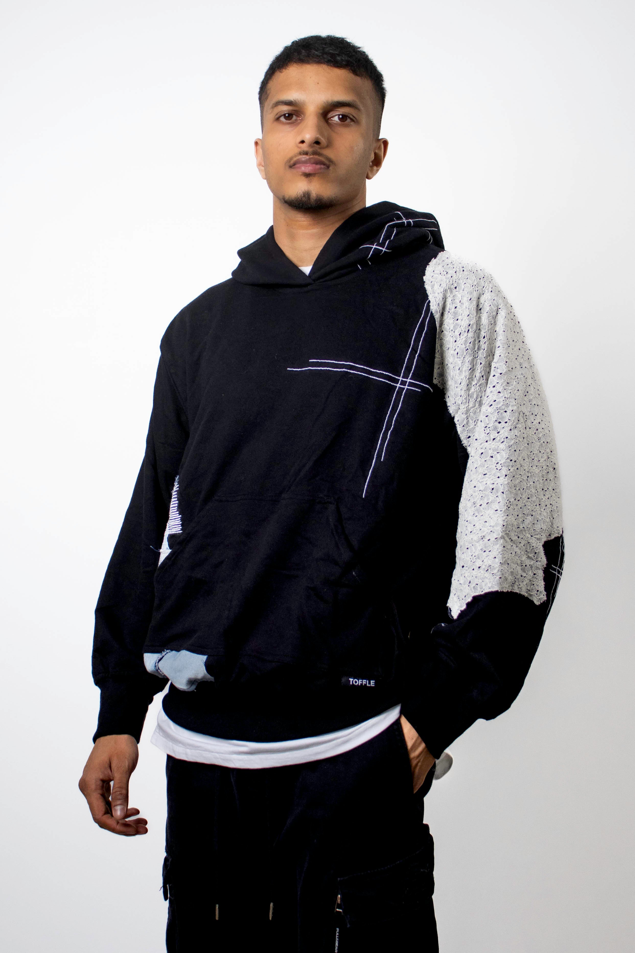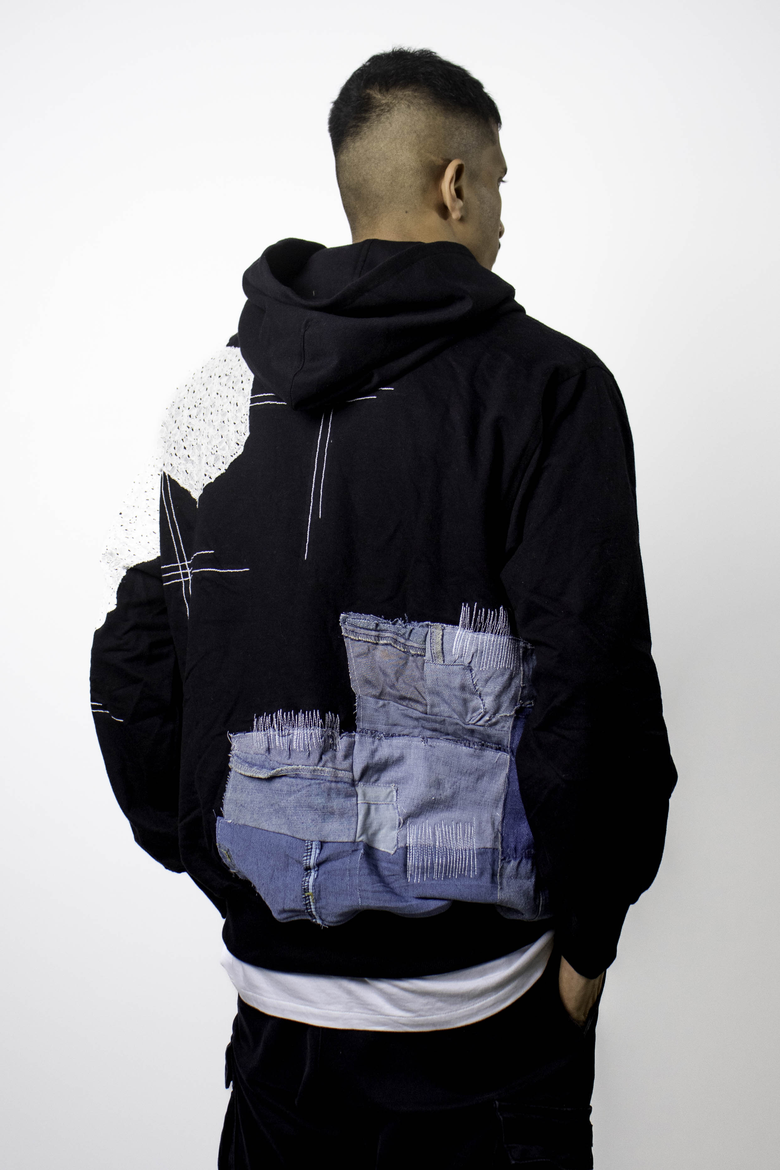 This patchwork piece of art is a molten mix of net design, denim patchwork and hand done embroidery on a comfortable drop shoulder black fleece hoodie.