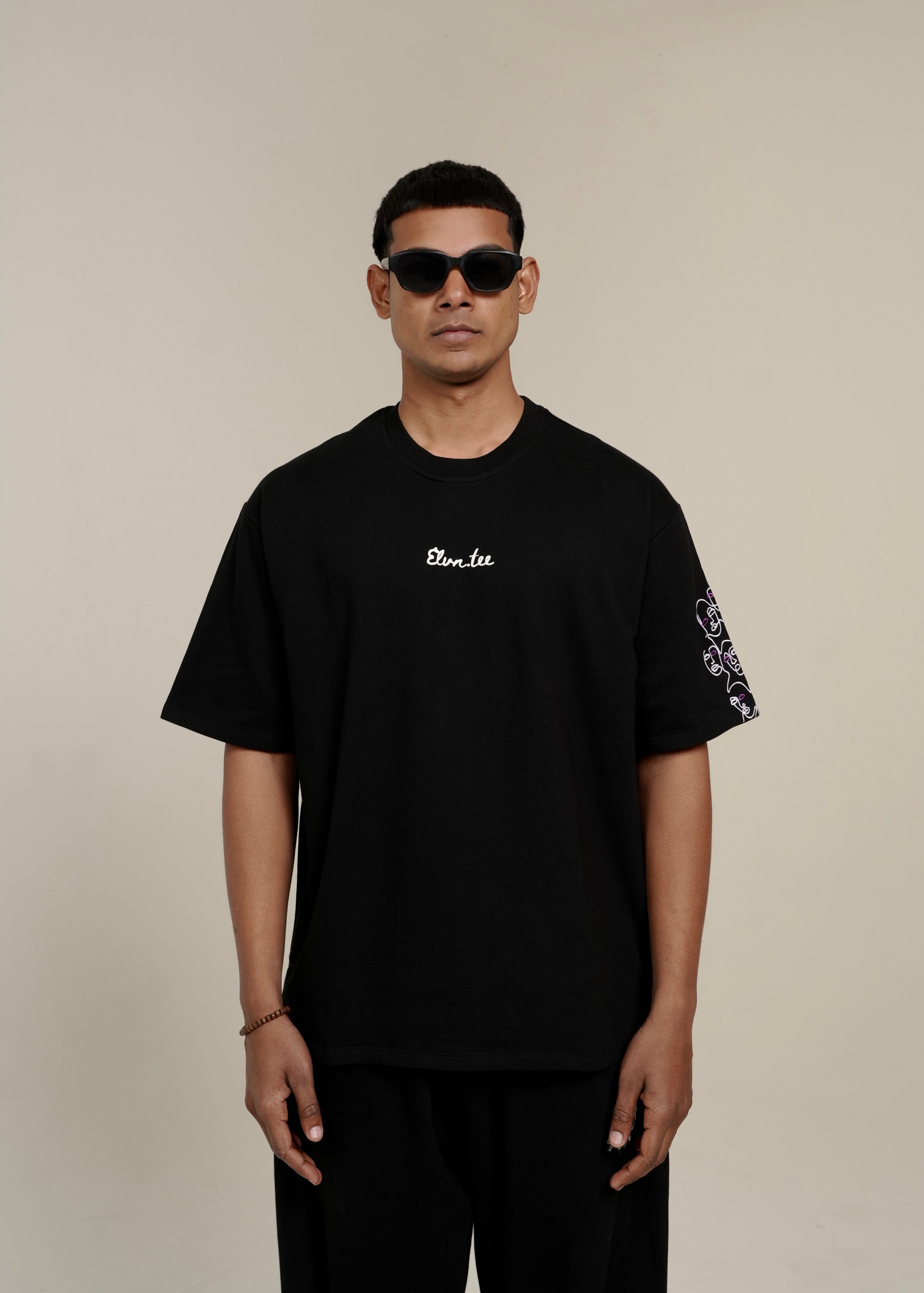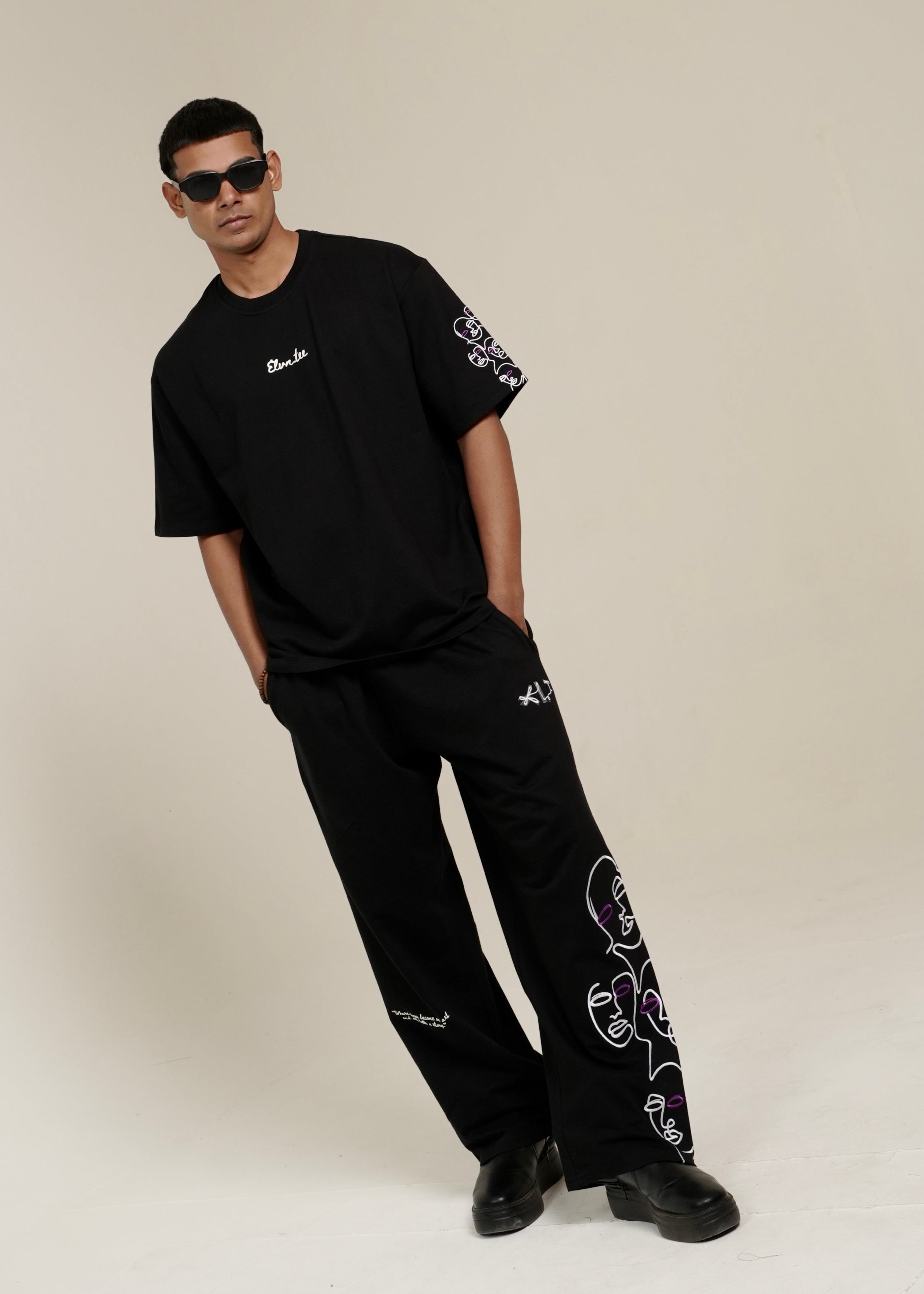 A wearable canvas where identity fades and expression speaks louder. A bold fusion of abstract minimalism and contemporary streetwear, featuring intricately embroidered line faces contrasted with high-density screen print in white.