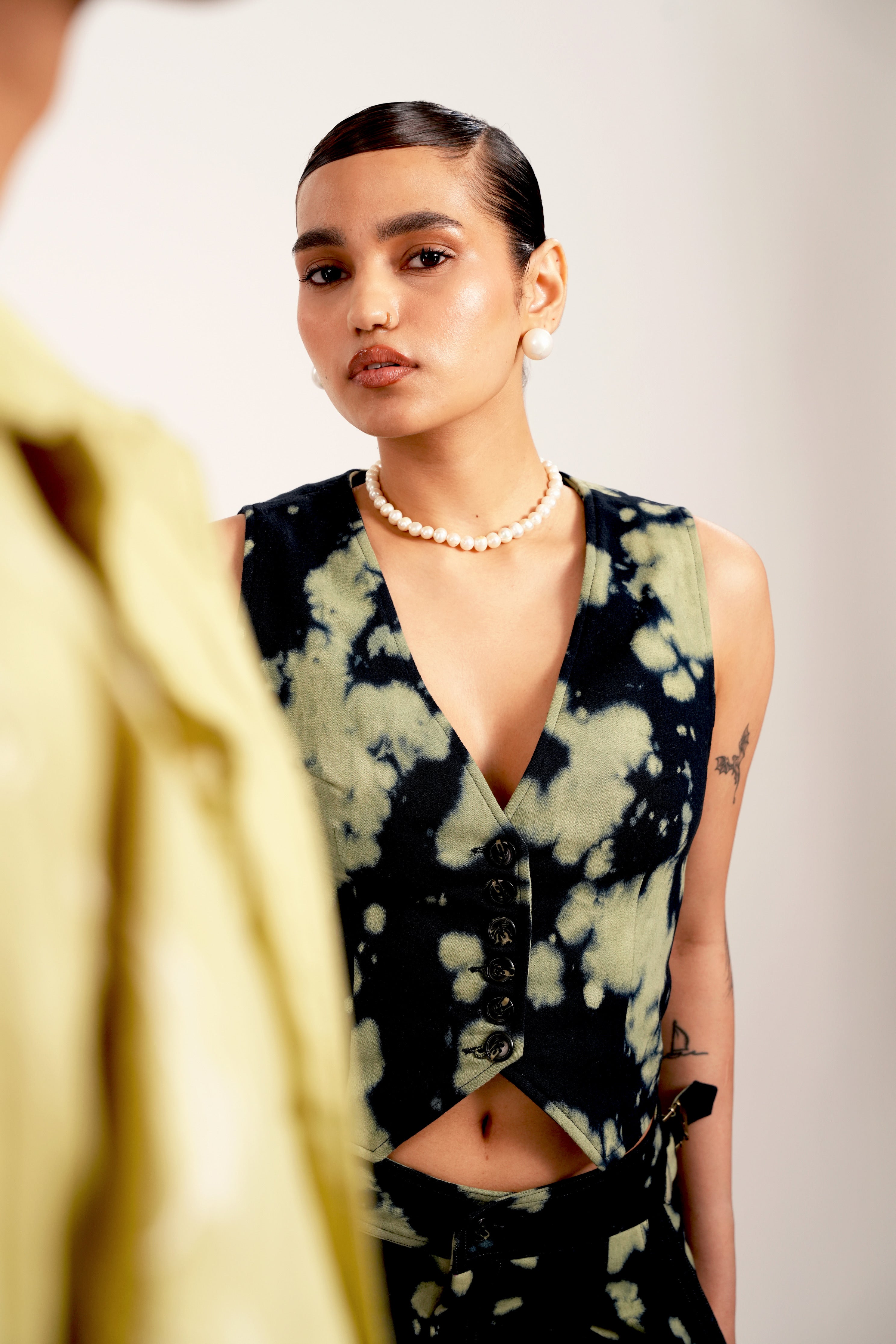V-neck waistcoat, featuring a six-button front, strikes the perfect balance between street and sophistication. a dreamy cloud effect with dual-tone colouring.