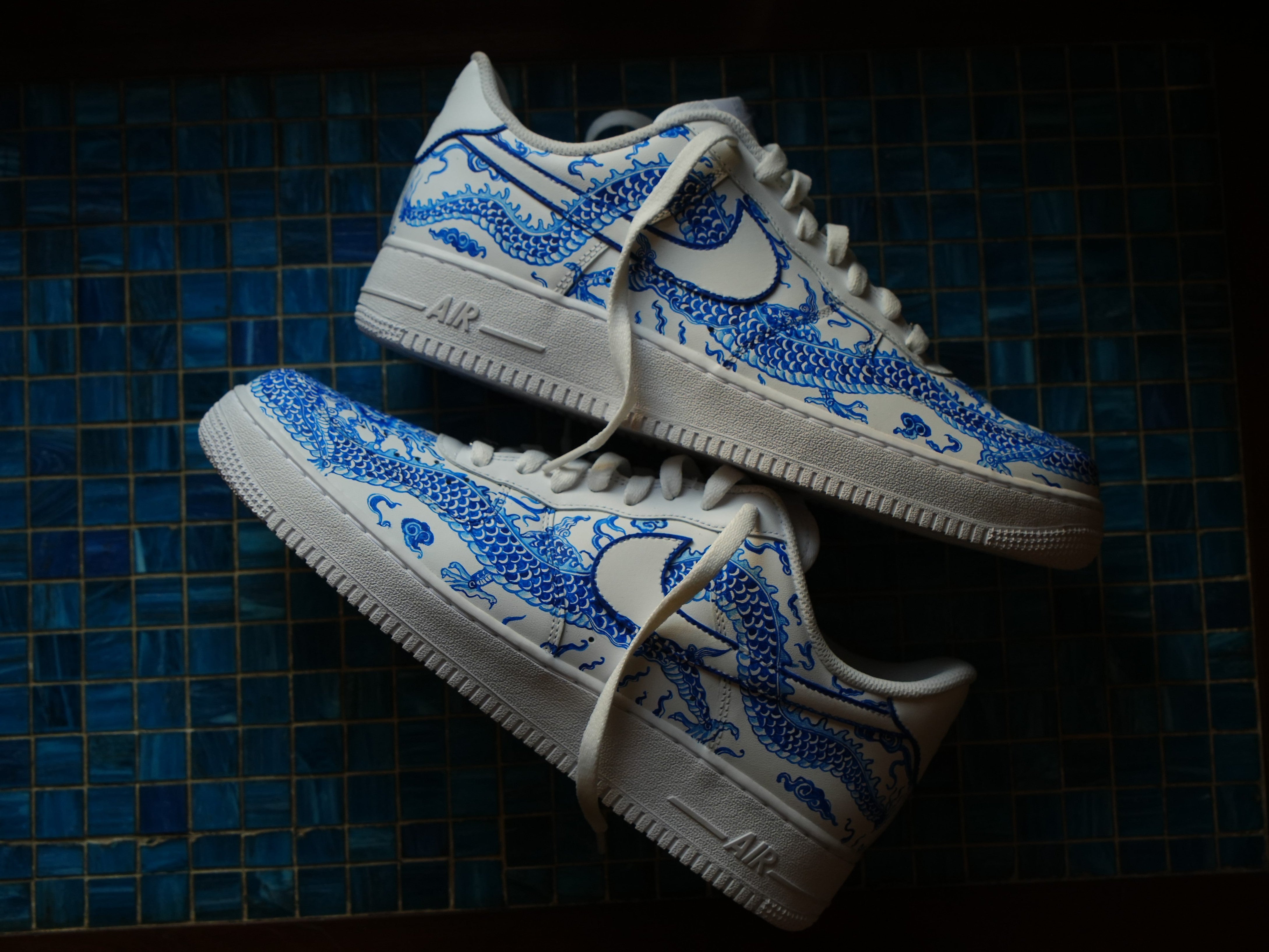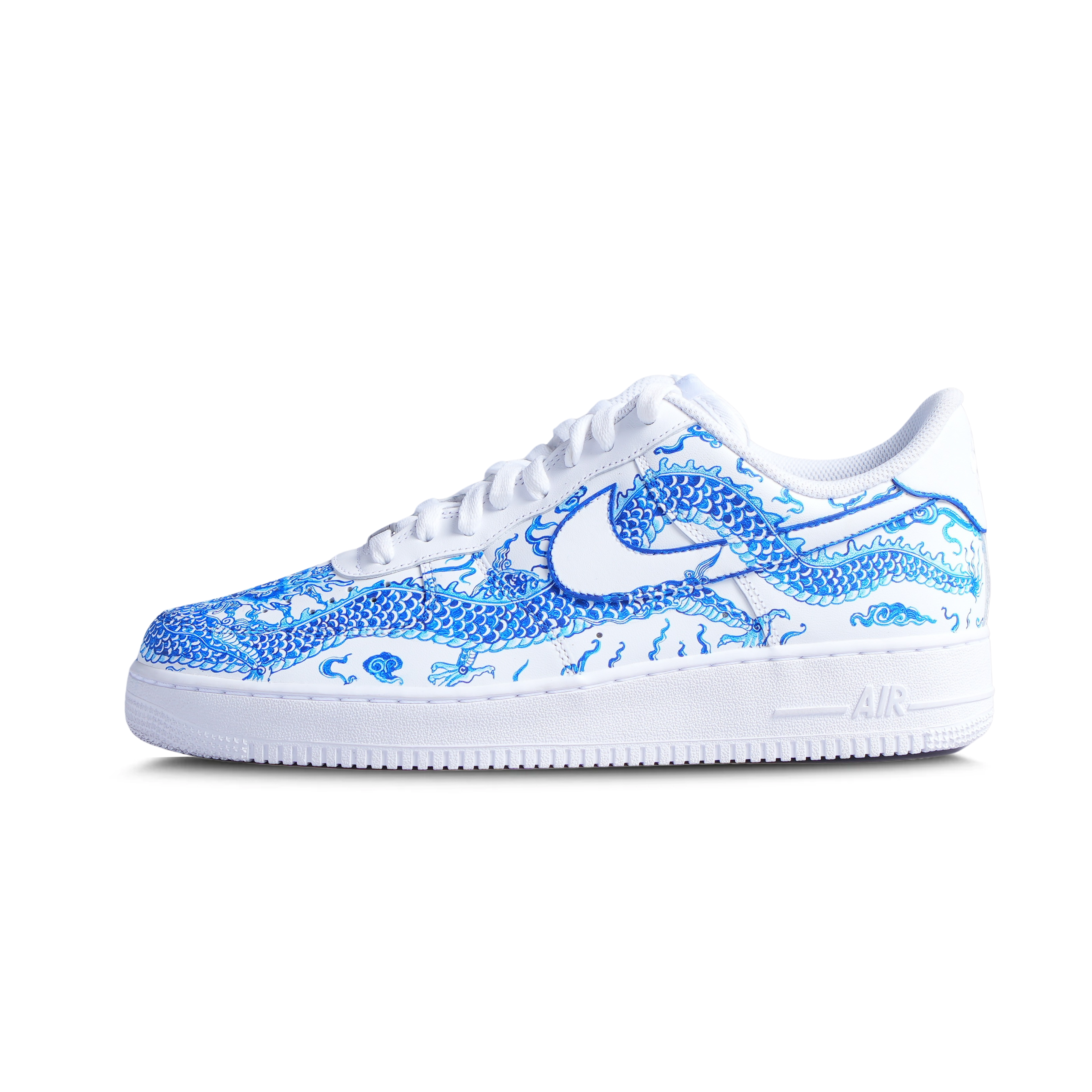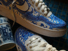 Introducing the BLUE DRAGON AF1. Inspired by Japanese and Chinese porcelain art, the blur porcelain dragon design adorns the outside while scenic details decorate the inside. Celebrate the year of the dragon with this exclusive piece of ART.