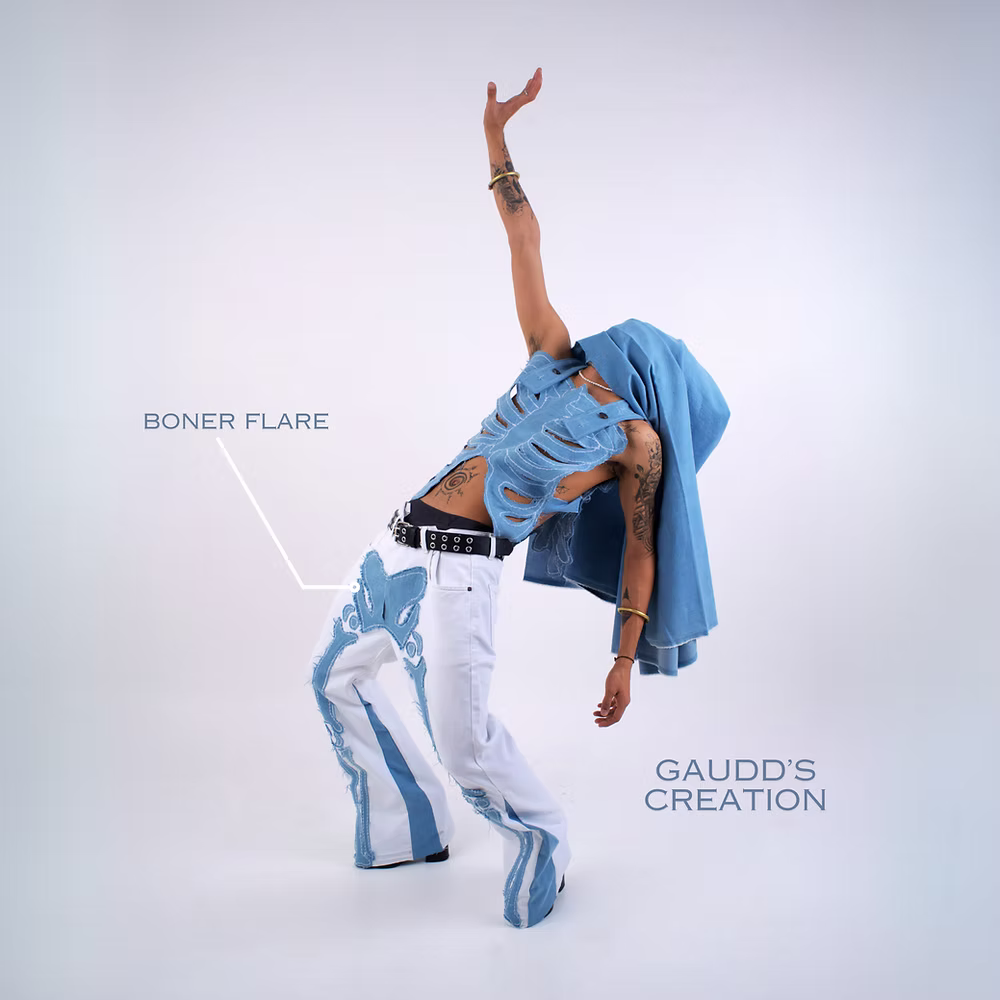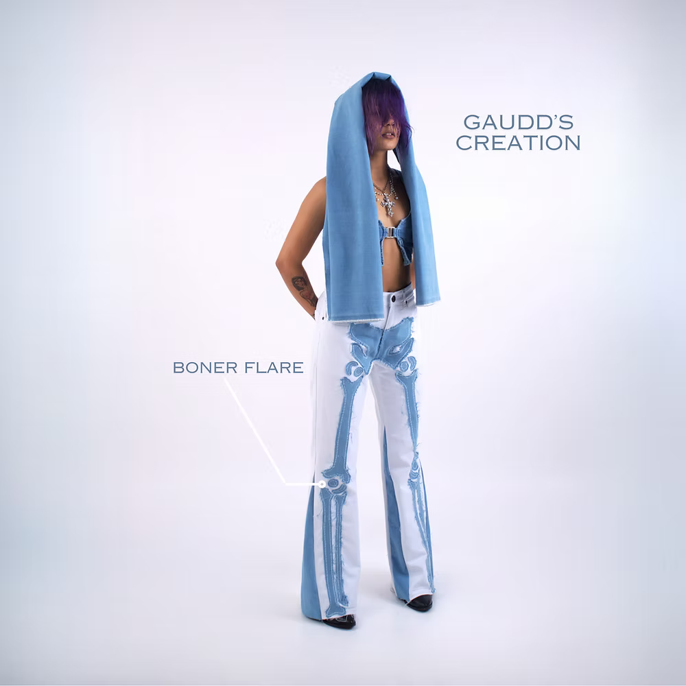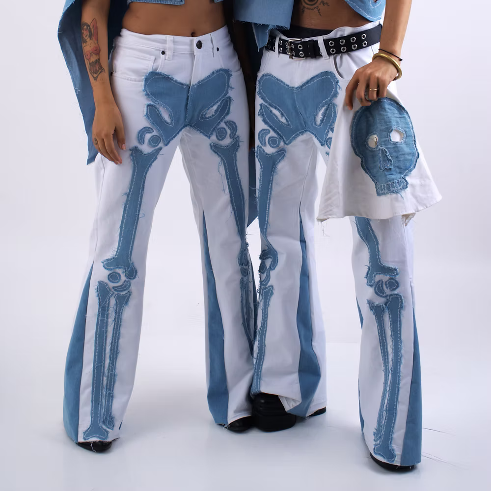 The combination of the black denim, grey denim flares, and lower body skeleton patchwork results in a unique juxtaposition of styles. These jeans are a statement piece that effortlessly merges elements of classic denim with a bold and unconventional twist, making them an extraordinary choice for those seeking to showcase their individuality and daring sense of fashion.
