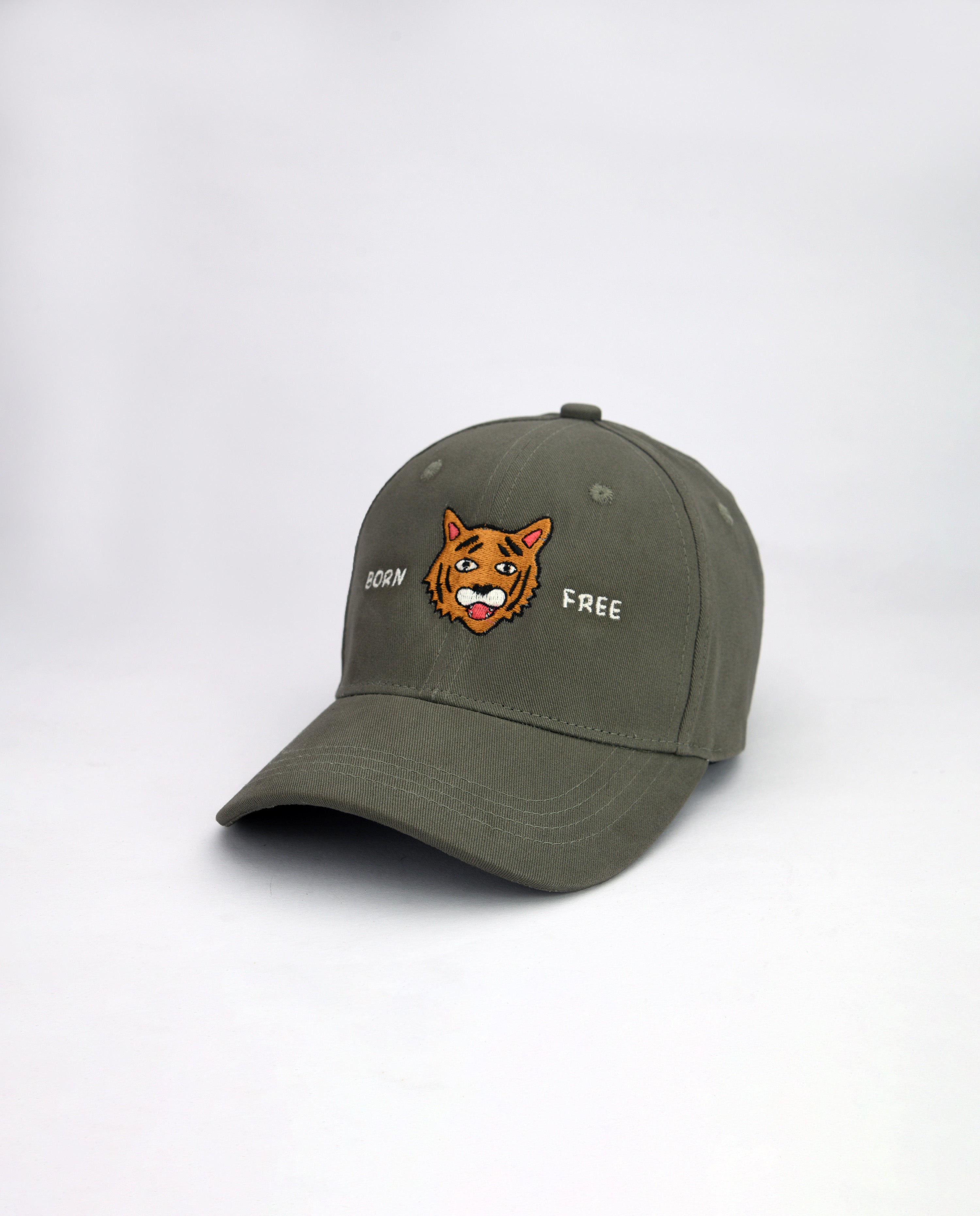 Make a bold statement with this sleek, olive cap, featuring a playful and vibrant tiger face embroidery at the center. The design is flanked by the words "Born Free" in clean, white stitching, symbolising a spirit of freedom and individuality. Crafted from durable, high-quality fabric, this cap offers both style and comfort. The curved brim provides a classic look, while the adjustable strap at the back ensures a custom fit. Perfect for casual wear, street style, or adding a unique touch to any outfit.