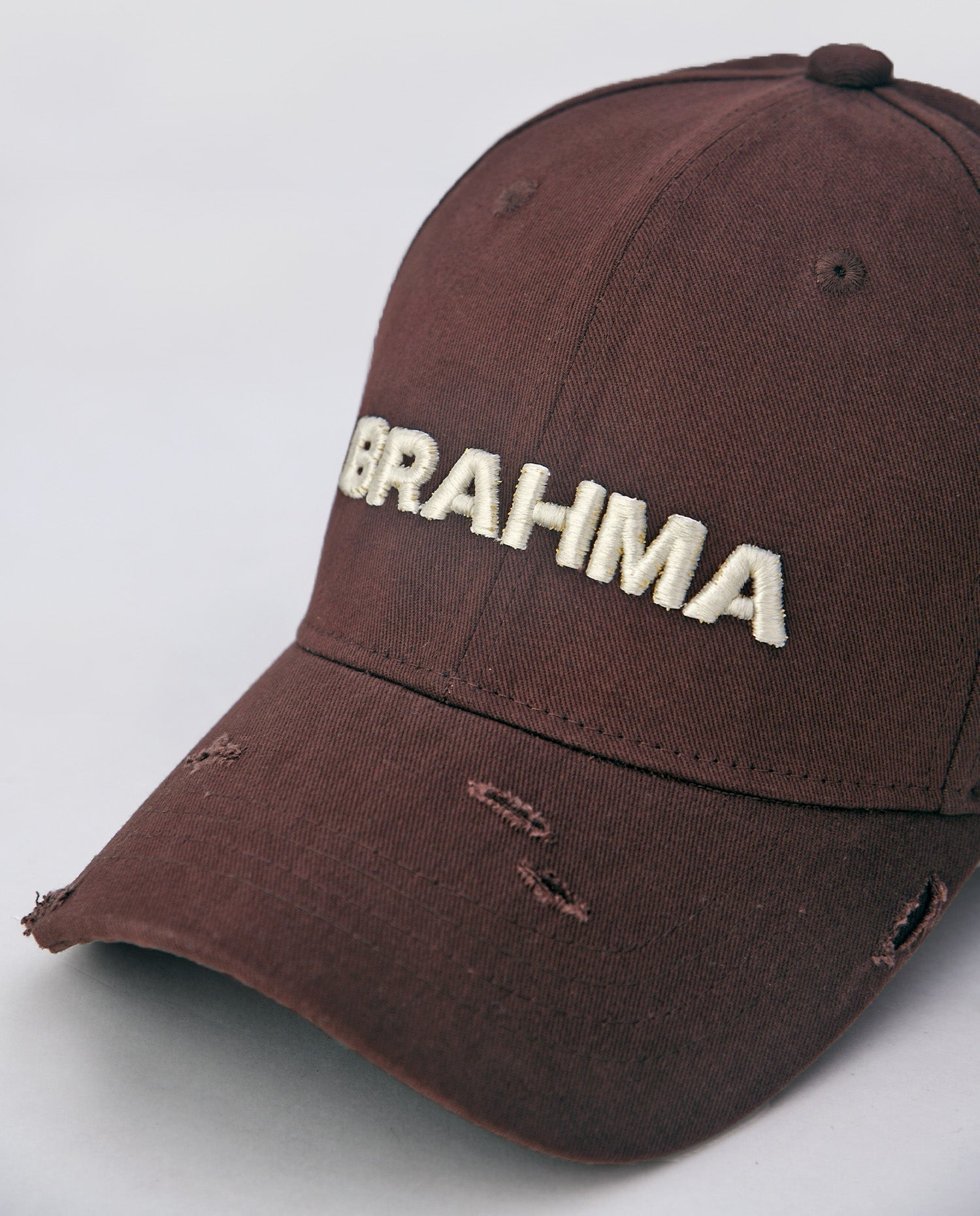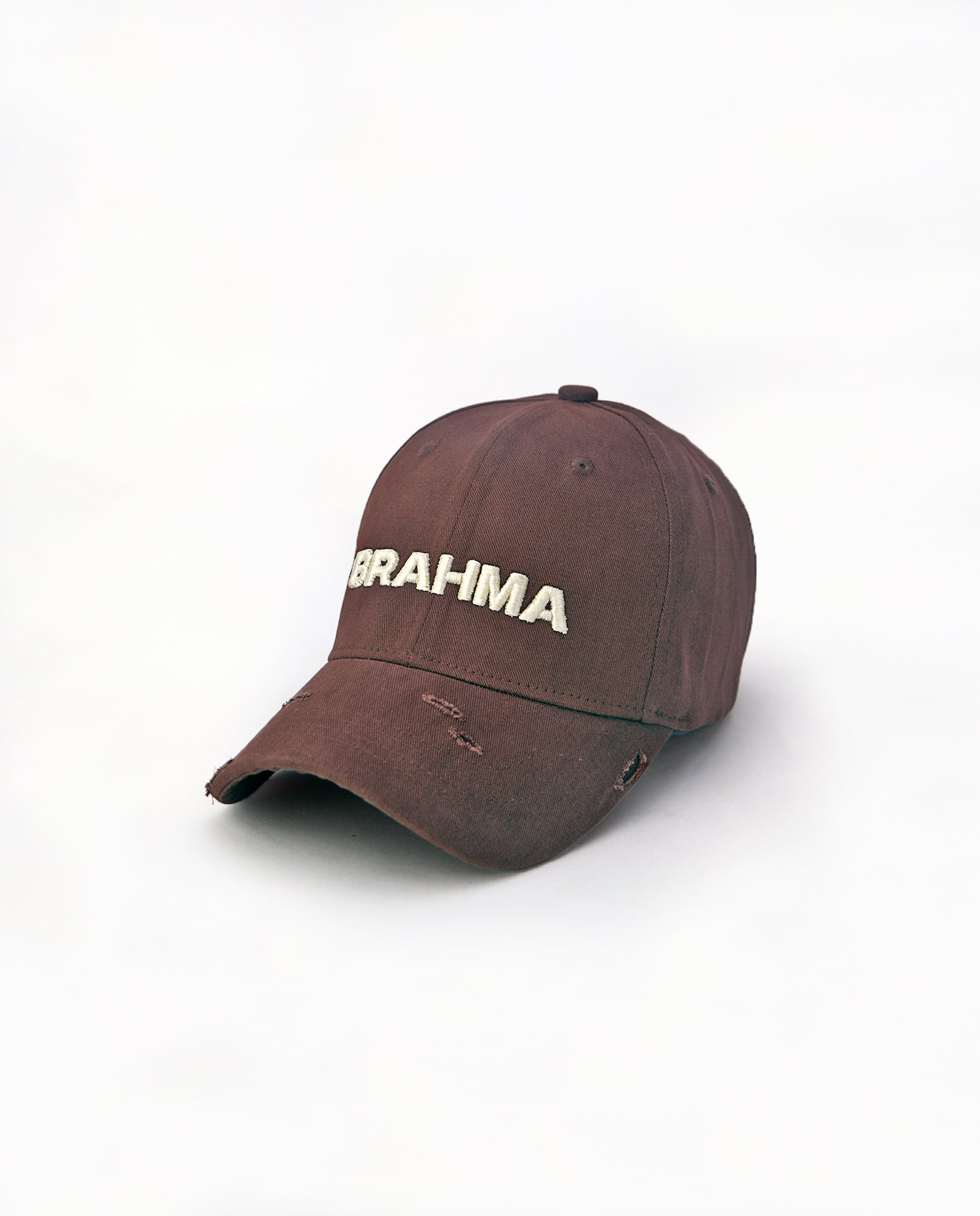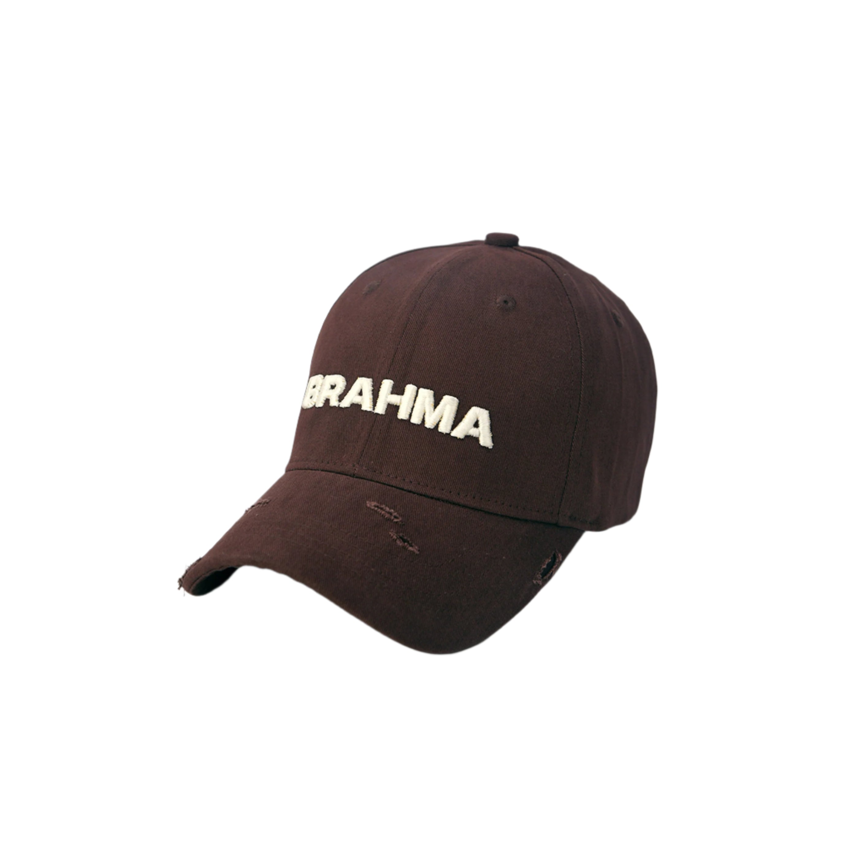 This brown cotton baseball cap is a perfect fusion of craftsmanship and rugged style. Made from high-quality cotton fabric, it features hand-distressed detailing, ensuring that each piece is uniquely crafted. The front showcases a bold 3D embroidered "Brahma" artwork in off-white, adding a striking contrast to the earthy brown base. With its individually distressed elements, no two caps are the same, making it a true statement piece for those who appreciate authenticity and raw aesthetics.