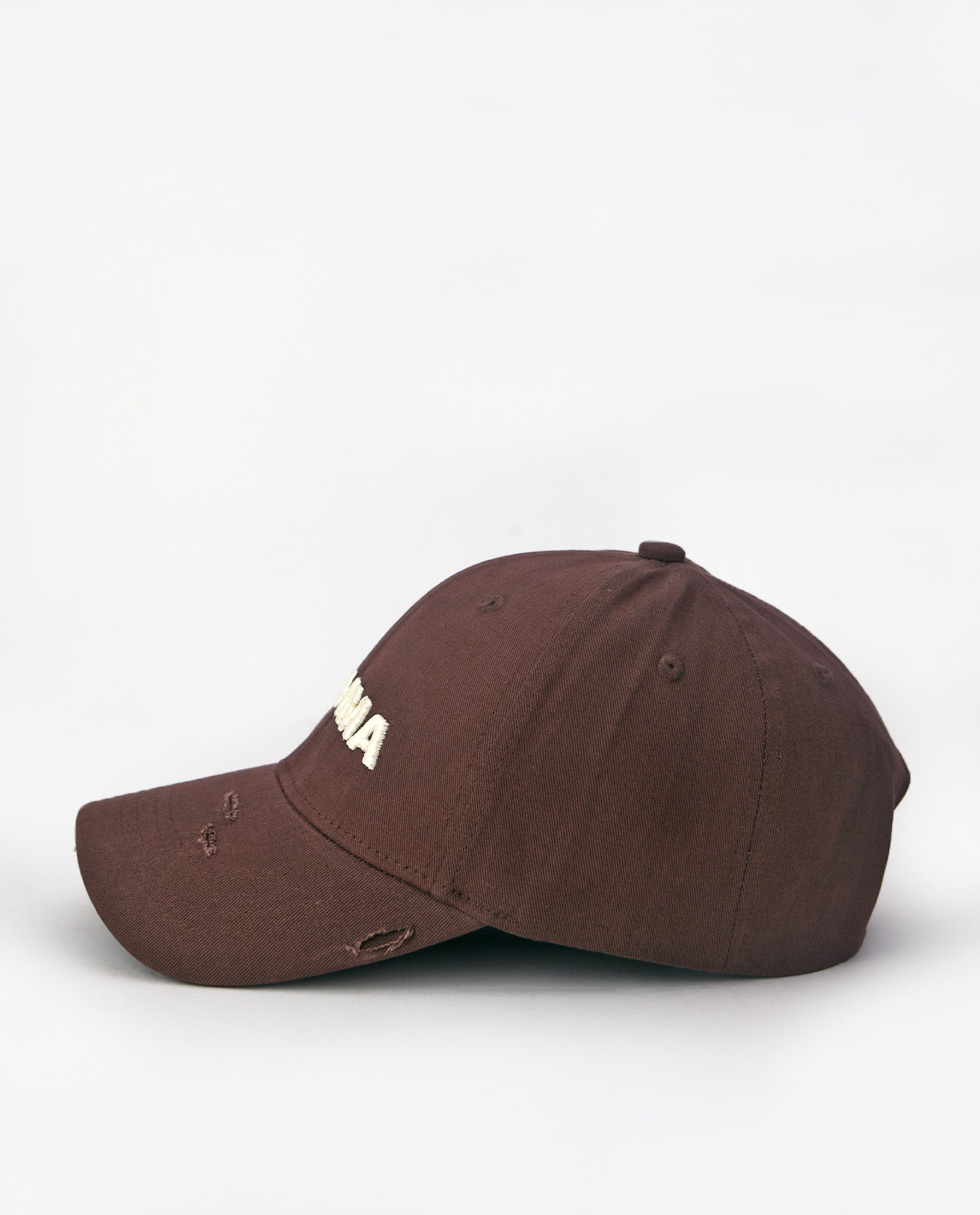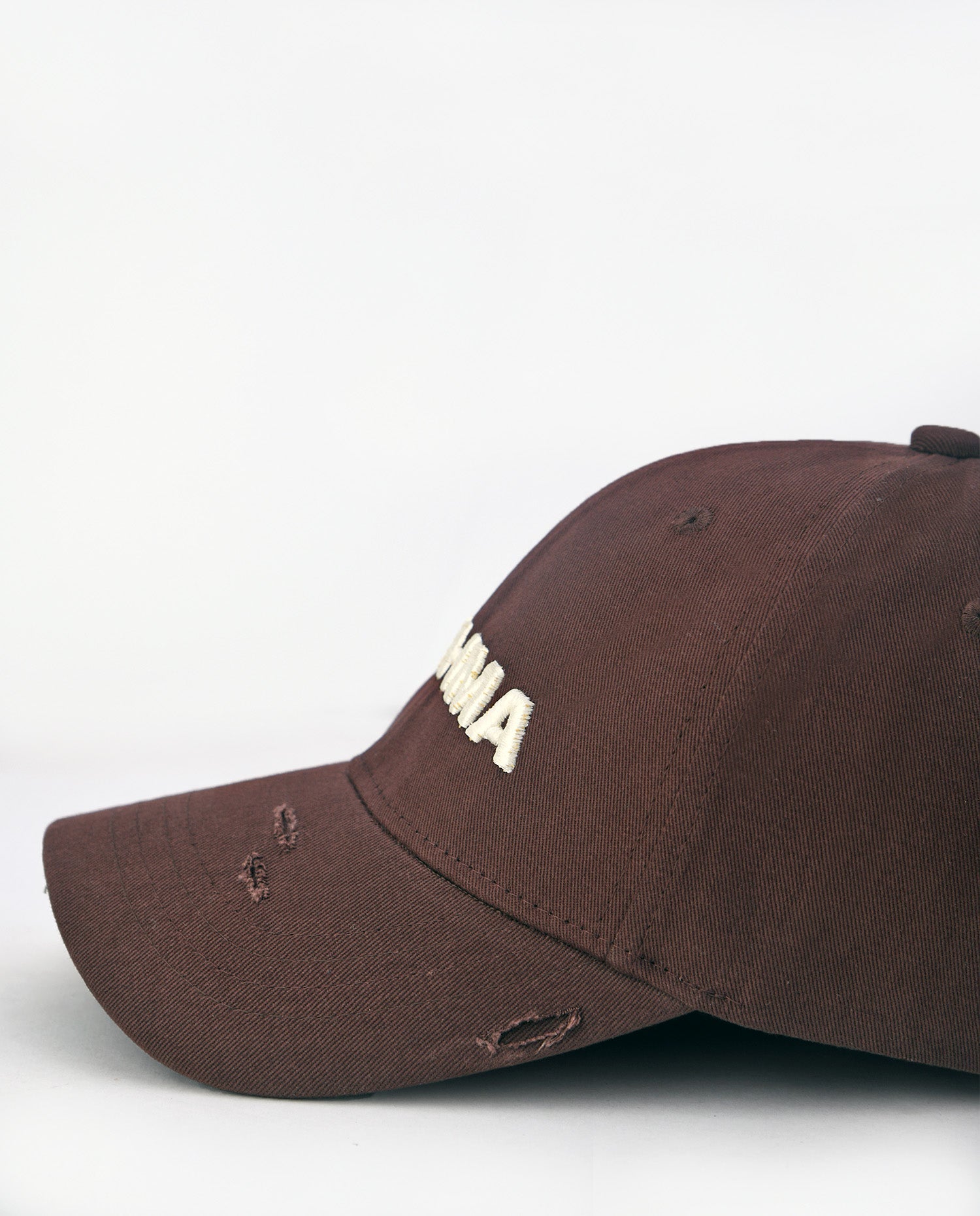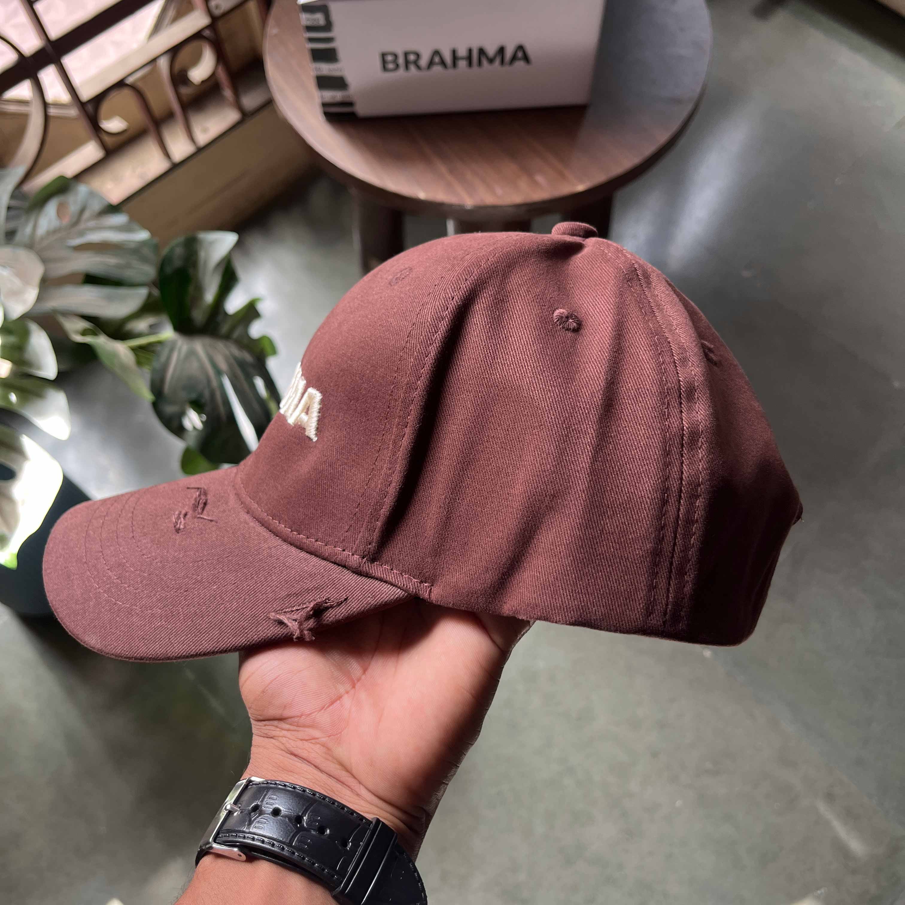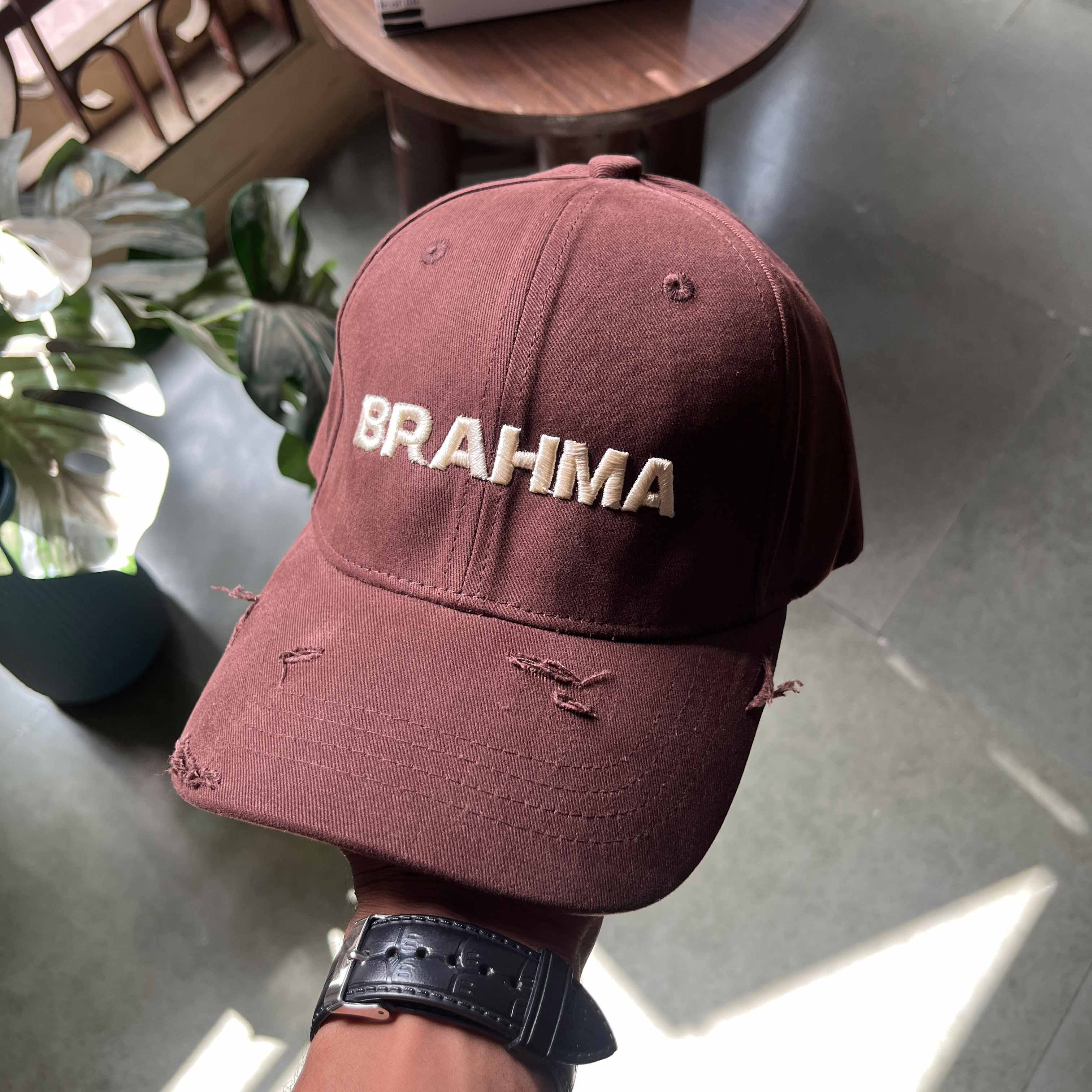This brown cotton baseball cap is a perfect fusion of craftsmanship and rugged style. Made from high-quality cotton fabric, it features hand-distressed detailing, ensuring that each piece is uniquely crafted. The front showcases a bold 3D embroidered "Brahma" artwork in off-white, adding a striking contrast to the earthy brown base. With its individually distressed elements, no two caps are the same, making it a true statement piece for those who appreciate authenticity and raw aesthetics.
