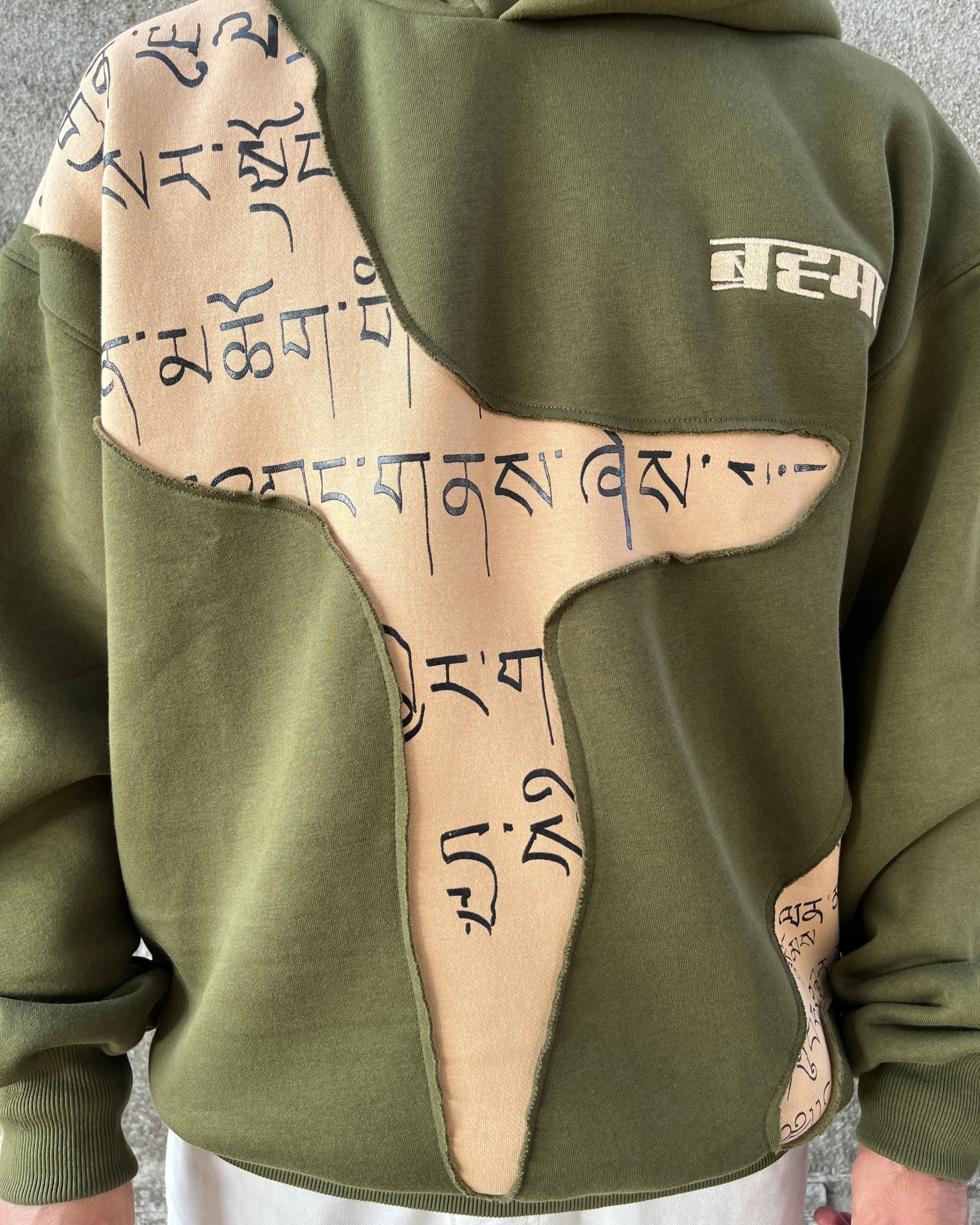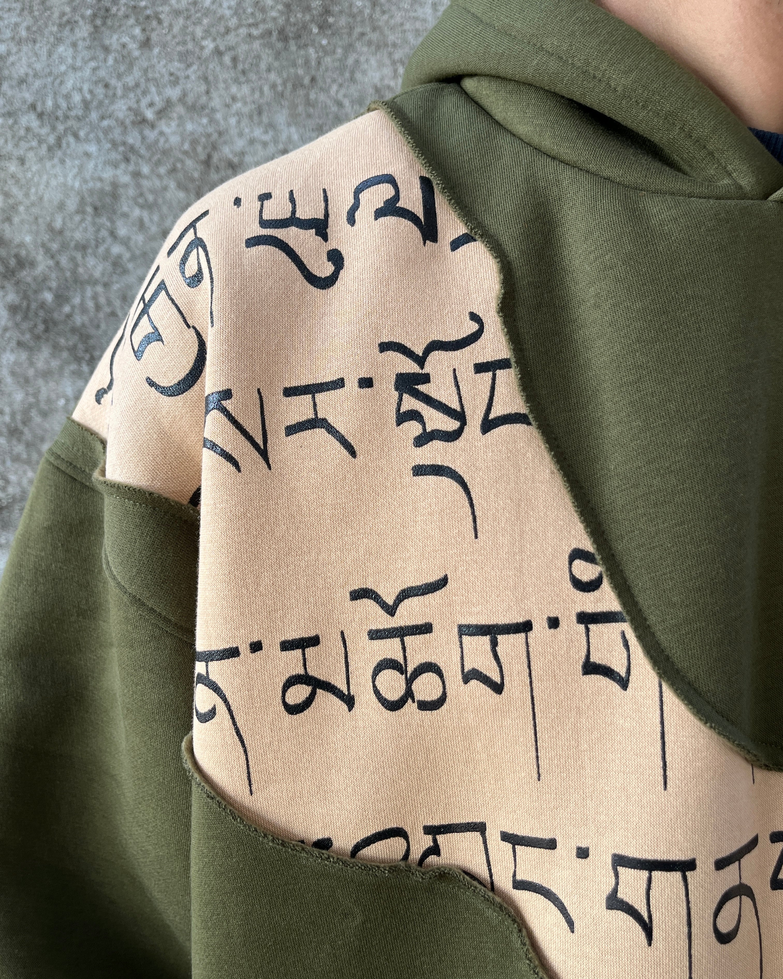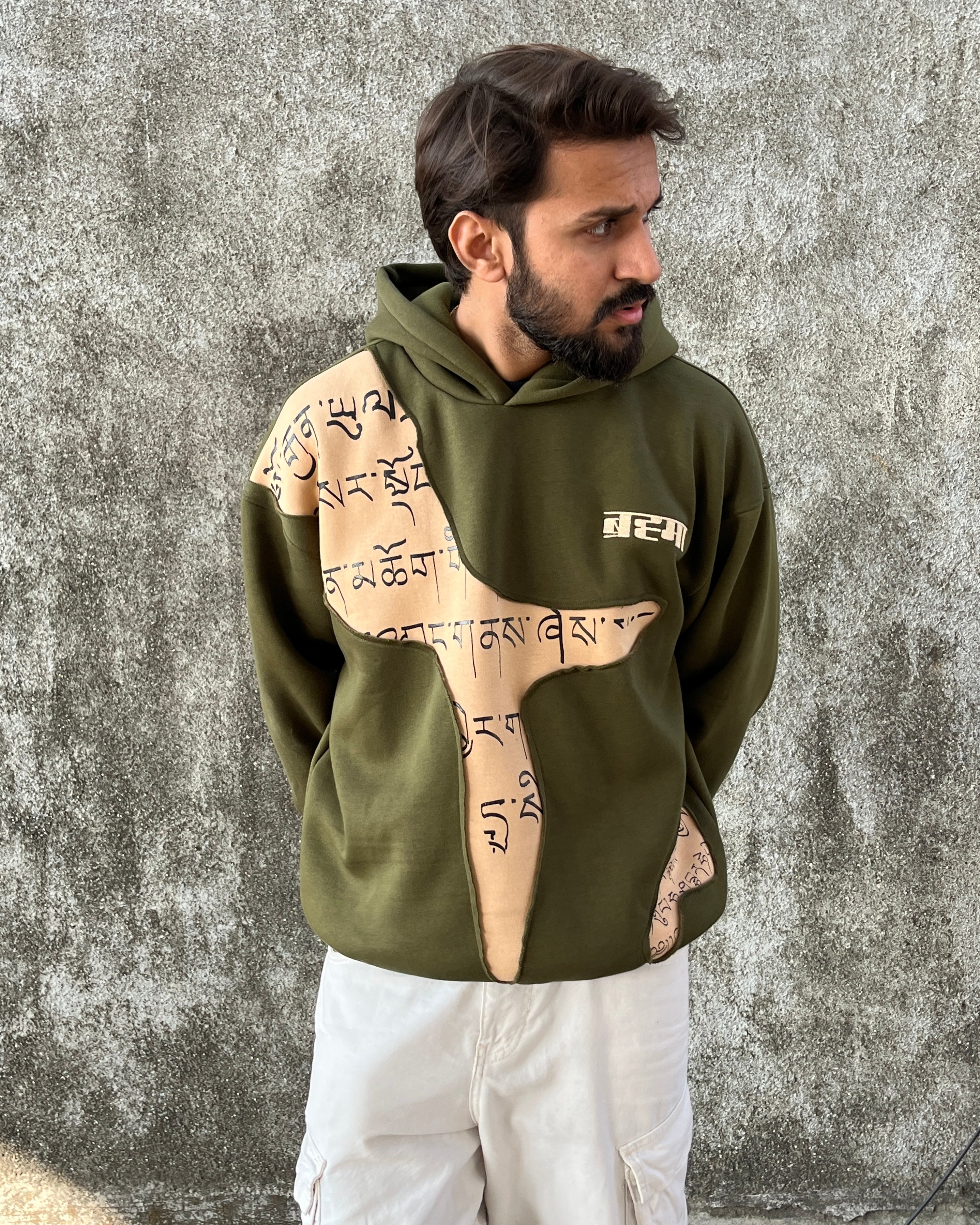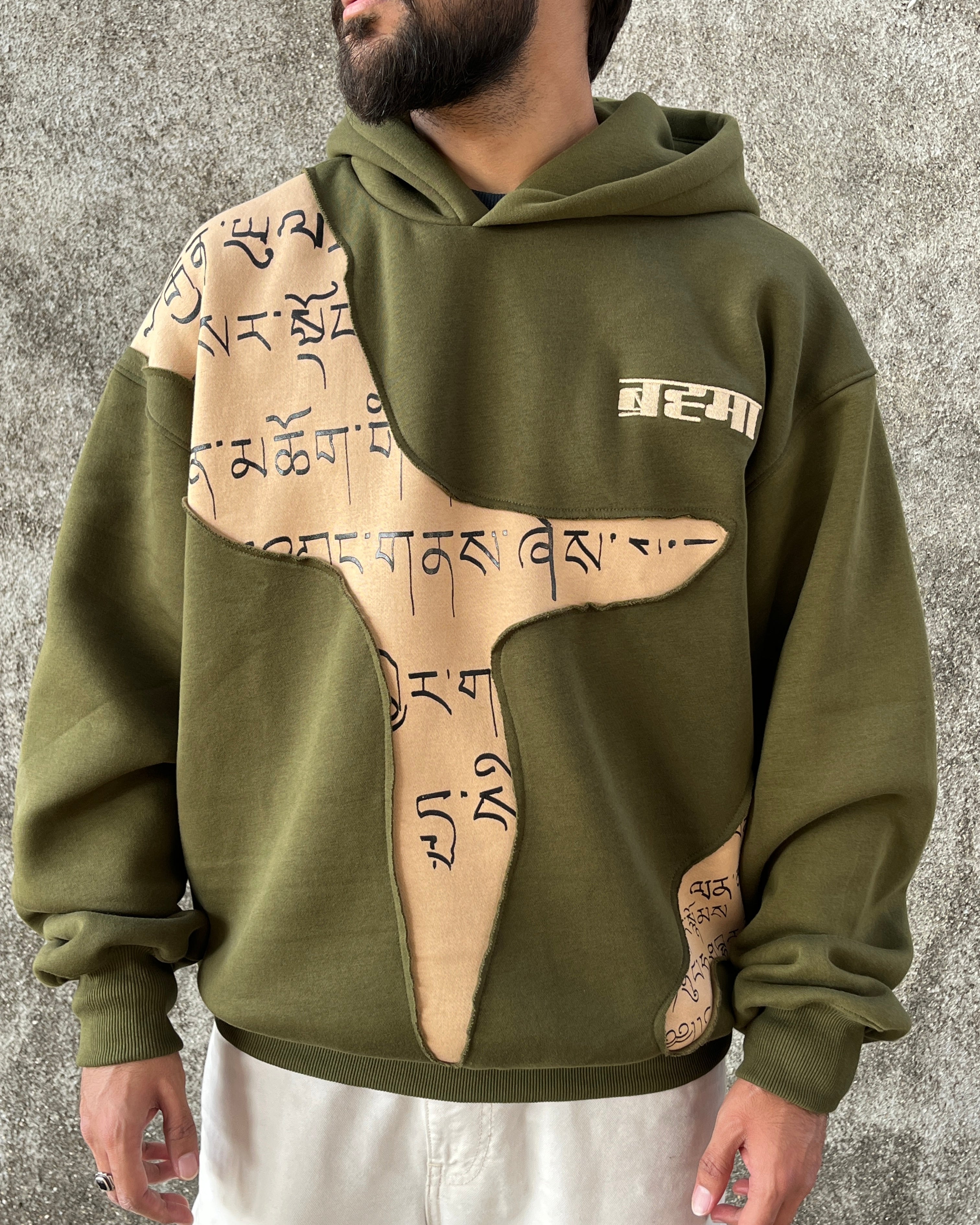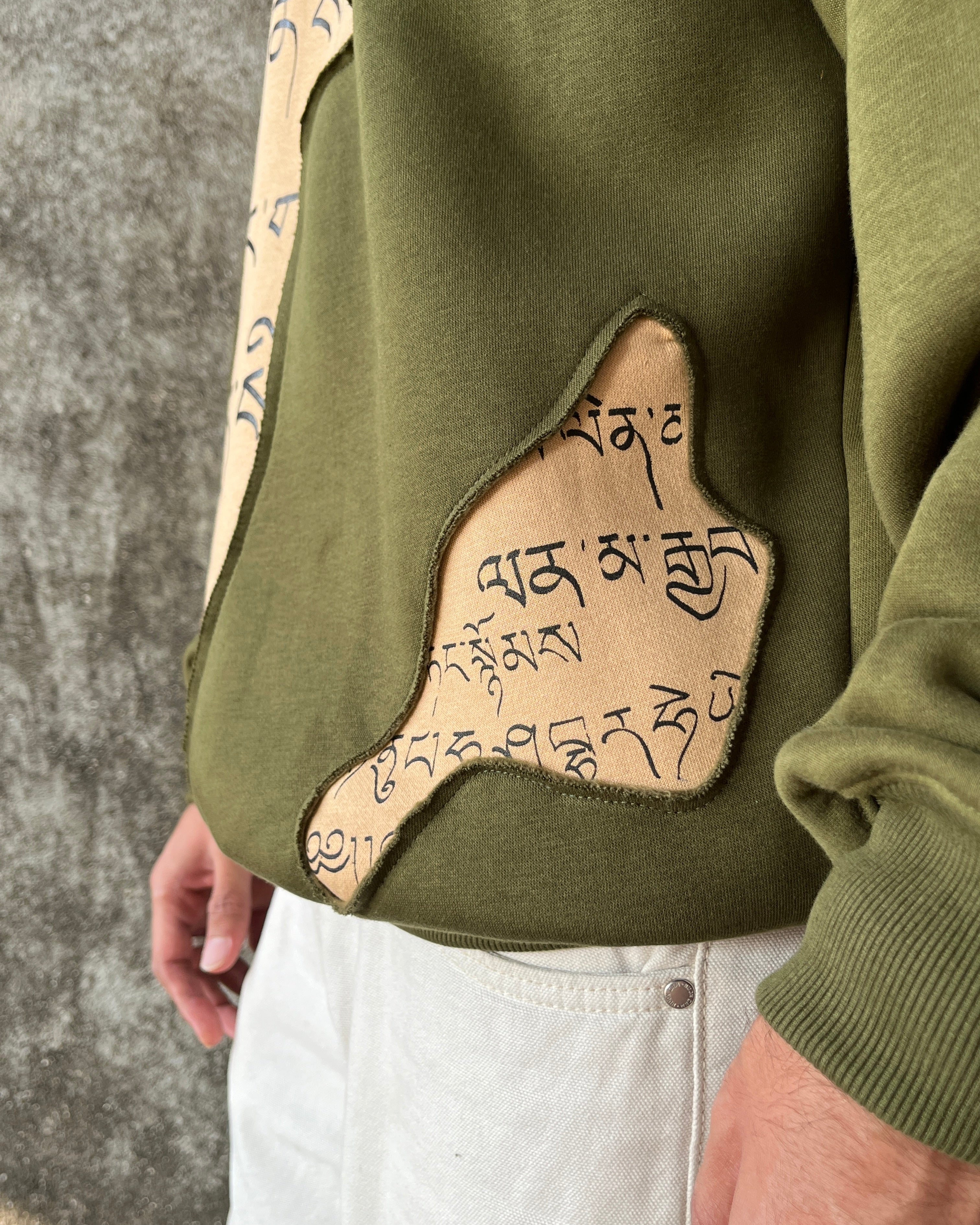The standout feature is the intricate patchwork, meticulously printed with ancient scripts that evoke mystery and depth. Each patch is strategically placed, blending history and design seamlessly. The bold "BRAHMA" embroidery on the chest adds a contemporary edge, anchoring the piece with modern branding.