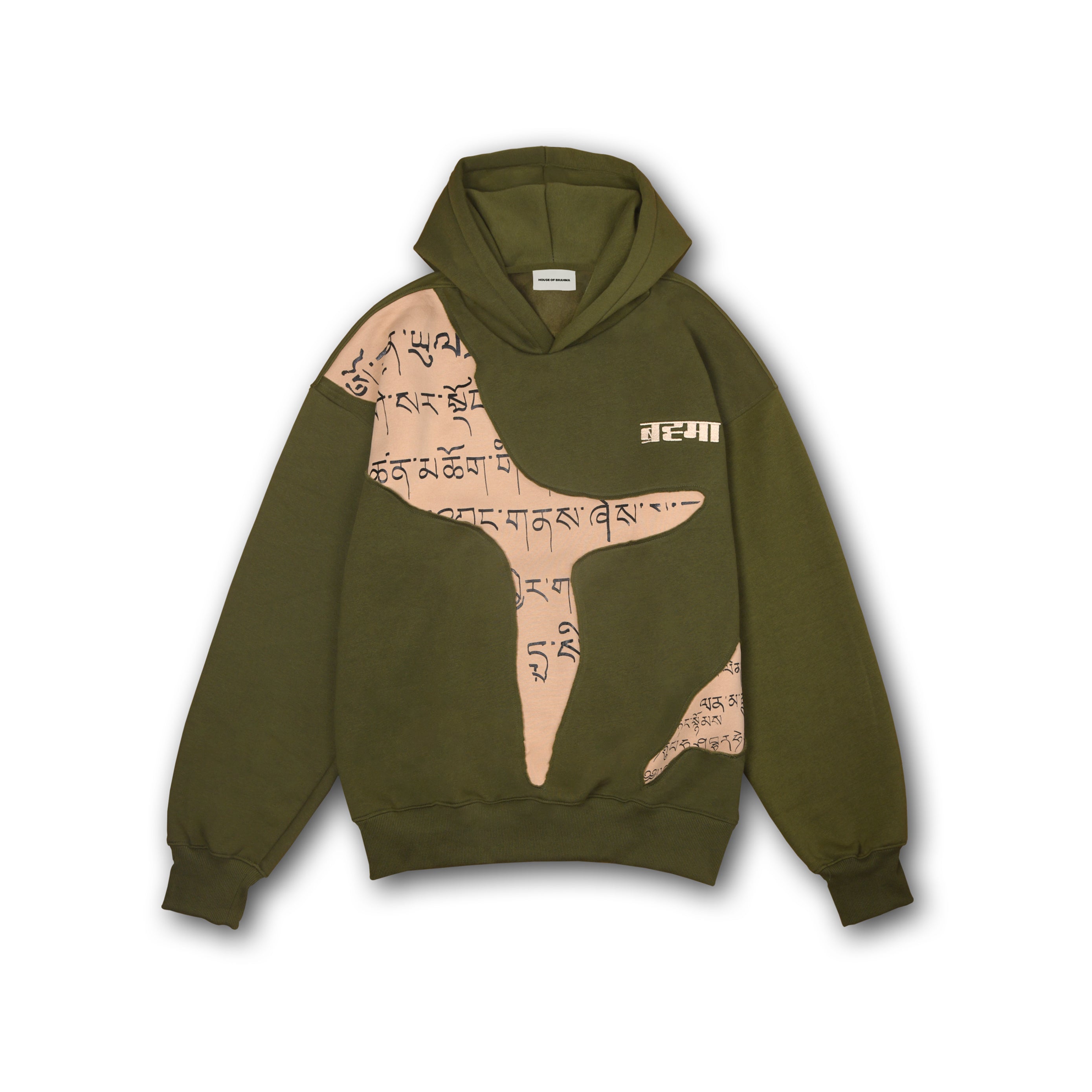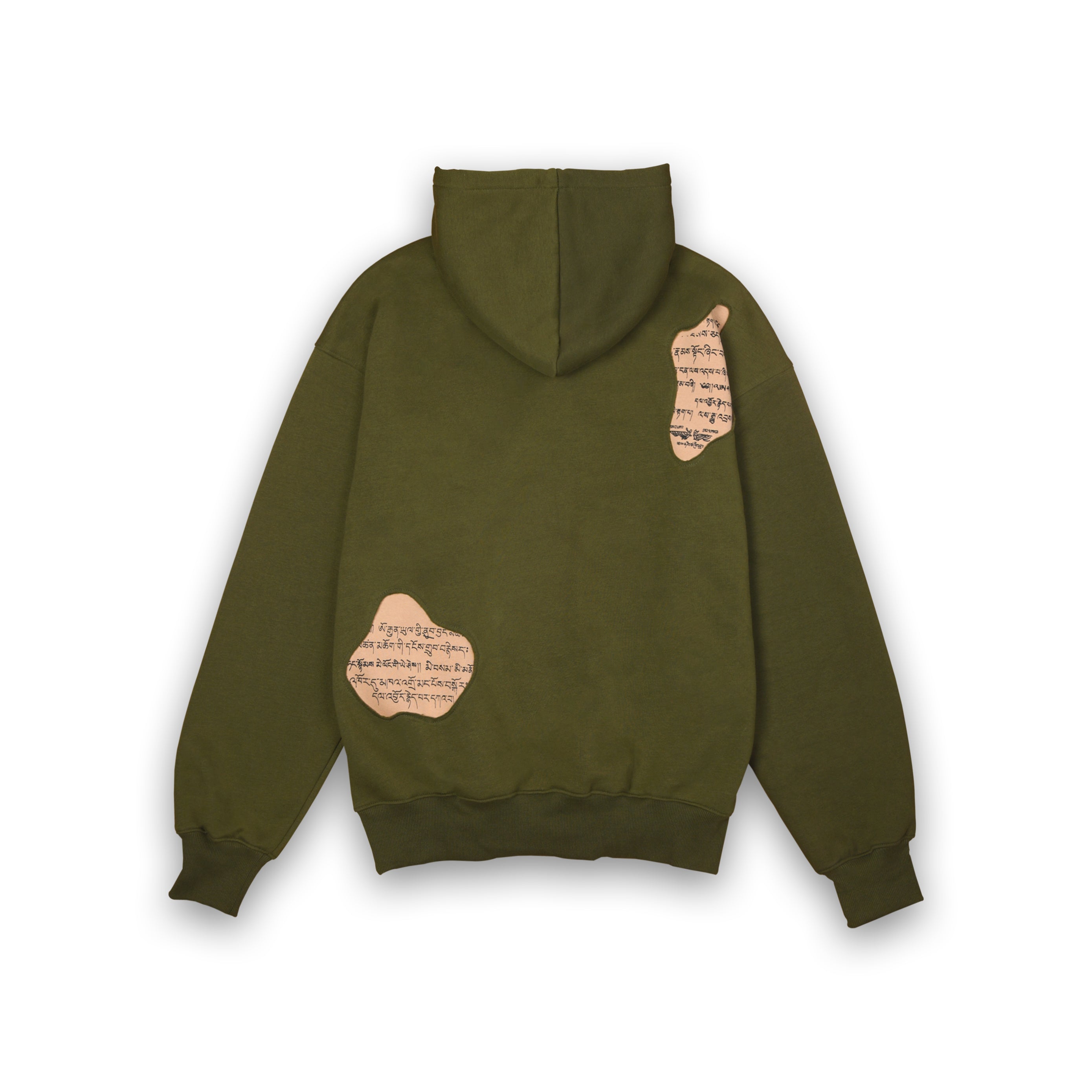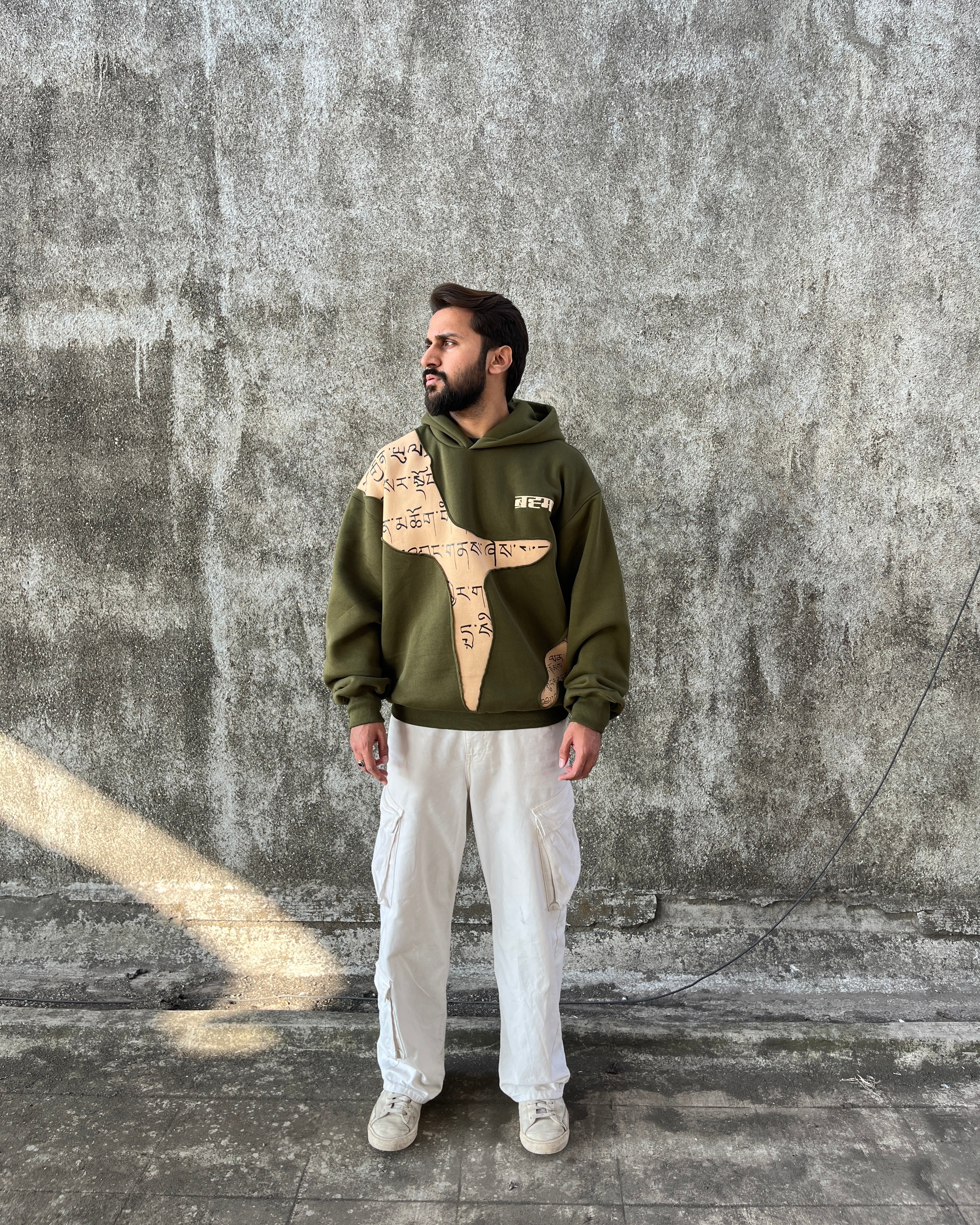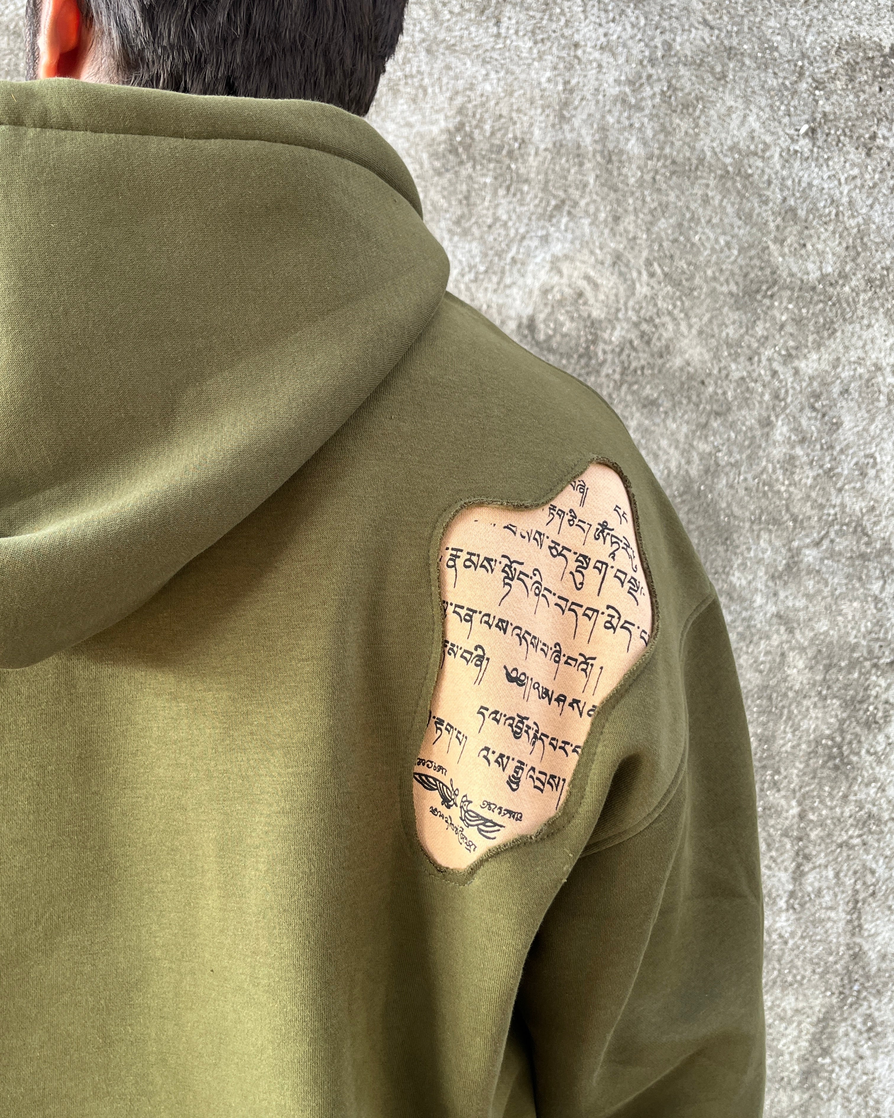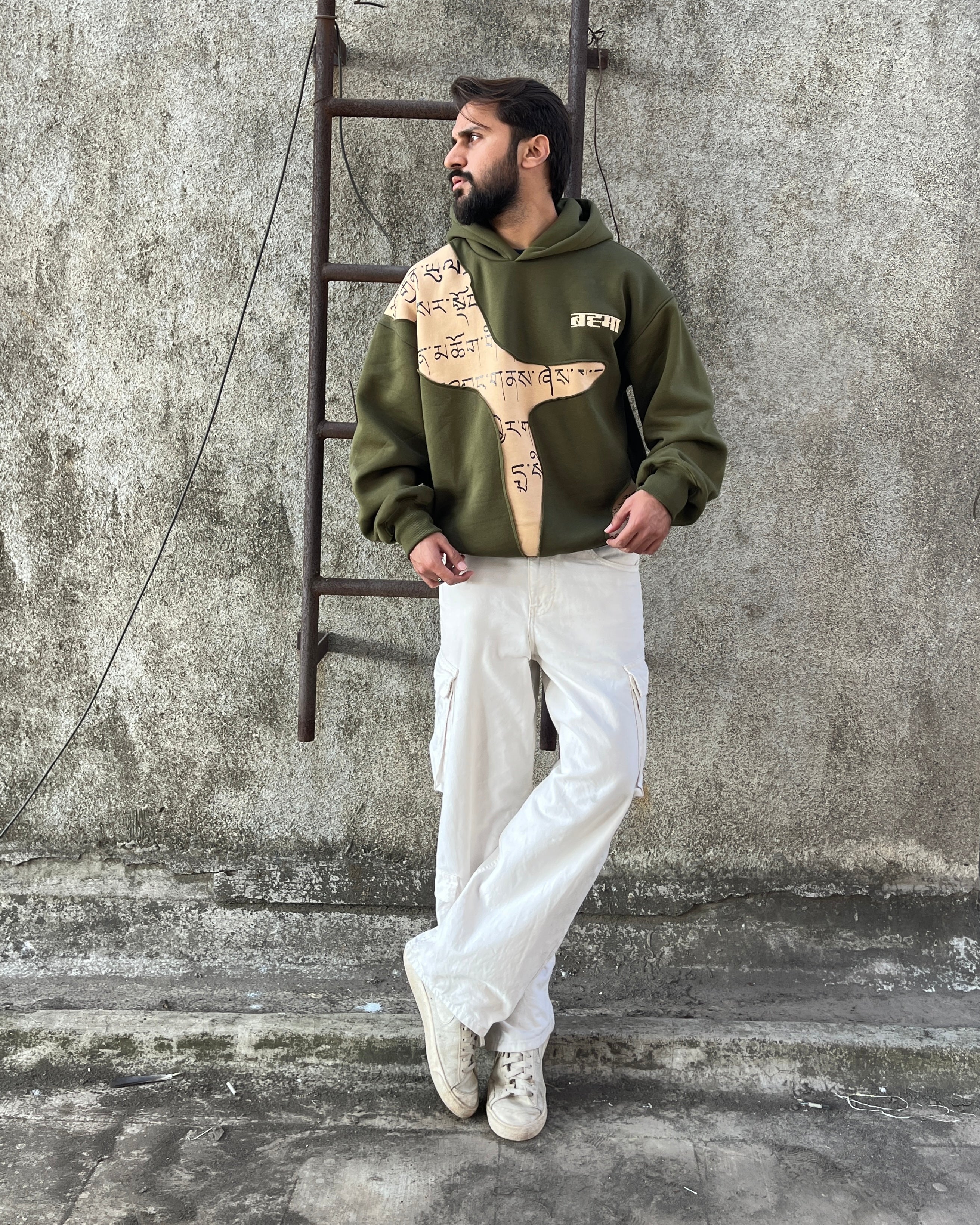 The standout feature is the intricate patchwork, meticulously printed with ancient scripts that evoke mystery and depth. Each patch is strategically placed, blending history and design seamlessly. The bold "BRAHMA" embroidery on the chest adds a contemporary edge, anchoring the piece with modern branding.
