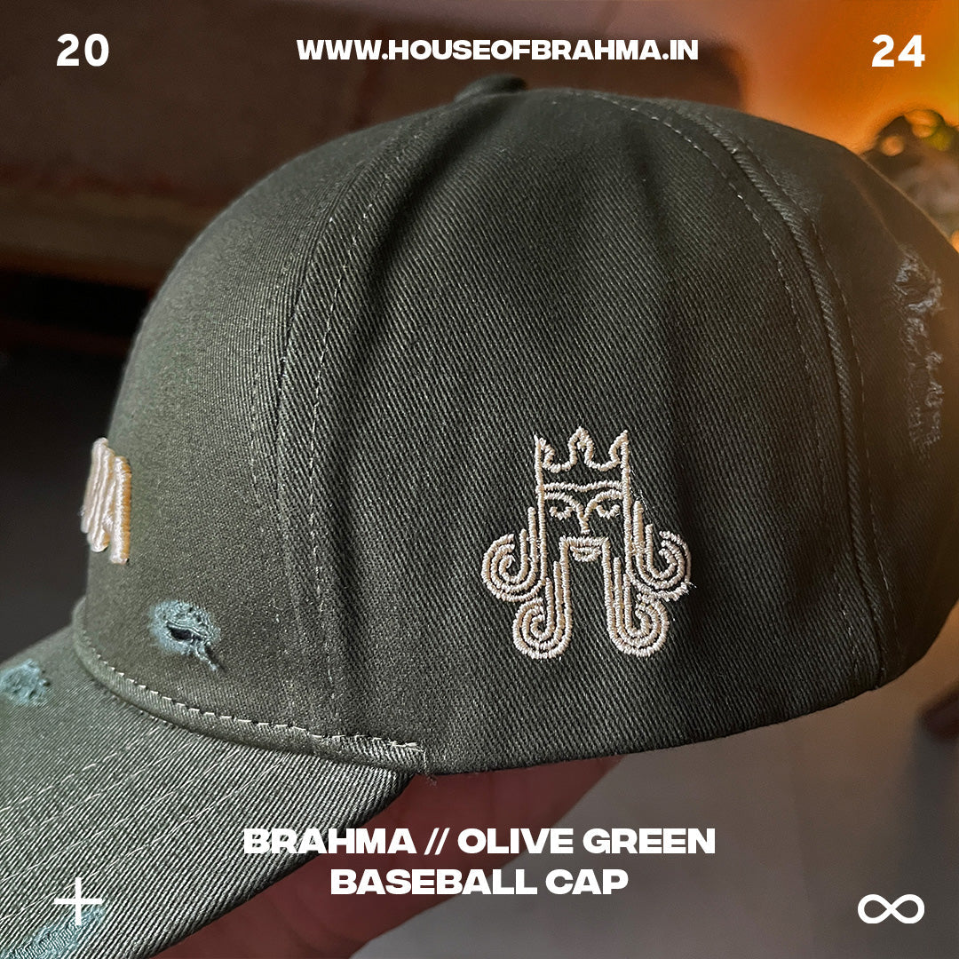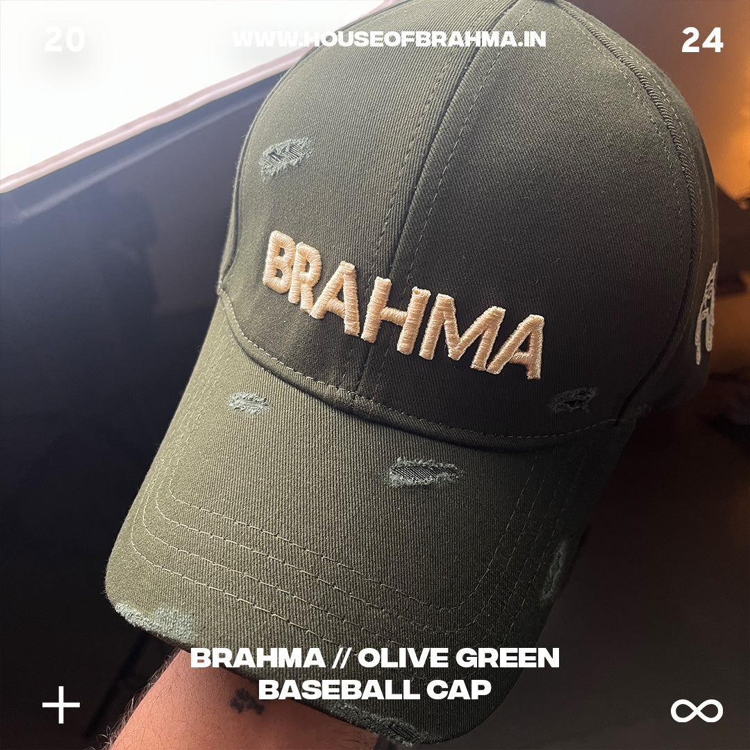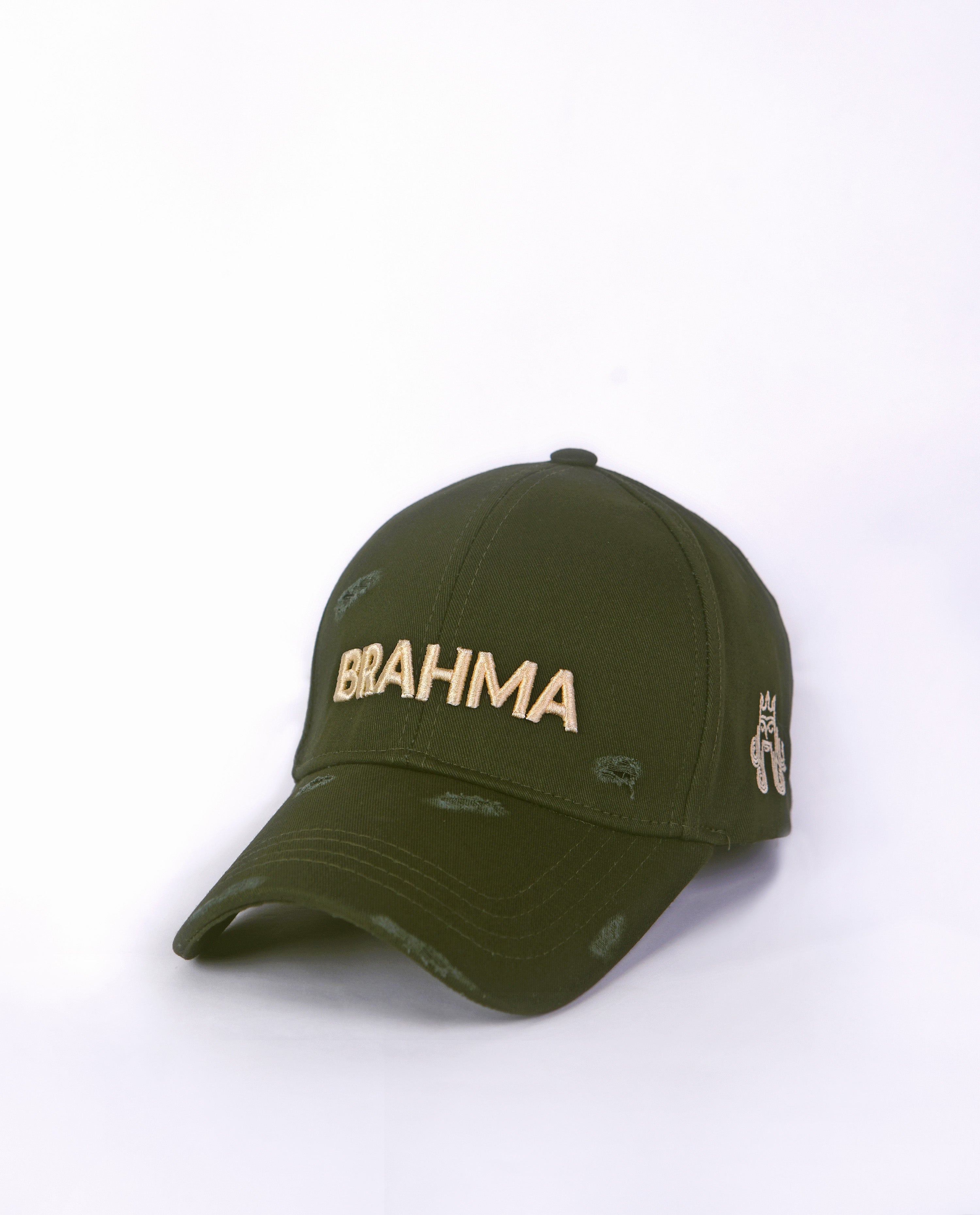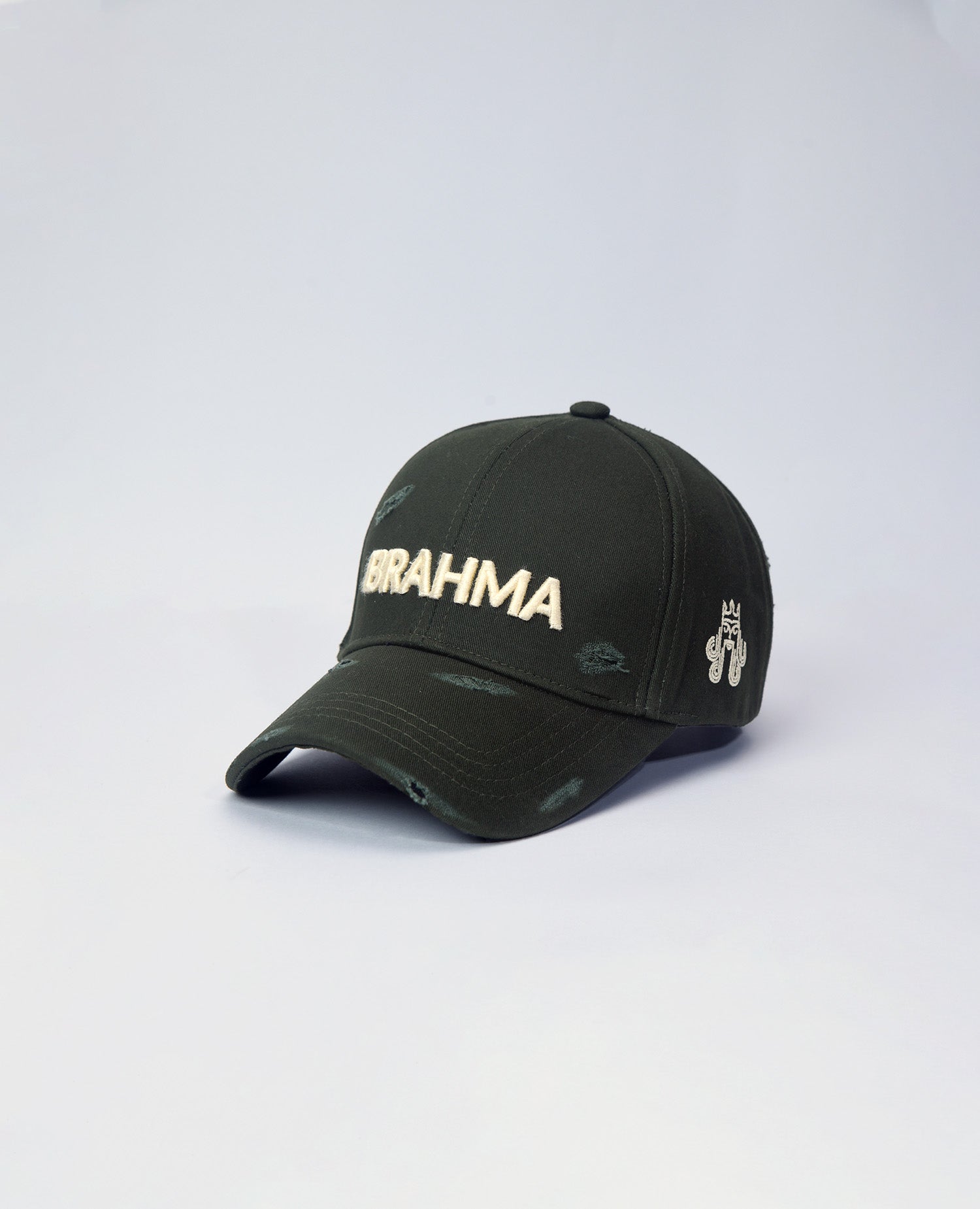 The rich olive green color adds a touch of understated elegance, making it versatile for any outfit. The cap features a bold 3D embroidered "Brahma" on the front, symbolizing strength and luxury, while the brand's logo is embroidered on the side, adding a signature touch. The unique hand-distressed details give each cap its own character, ensuring no two pieces are exactly alike.