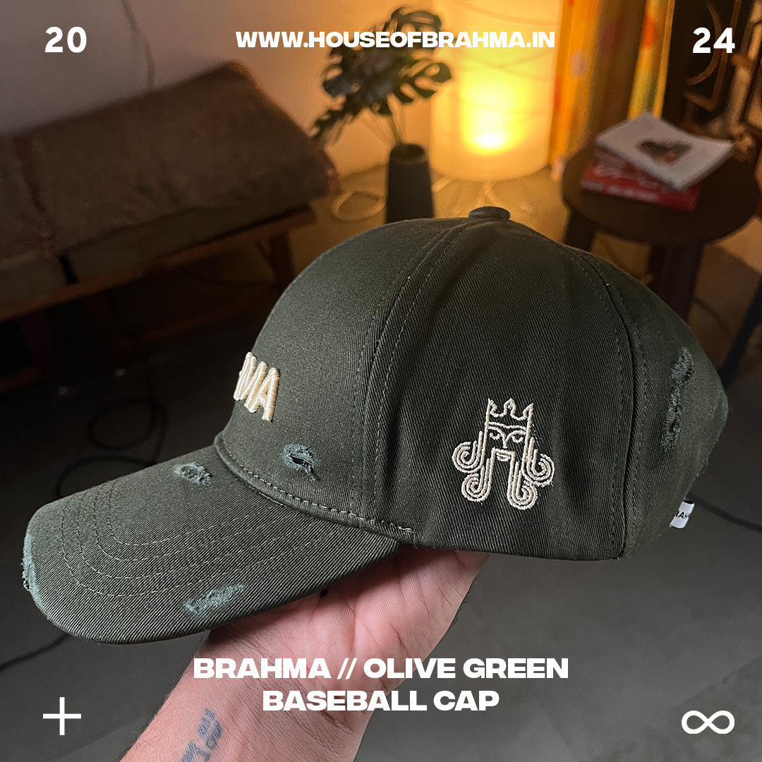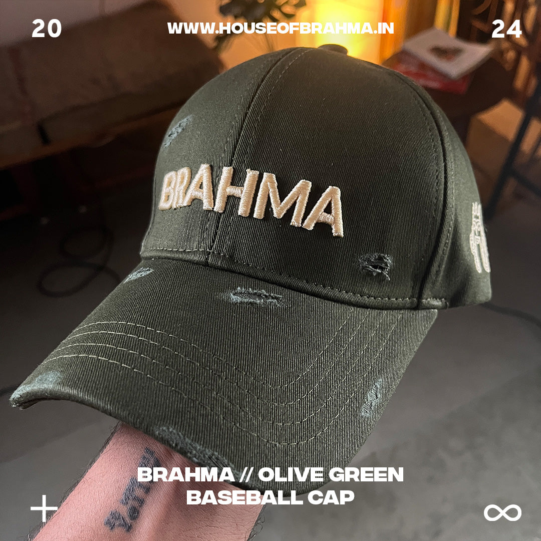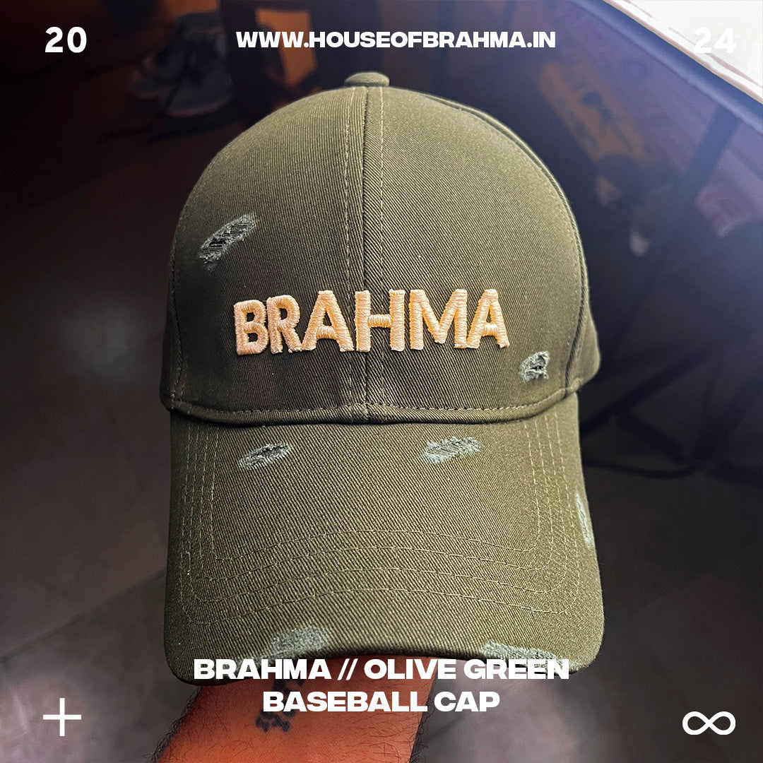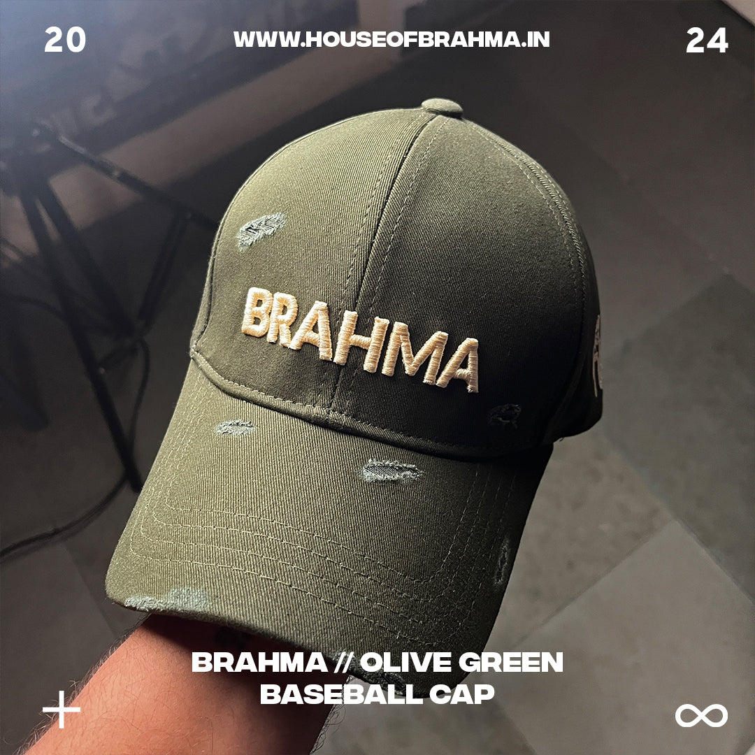 The rich olive green color adds a touch of understated elegance, making it versatile for any outfit. The cap features a bold 3D embroidered "Brahma" on the front, symbolizing strength and luxury, while the brand's logo is embroidered on the side, adding a signature touch. The unique hand-distressed details give each cap its own character, ensuring no two pieces are exactly alike.