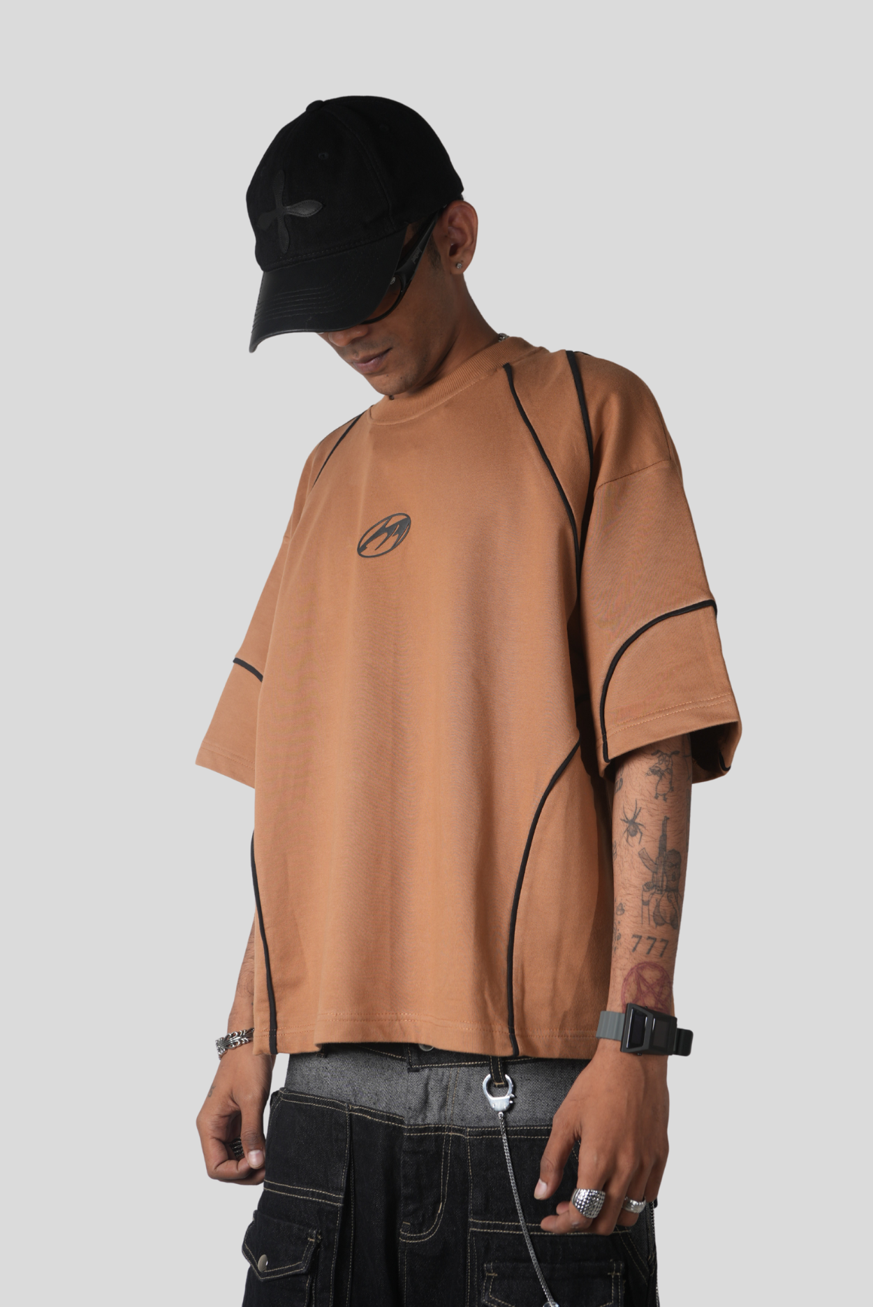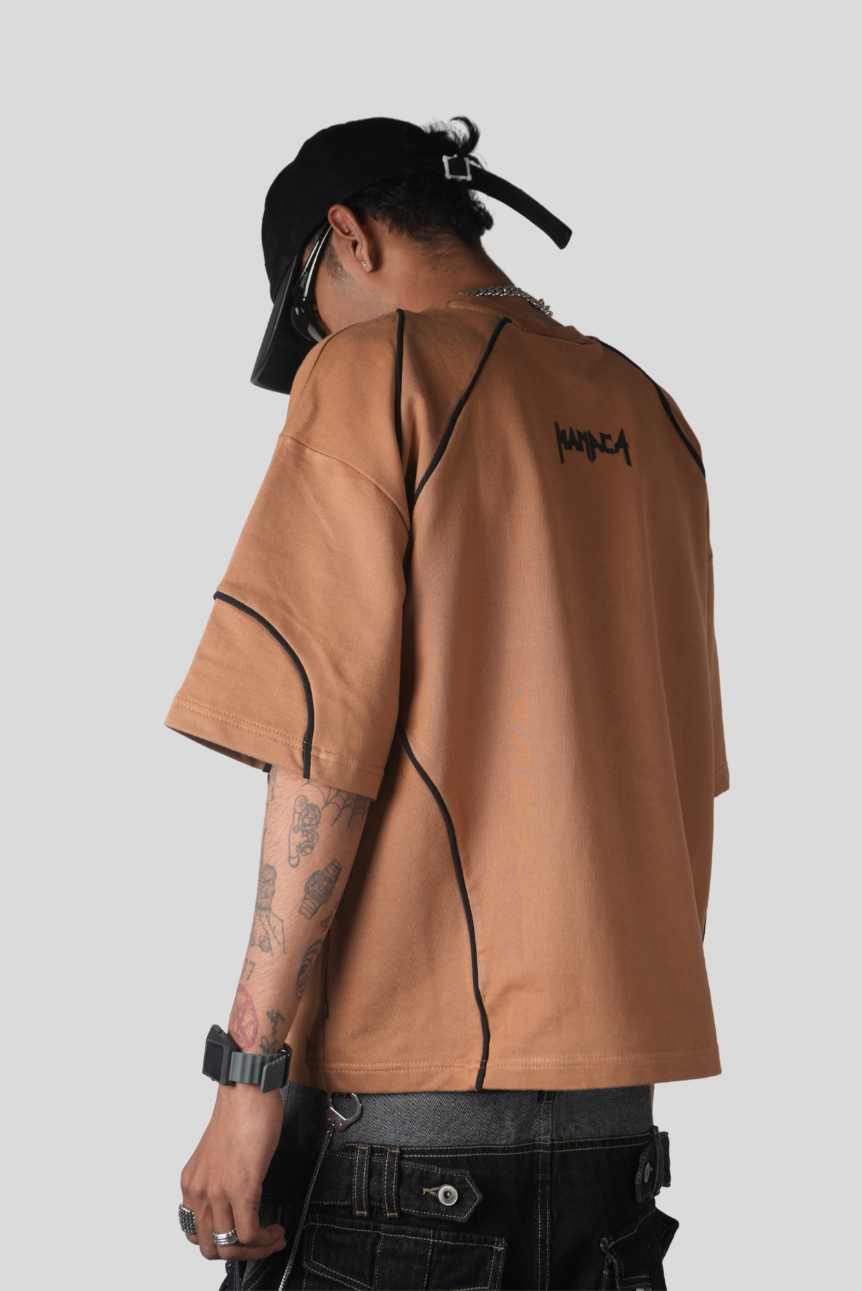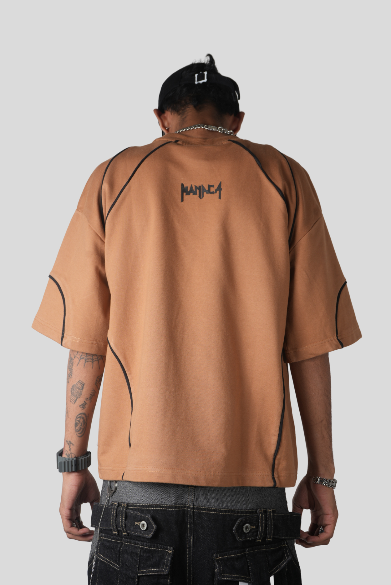 Meet BRAVO — a structured street essential made for those who walk sharp and speak loud without saying a word. Designed in a clean cocoa brown with contrast black seam piping, this tee hits different with its futuristic flow. The front carries the minimal MANACA insignia while the back flashes the brand logo in muted tonal print. The cutline paneling gives this piece a tech-core edge that levels up any fit, from underground raves to rooftop runs.