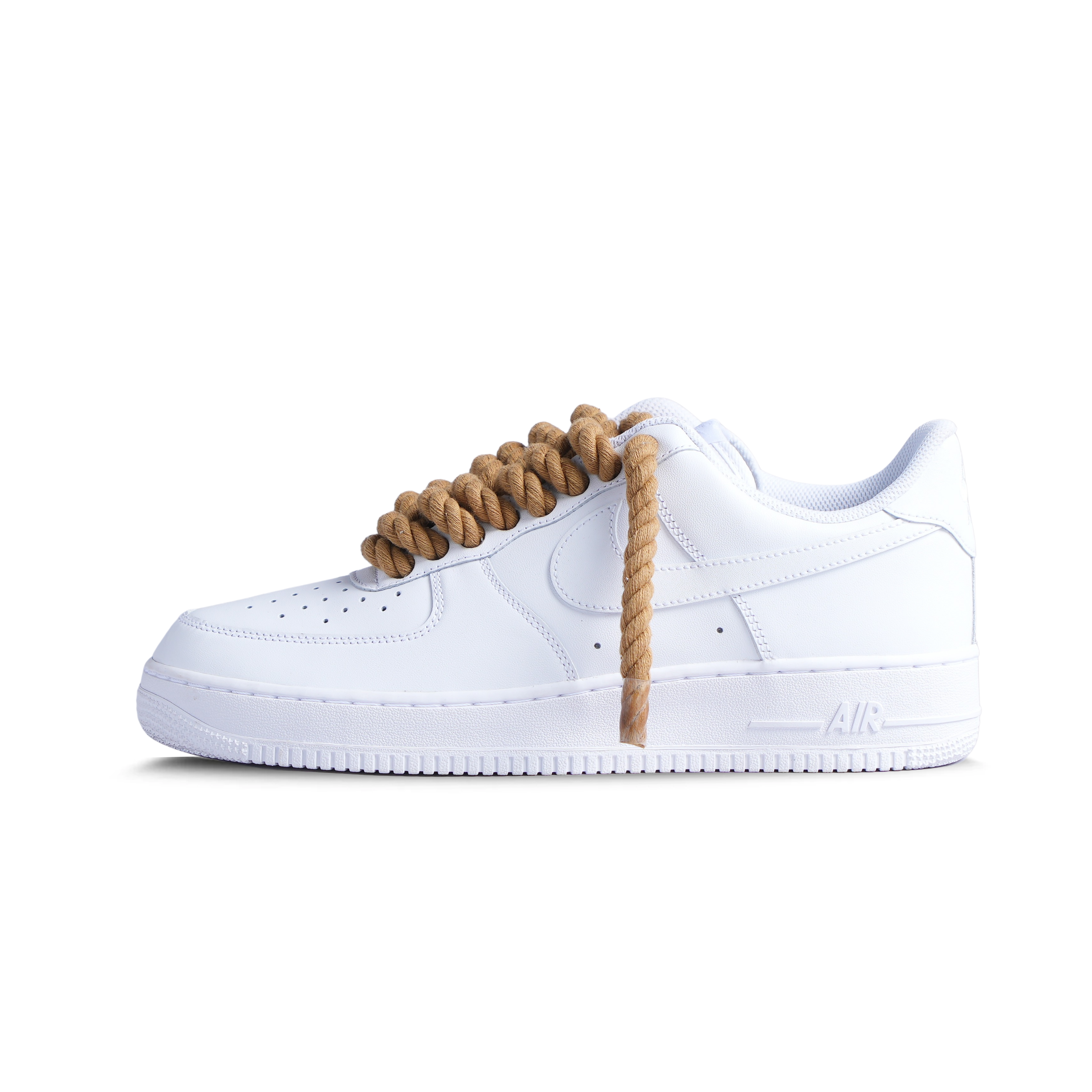 Step up your sneaker game with the BROWN ROPE AF1! These triple white AF1s come with our fan favourite chunky rope laces, making them the perfect addition to any sneaker collection.