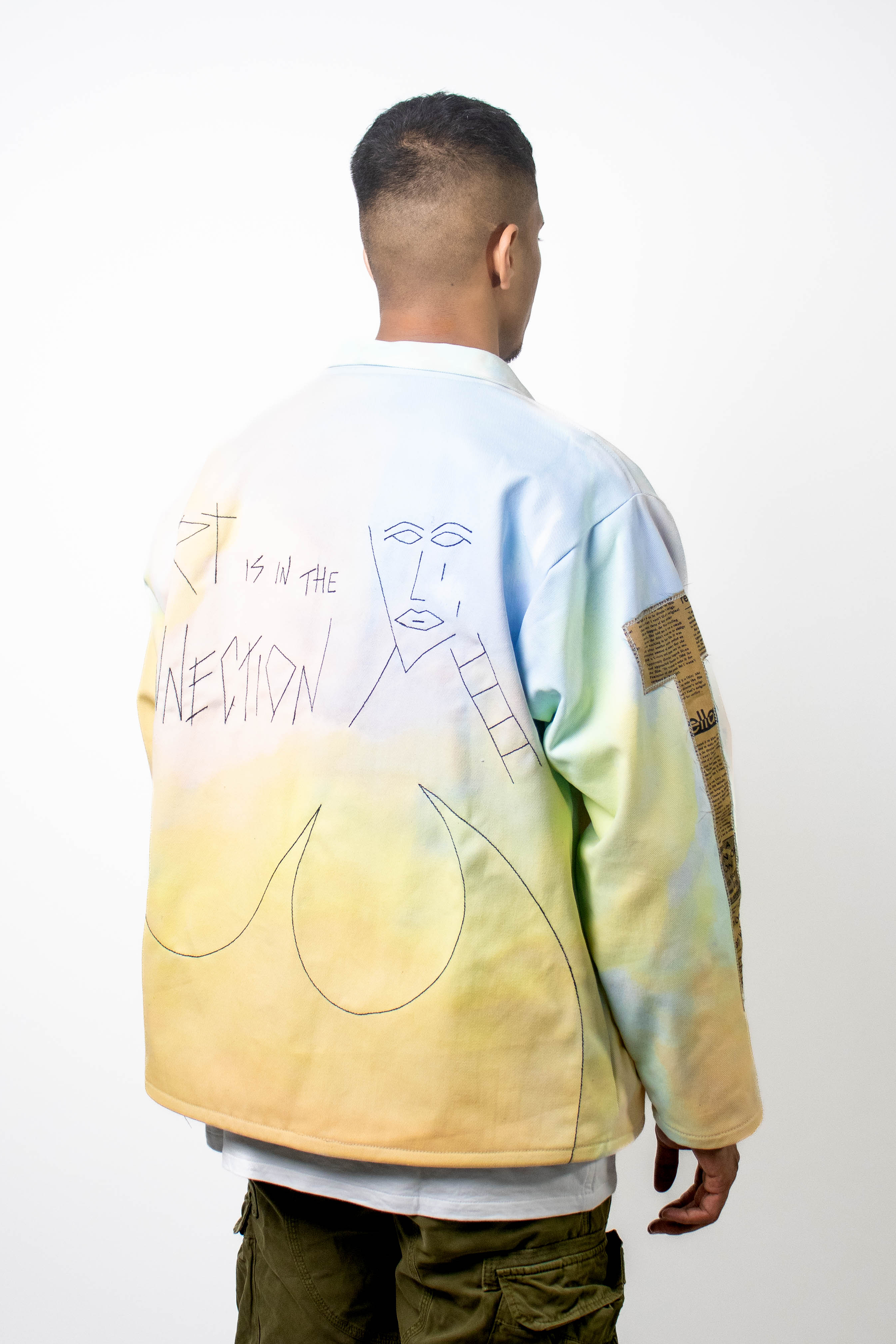 This hand painted jacket is a blank canvas where you paint your own story. Prepared on a denim base fabrics and hand painted with a pastel mix, this jacket features embroidered designs and patchwork branding on sleeves.