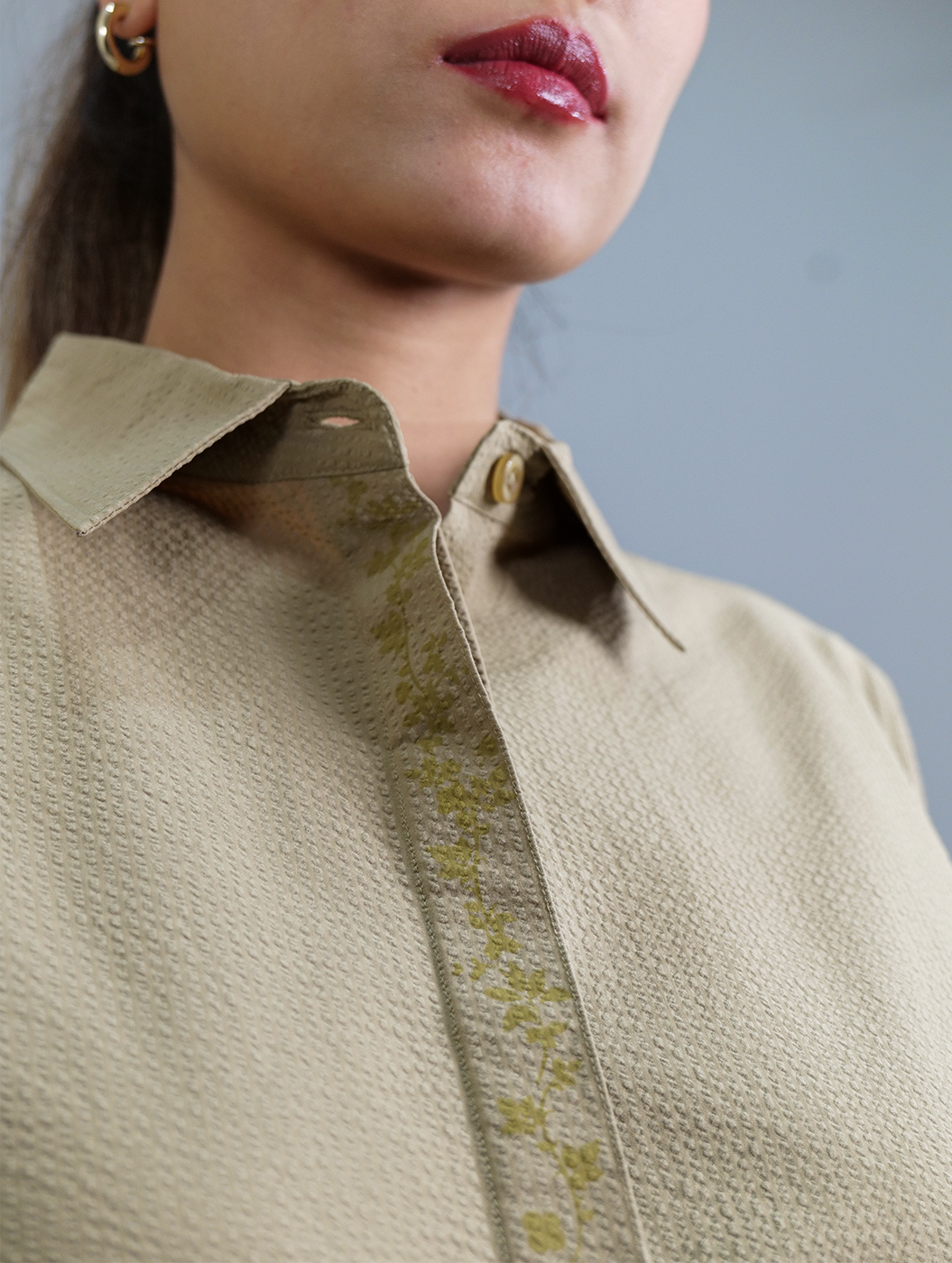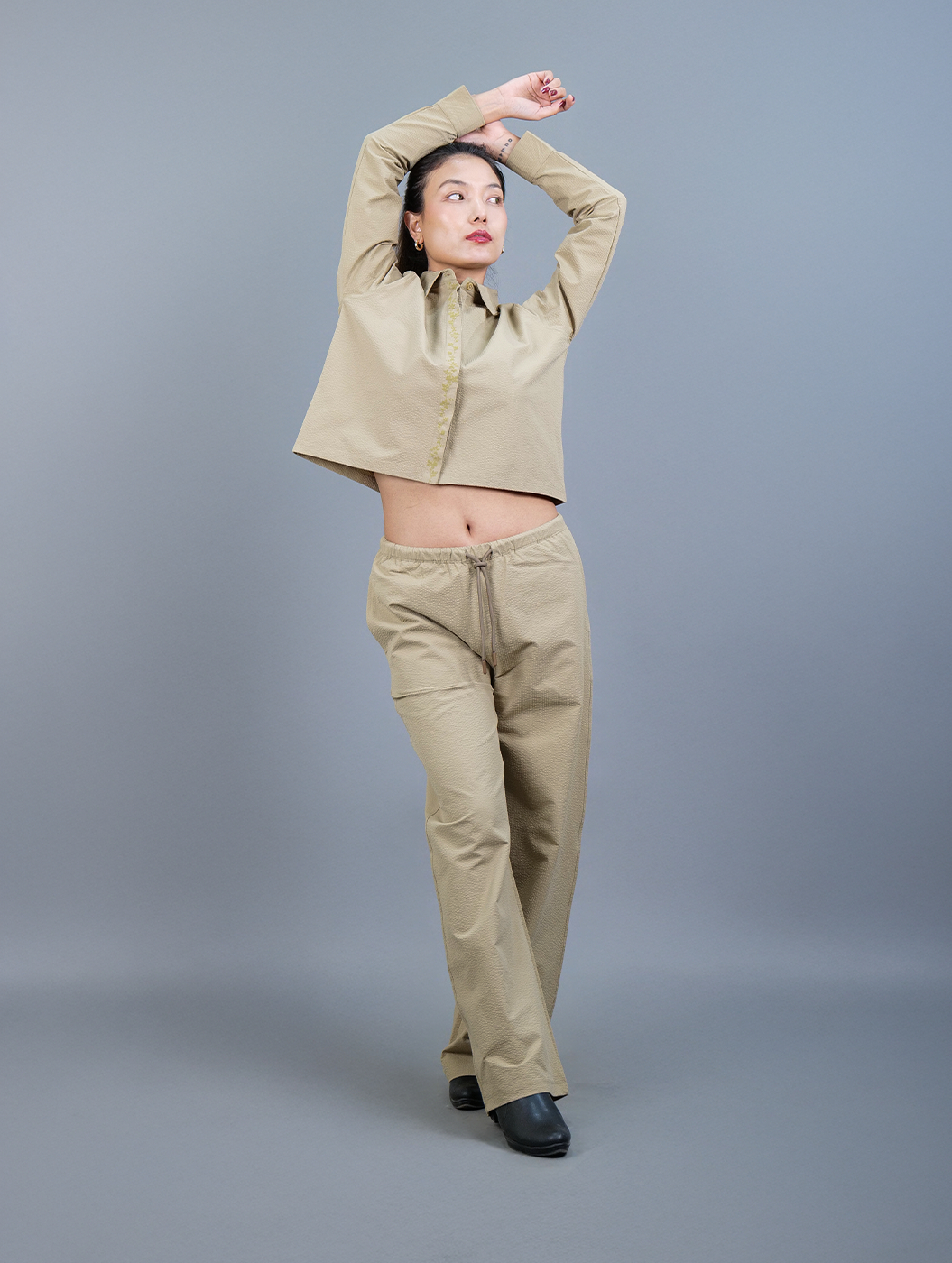 Featuring a perfect blend of texture and structure. The cropped shirt features intricate carrel button detailing and subtle floral print on placket, paired with effortlessly adjustable pants with roomy pockets. A refined yet relaxed loungewear set in warm caramel tone.