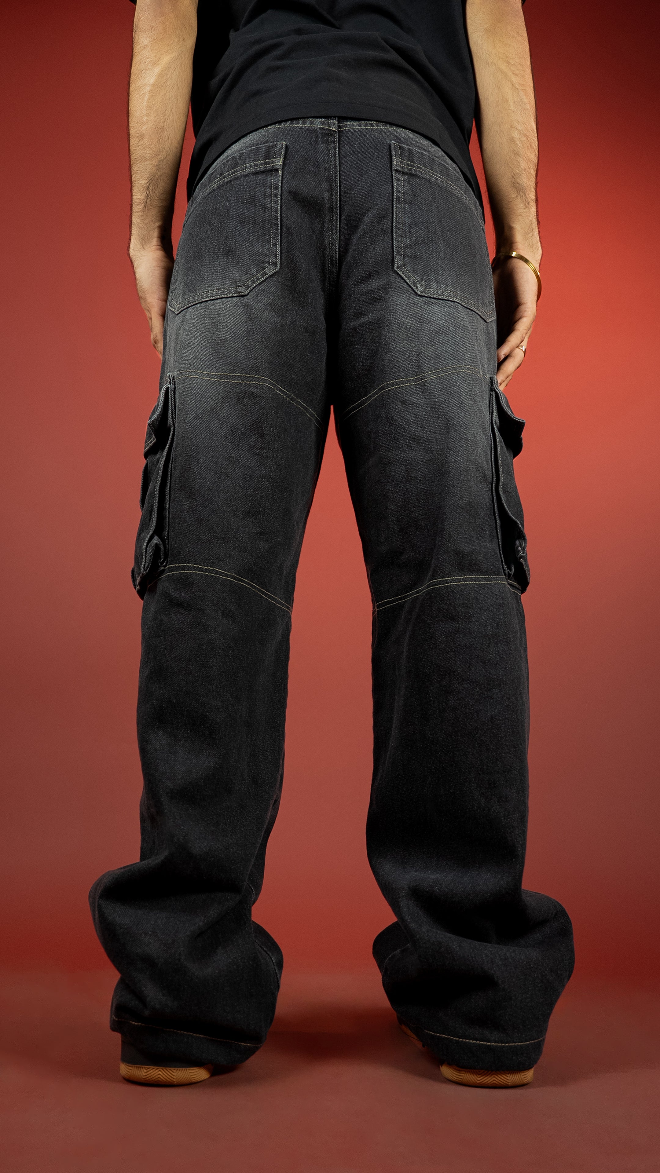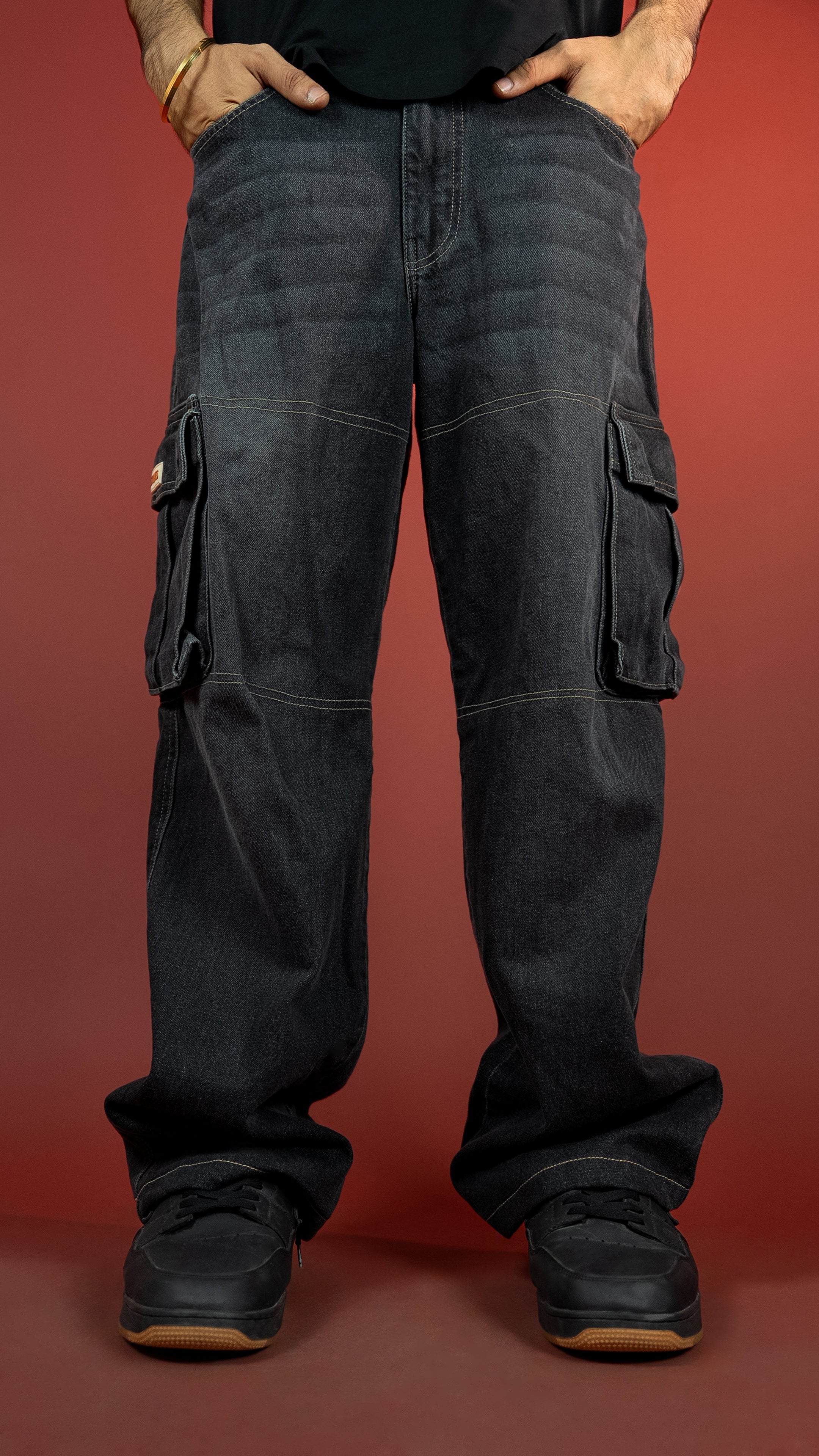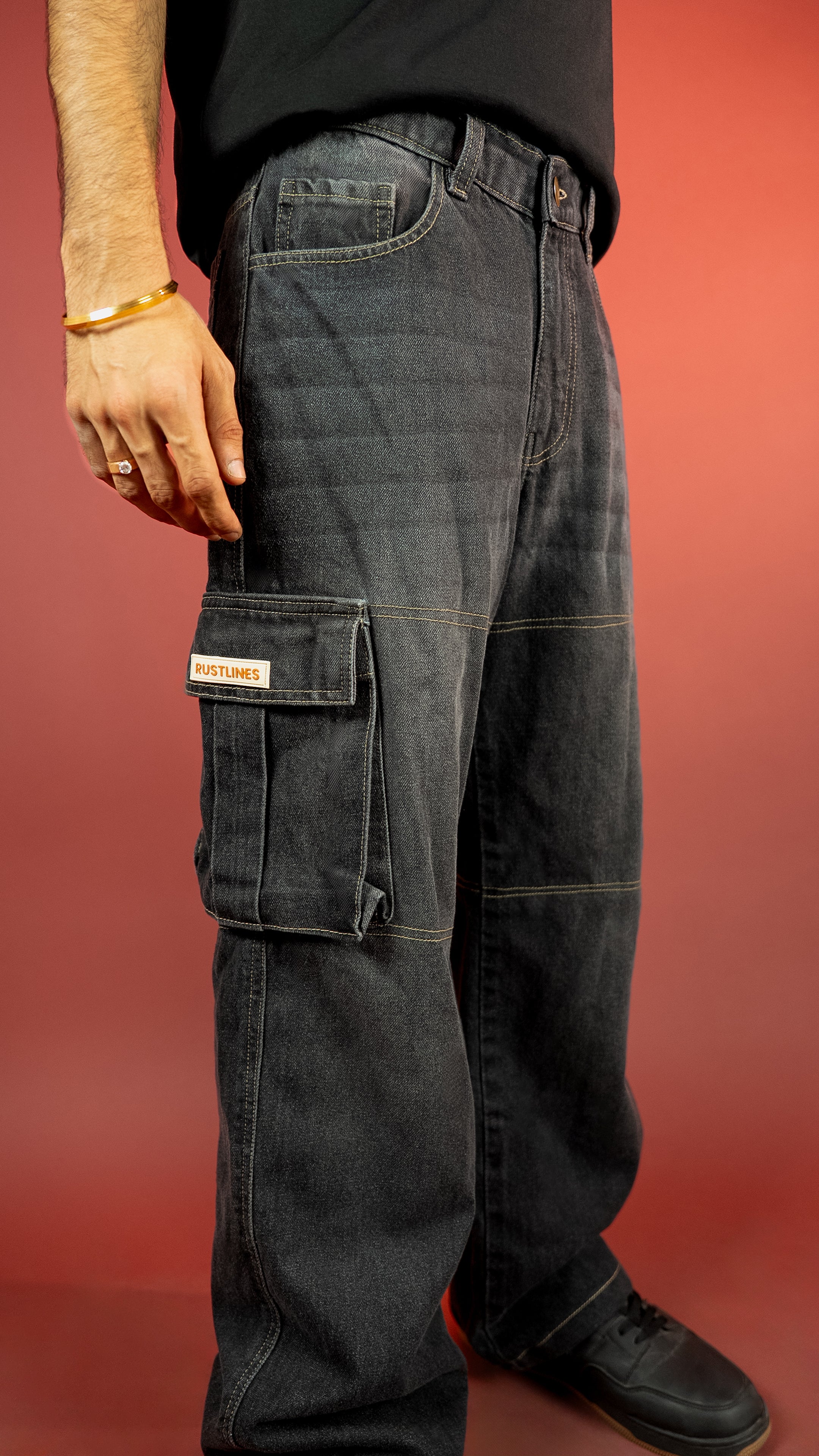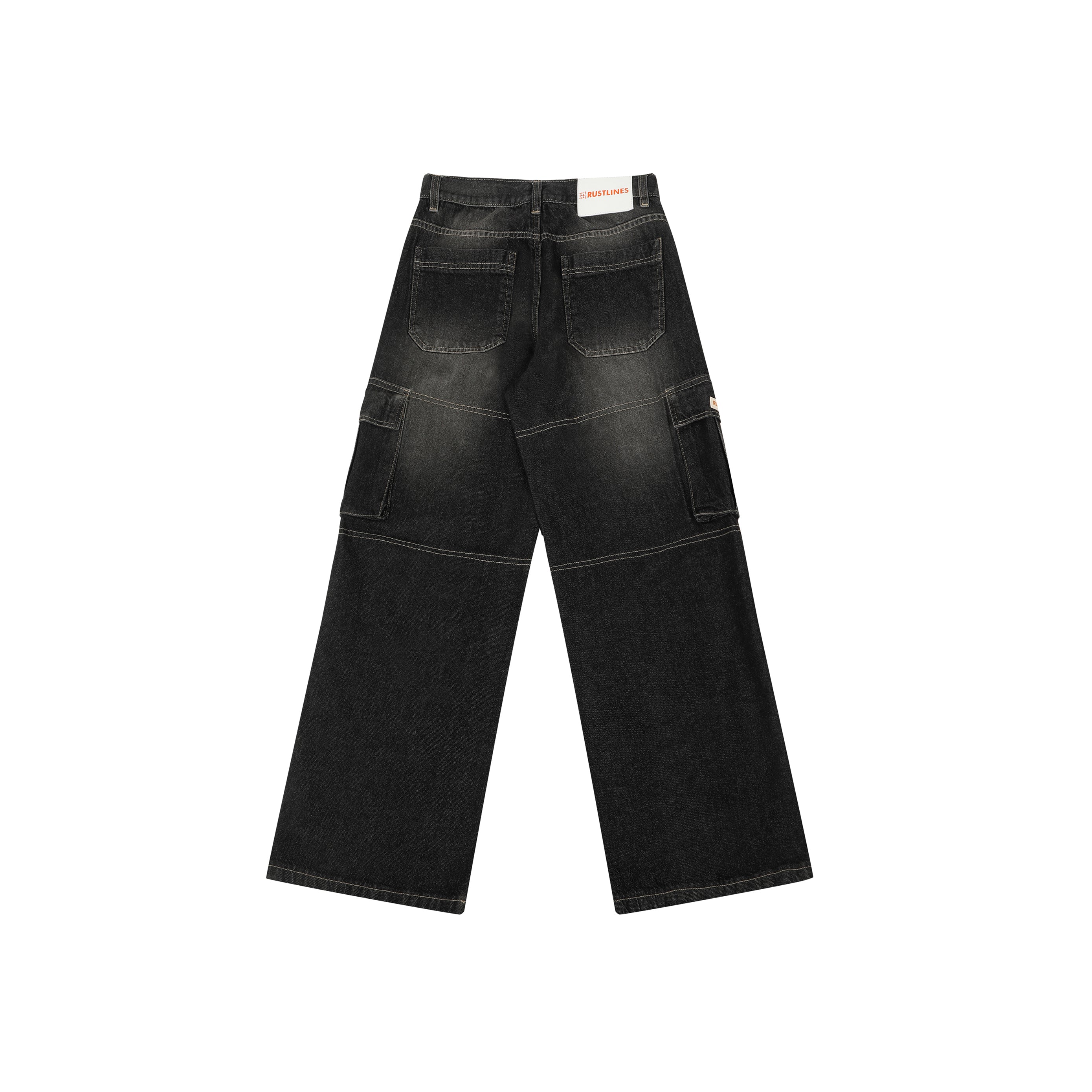 These 13-oz non-stretch carbon black cargos come with a potassium permanganate spray wash and whisker effects for that perfectly worn-in texture. Built in a baggy fit with contrast stitch highlights, secured with YKK zippers, and packed with utilitarian DNA — this piece walks the line between vintage workwear and modern street.