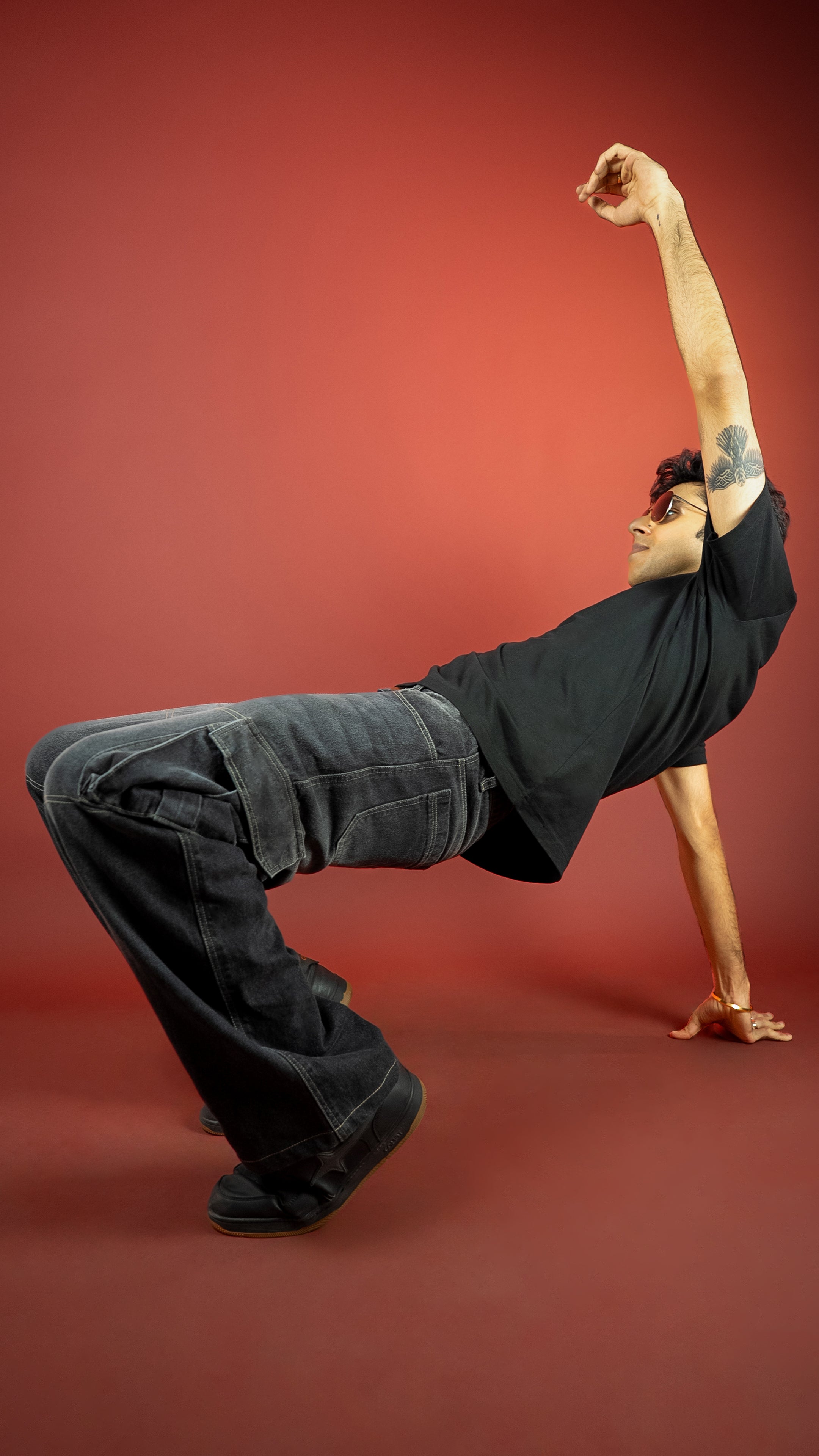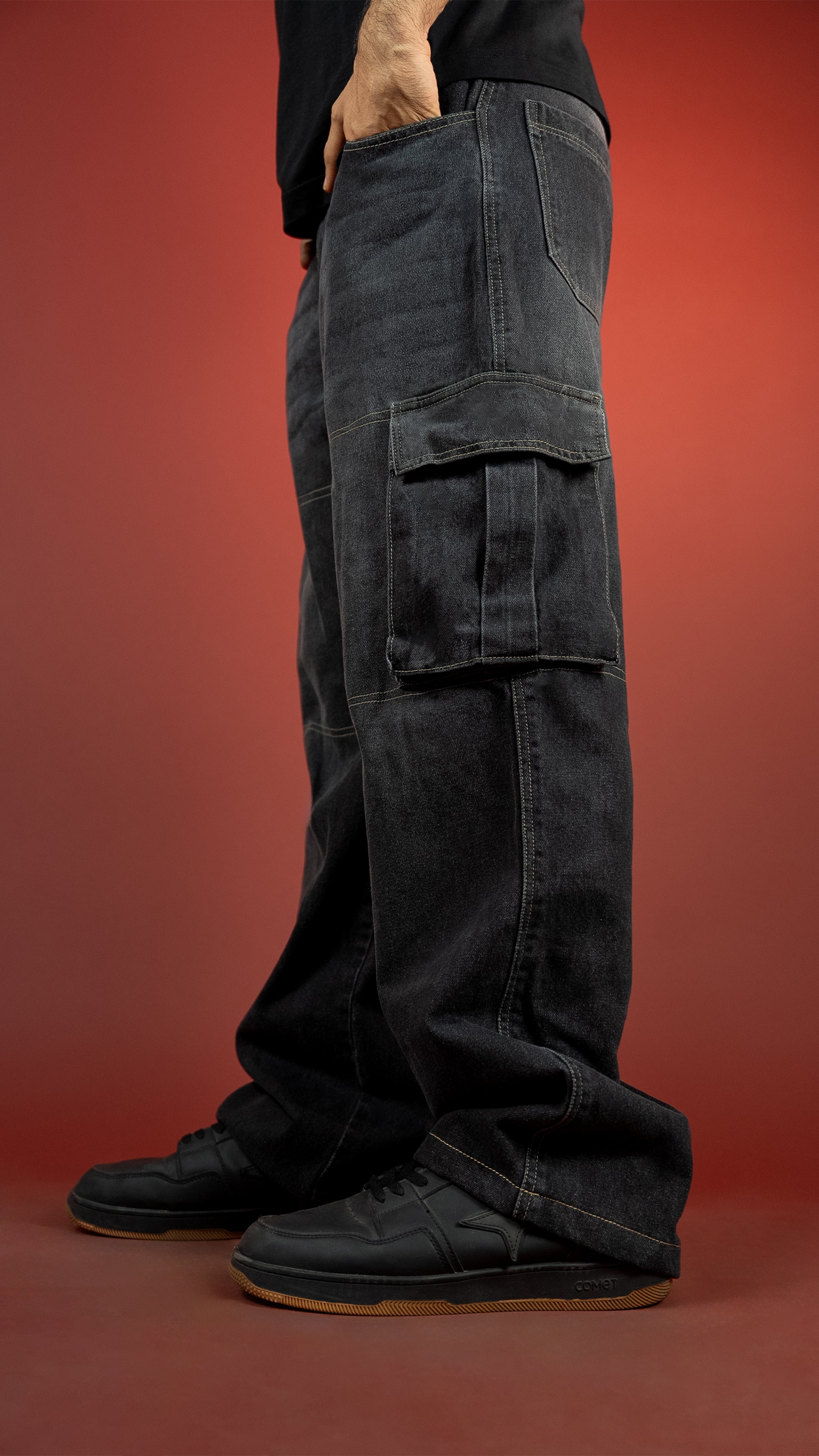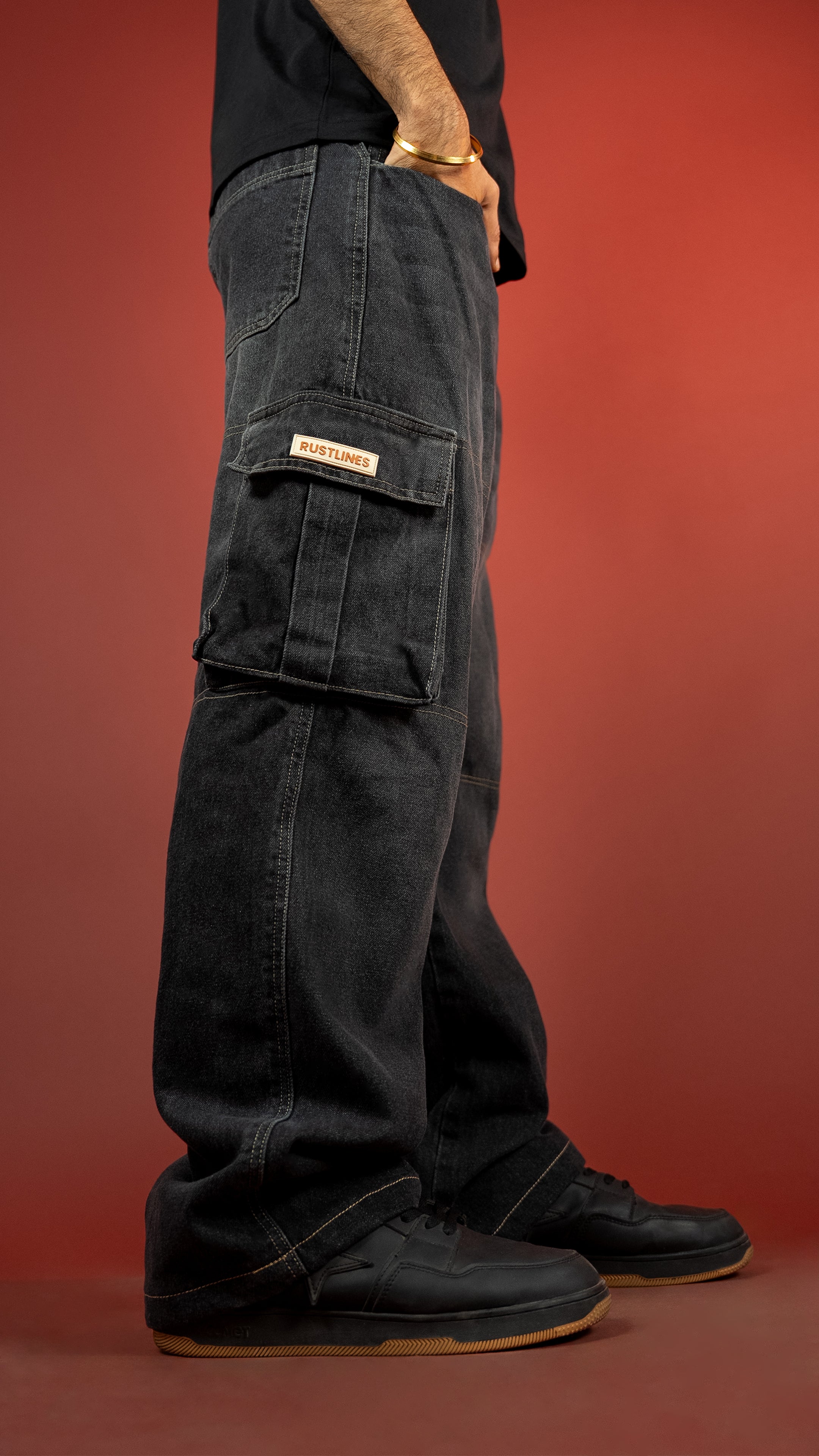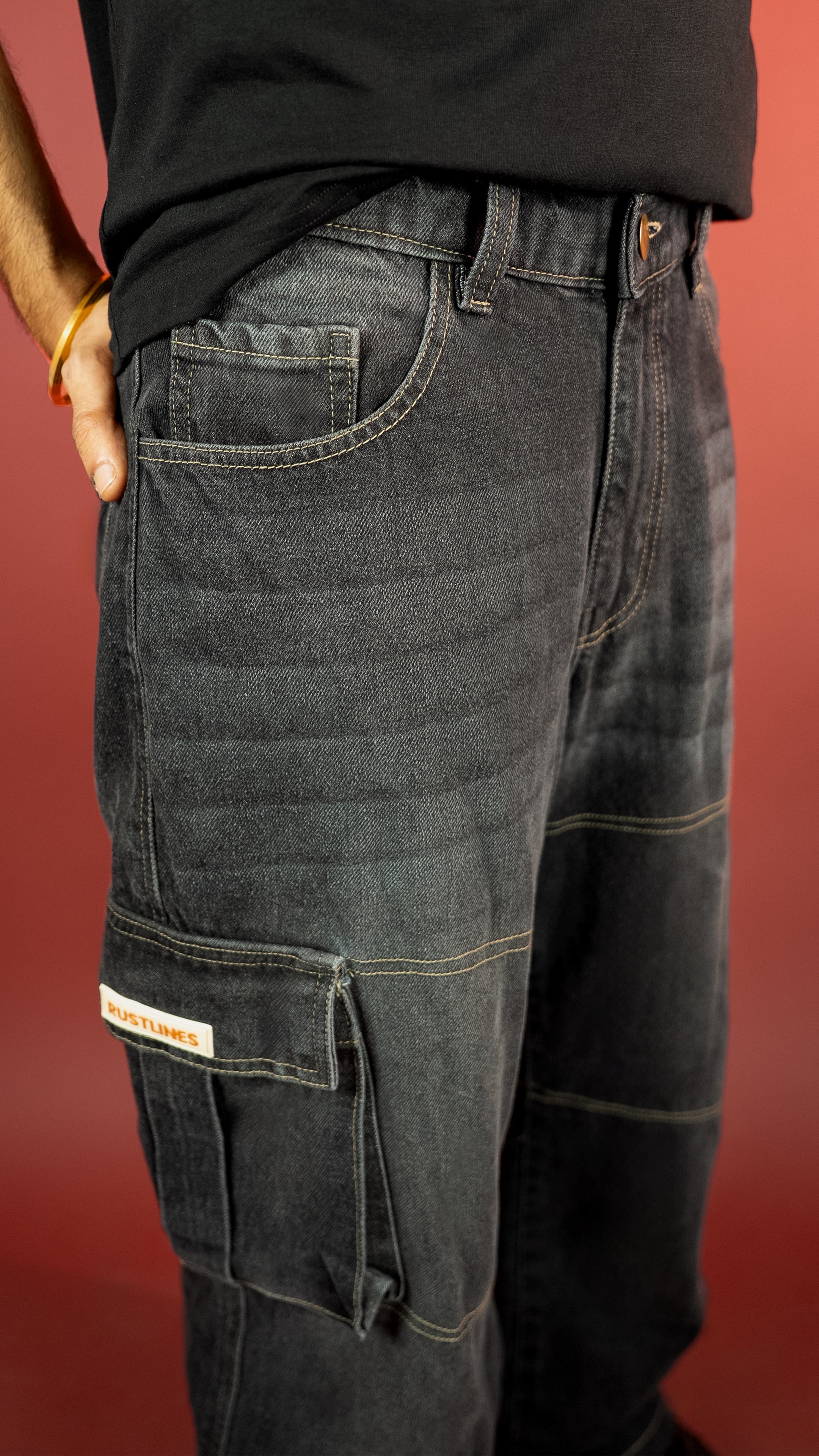 These 13-oz non-stretch carbon black cargos come with a potassium permanganate spray wash and whisker effects for that perfectly worn-in texture. Built in a baggy fit with contrast stitch highlights, secured with YKK zippers, and packed with utilitarian DNA — this piece walks the line between vintage workwear and modern street.