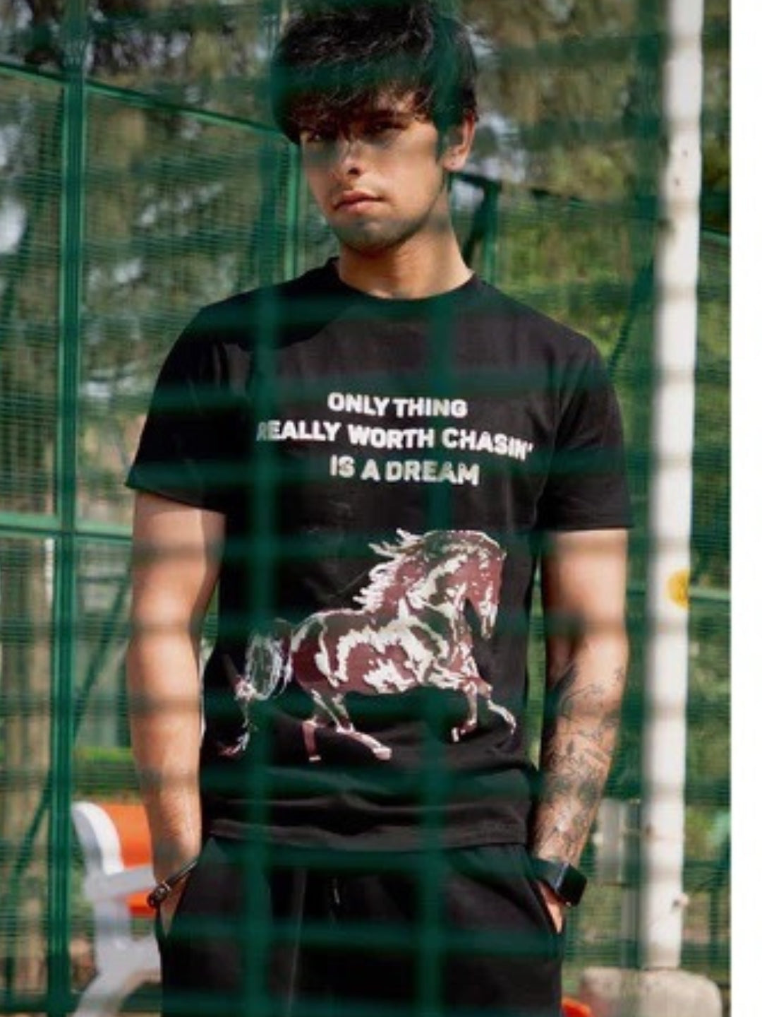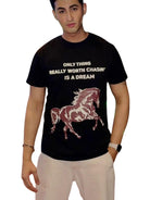 A part of Our Limited Collection, Unisex Black Regular Fit T-Shirt with crewneck and fitted sleeves. Text and design printed on Front, Logo printed at back. Our custom design aims to fuel ambitions and urges You to go after your Dreams!