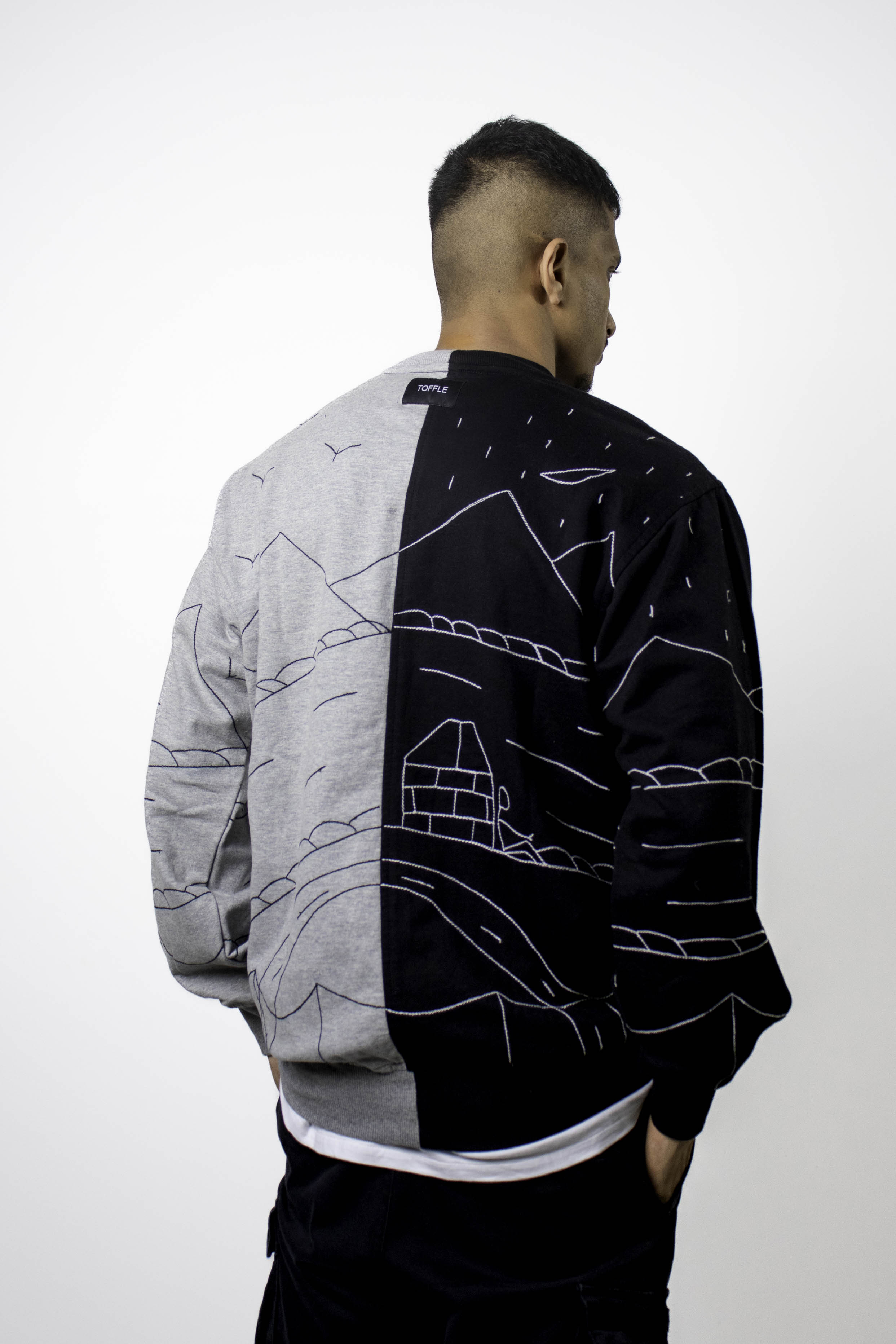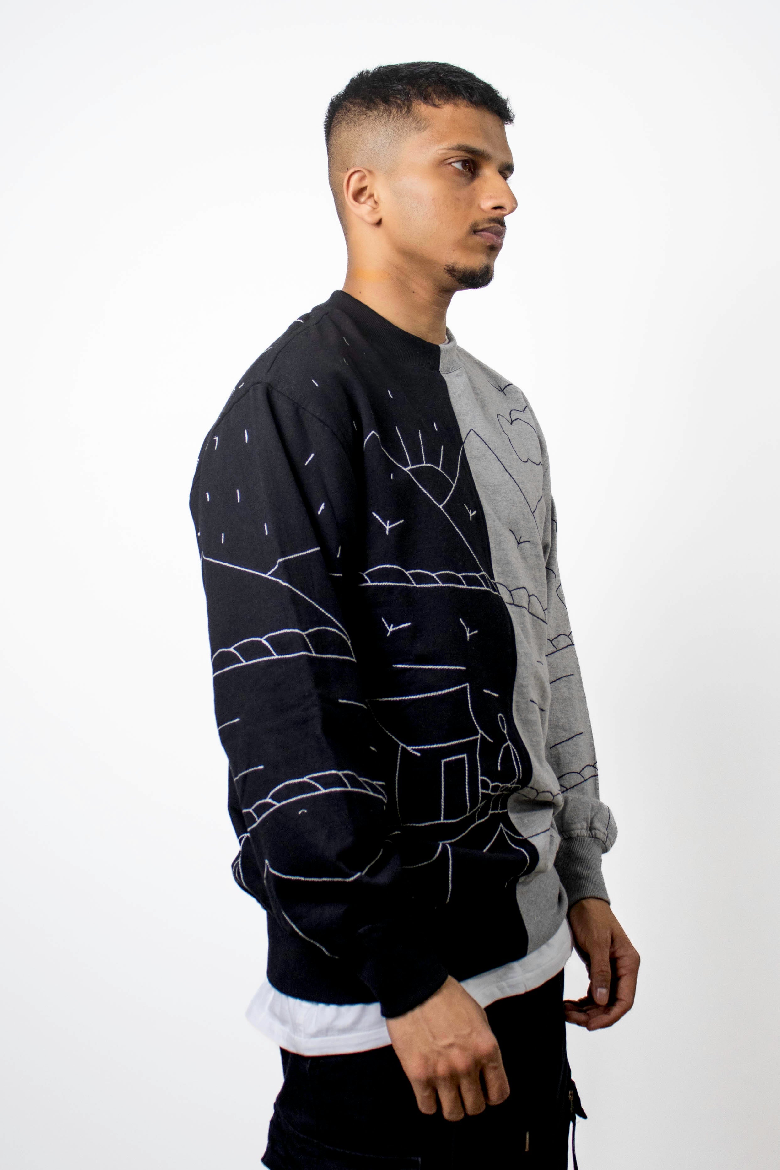 The childlike sweatshirt is a nostalgic walk through the childhood art & craft classes. The pointy mountains, doodle trees, clouds and houses all come together to mesmerize you how time flies. The detailing is hand embroidered using contrast threads making it equally unique and long lasting