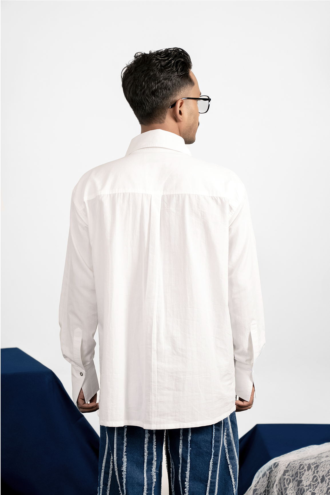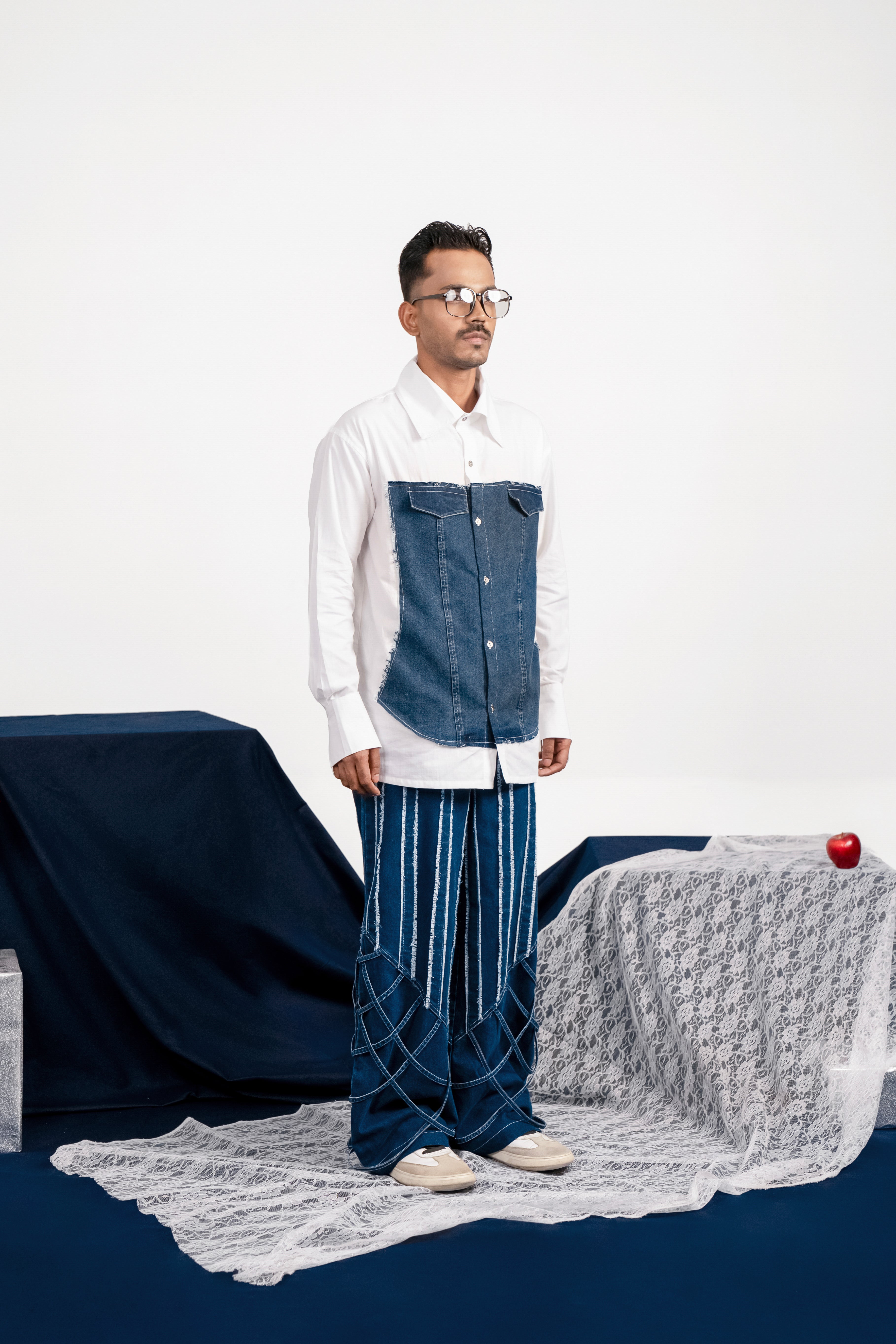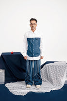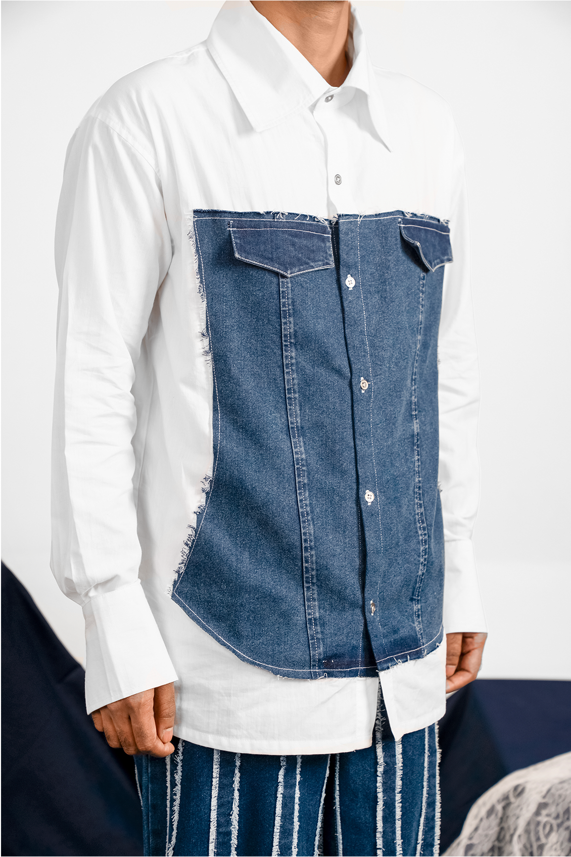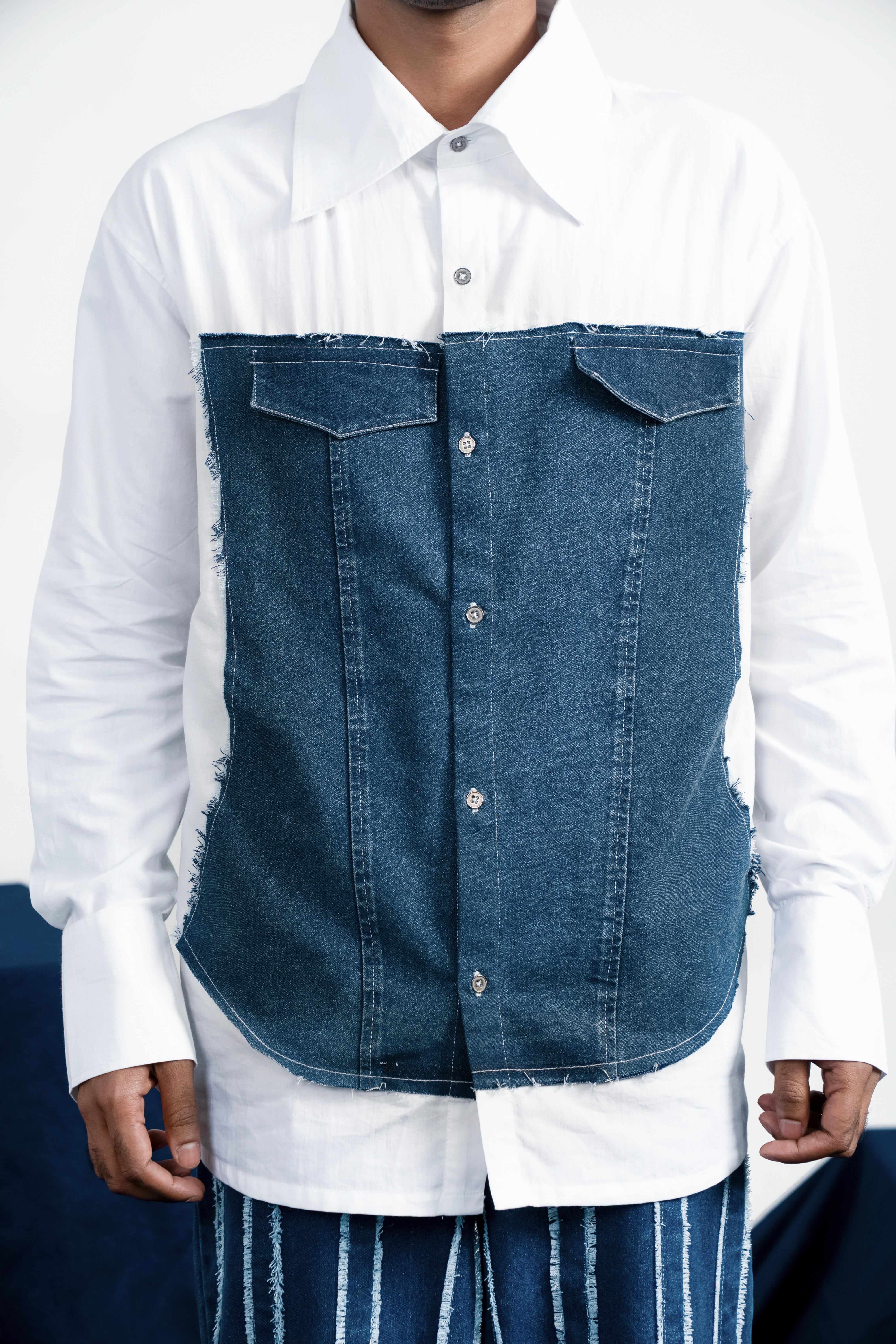 Corset and armour breastplate inspired denim patch at the front. This full sleeved shirt crafted from light and breathable cotton poplin along with denim. With faux pocket flaps on the chest, the denim panel is has raw frayed edges. Finished with metal buttons on the front placket and on the wide cuffs.