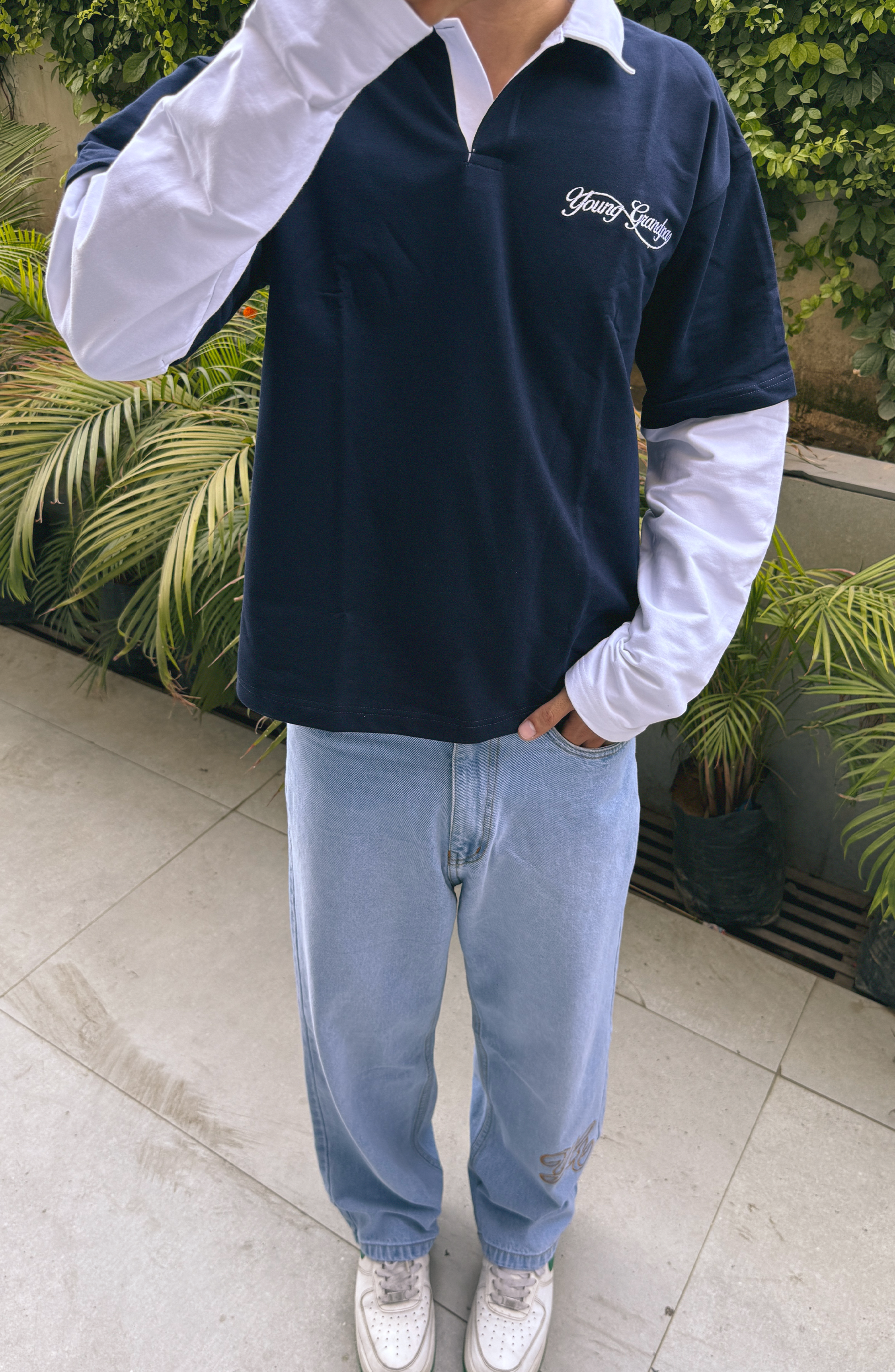 Tonal, timeless, and made to move. The Long Sleeves Navy Tee keeps things sharp yet laidback with its deep hue and easy fit, while the Western Blue Denim Pants bring old-town attitude with modern tailoring.