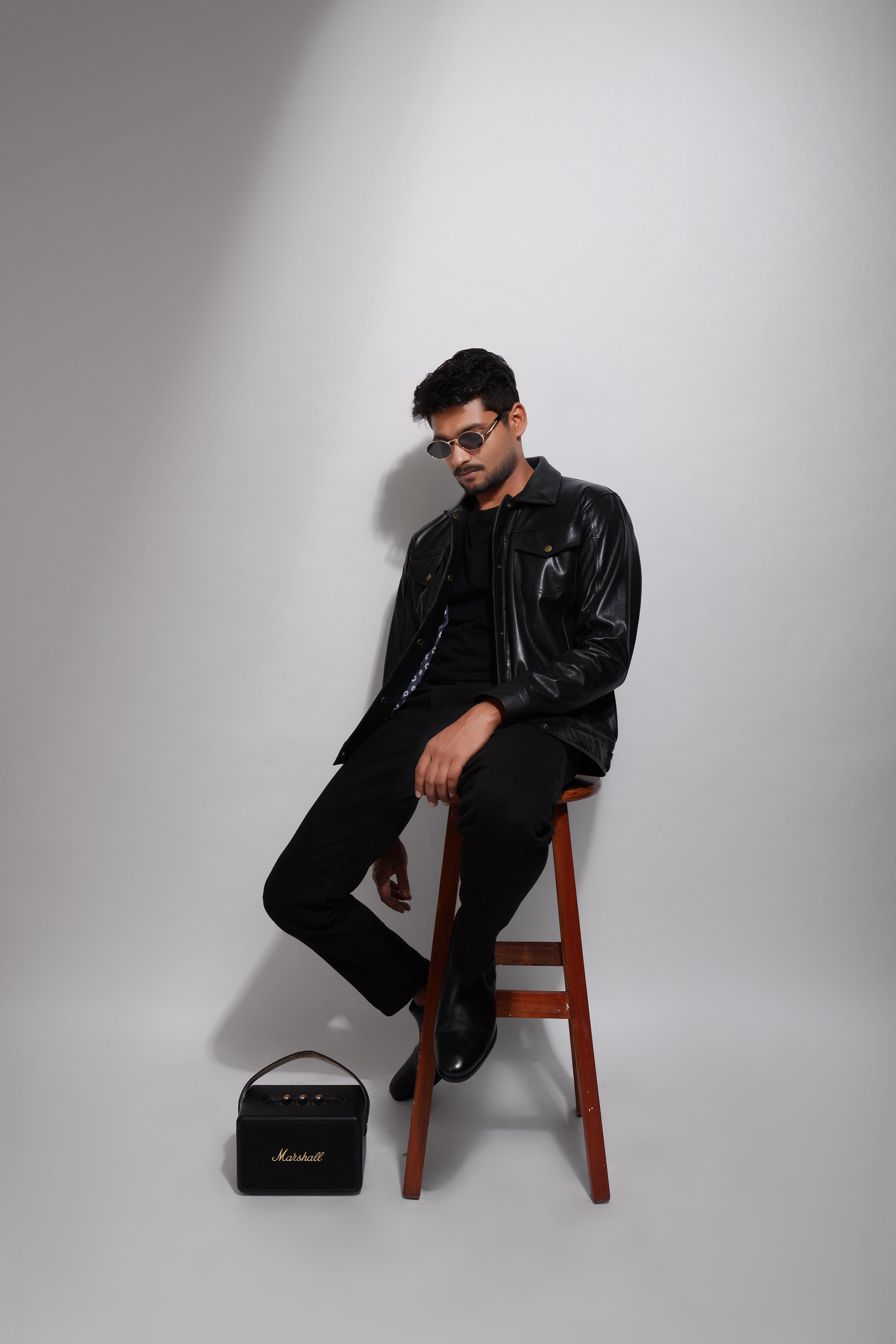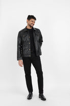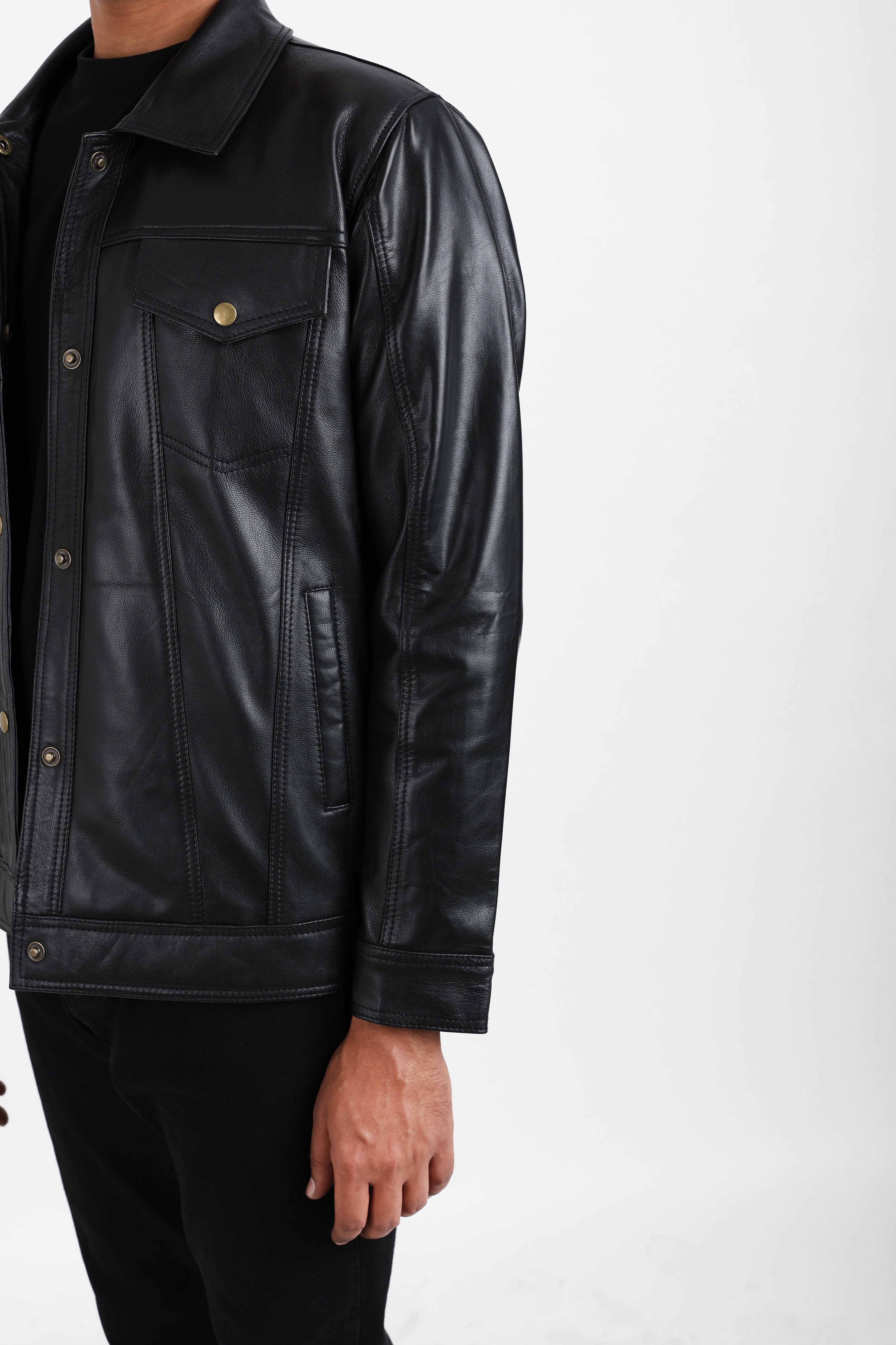 Elevate your wardrobe with this timeless black leather jacket, meticulously crafted from 100% full-grain leather. The spread collar offers a clean, structured neckline, while the snap button closure ensures a sleek, minimalist silhouette. Inside, the polyester lining provides comfort and ease of movement.