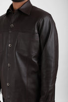 Crafted from 100% full-grain leather, this chocolate brown shacket offers a sophisticated take on the classic shirt-jacket hybrid. The spread collar and button closure provide a clean, structured look, while the polyester lining ensures comfort and ease of movement.