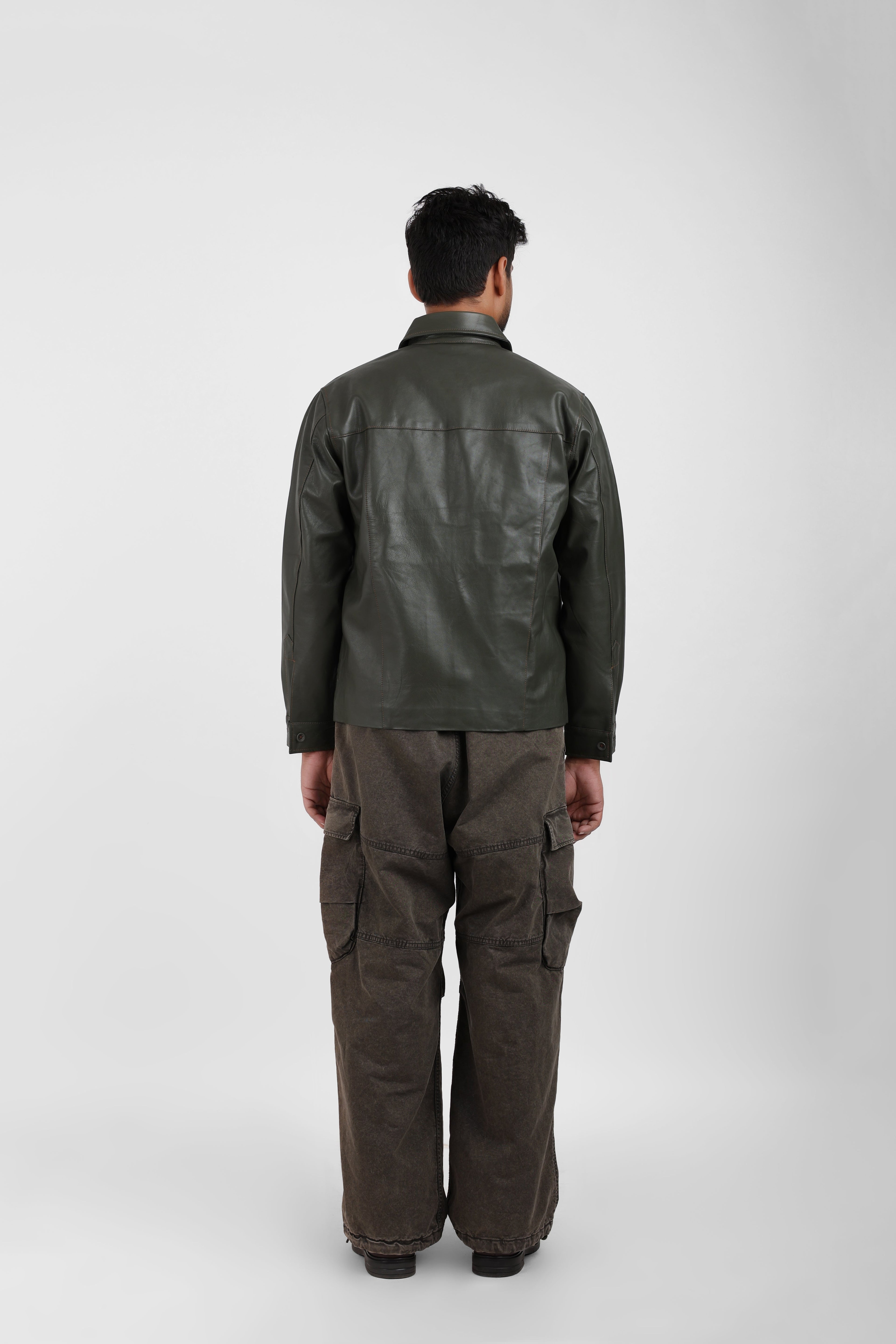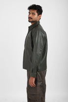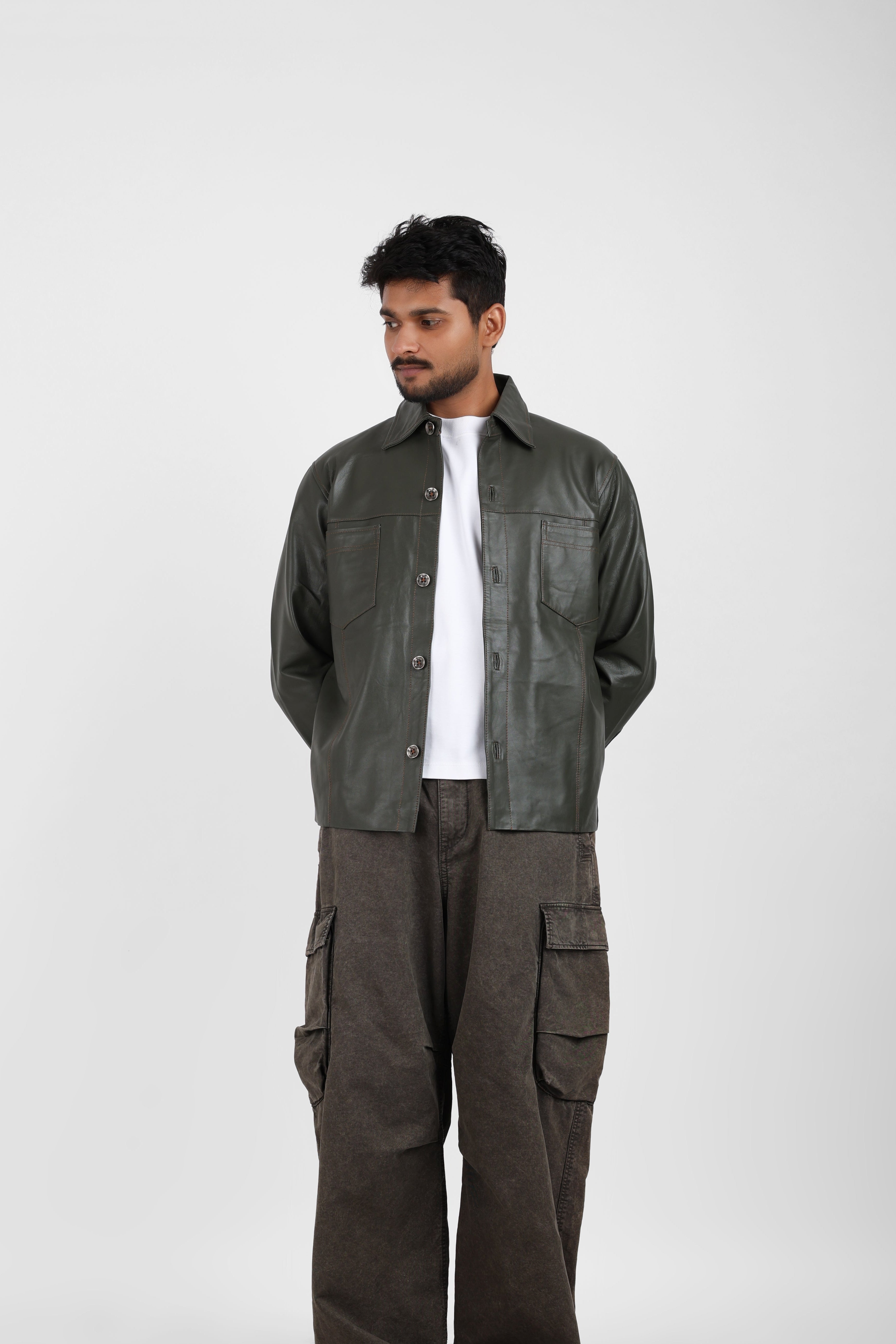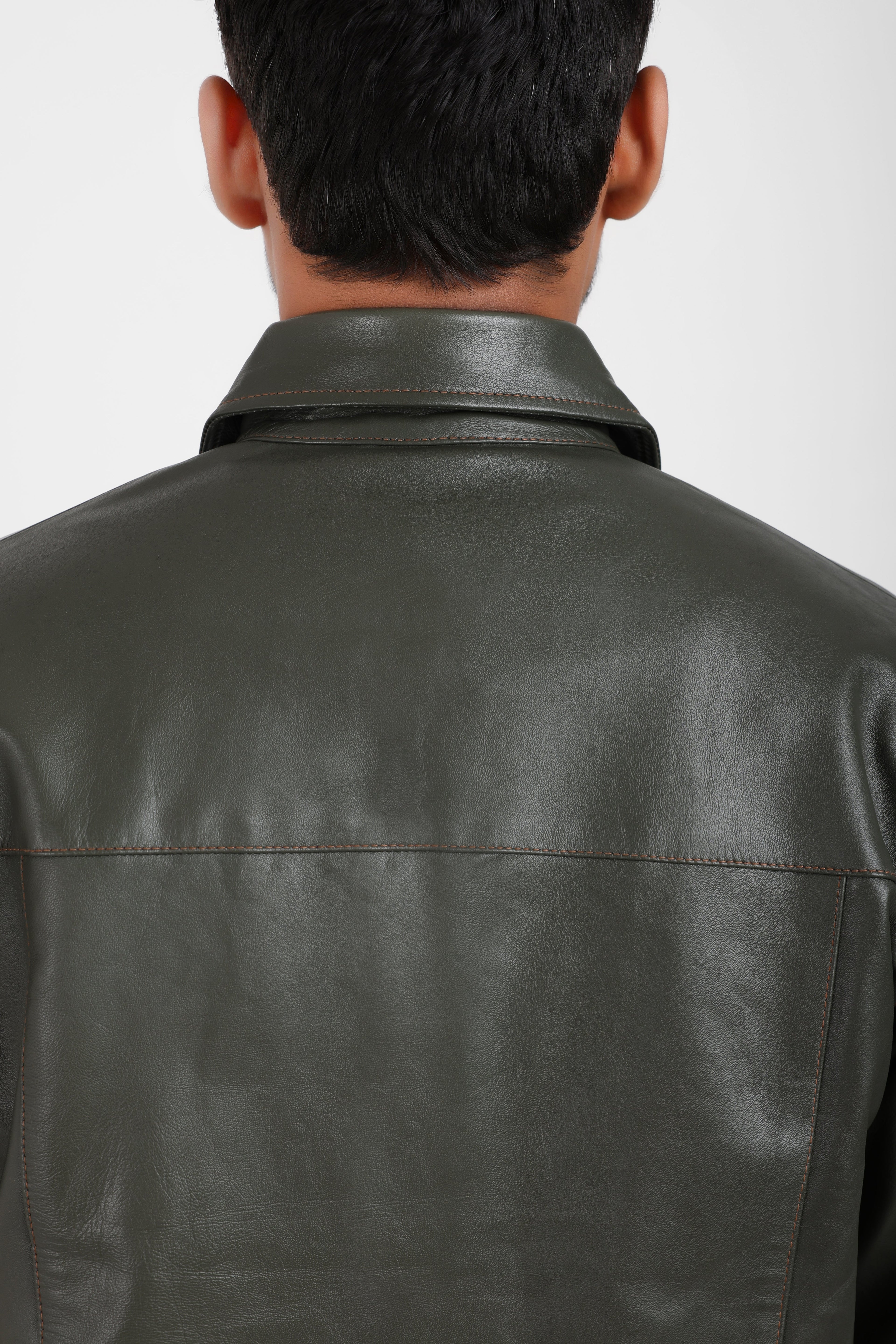 Crafted from 100% full-grain leather, this olive green shacket blends the rugged charm of a jacket with the lightweight versatility of a shirt. The spread collar and button closure offer a clean, structured look, while the polyester lining ensures comfort and ease of movement.