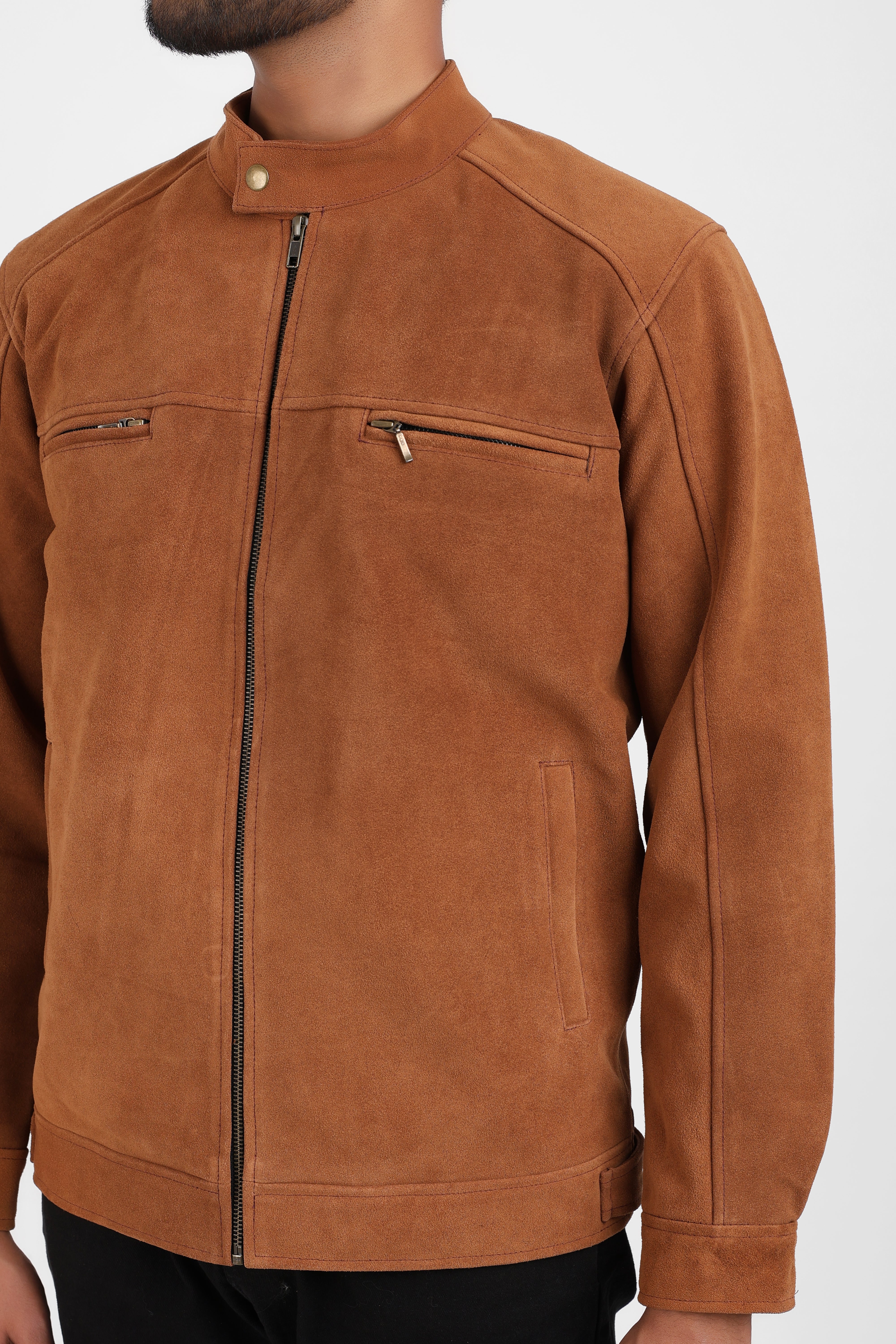 Crafted from 100% supple suede leather, this jacket in a warm tan tone is the perfect combination of elegance and edge. The clean mandarin collar with snap-button closure adds a modern touch, while the metal zip ensures a streamlined silhouette. A smooth polyester lining provides comfort and easy layering.